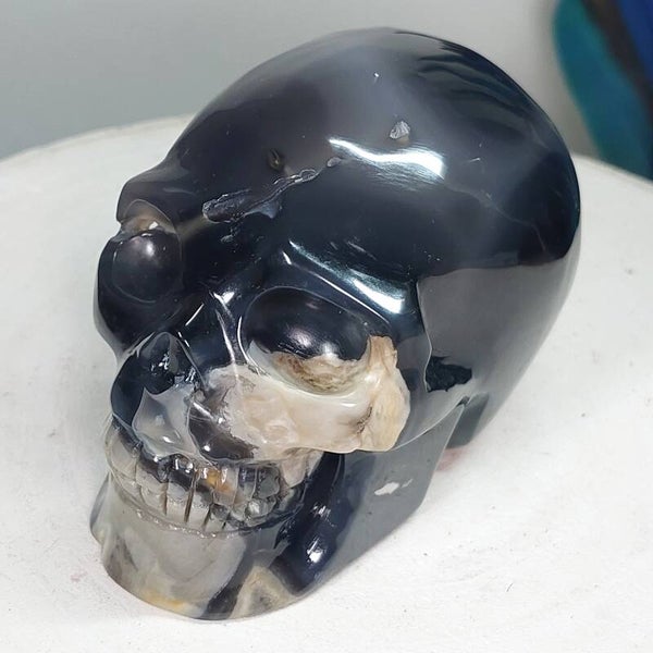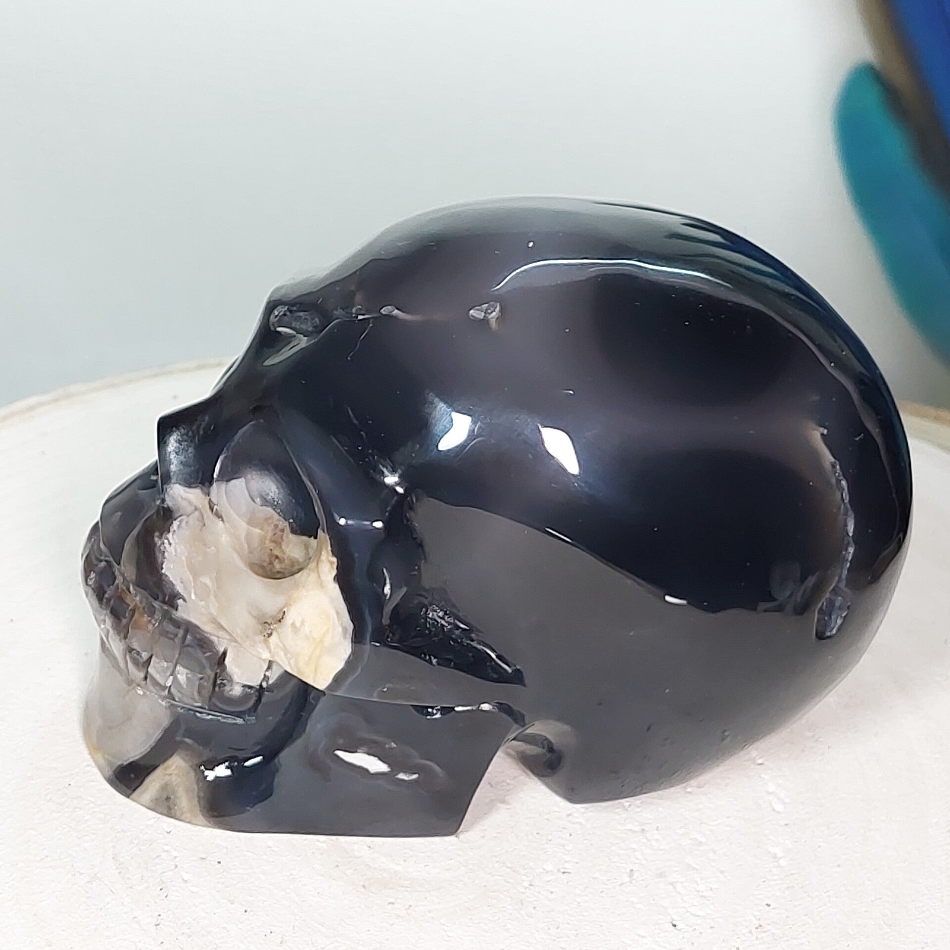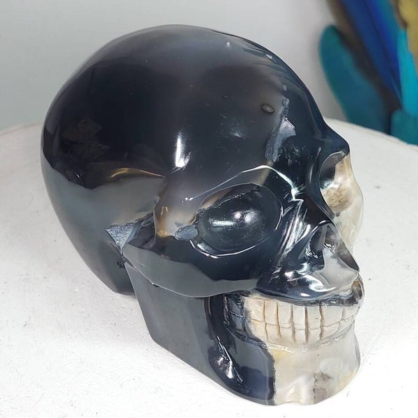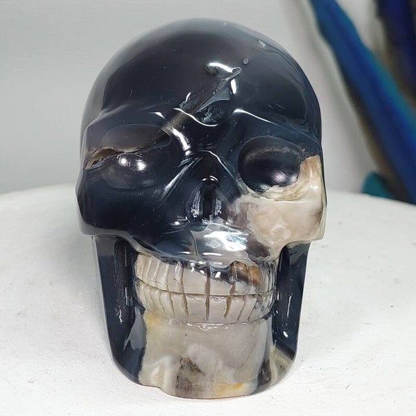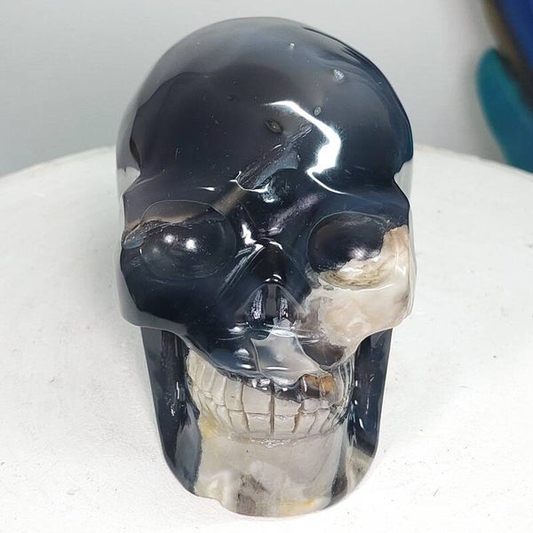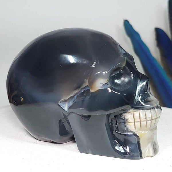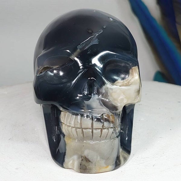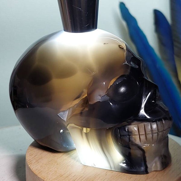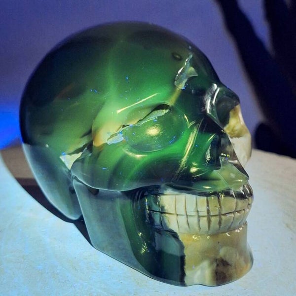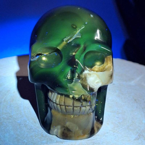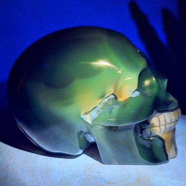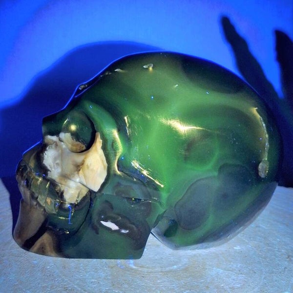 Vulkaan Agaat Schedel / Skull met sterke fluoriserende uv reactie onder uv 365 golflengte. Deze prachtige Vulkaan Agaat reageert groen kleurig op 365nm uv licht wat een prachtig "magisch" mooi effect geeft in het donker. Je krijgt een zaklampje met deze golflengte erbij zodat je meteen van het bijzondere effect kan genieten. Als er gebruik wordt gemaakt van een sterkere uv lamp dan zal het effect nog intenser zijn. Deze mooie grote skull is 775 gram en 11,6cm . Een bijzonder exemplaar. De fluoriserende eigenschap van onze schatten van Moeder Aarde zijn uiteraard 100% natuurlijk. De skull lijkt op sommige delen zwart te zijn, dit is echter niet het geval, er zijn daarom een aantal foto's gemaakt met een lichtbron tegen de Skull aan waardoor nog meer zichtbaar wordt wat voor bijzondere schoonheid deze skull is.