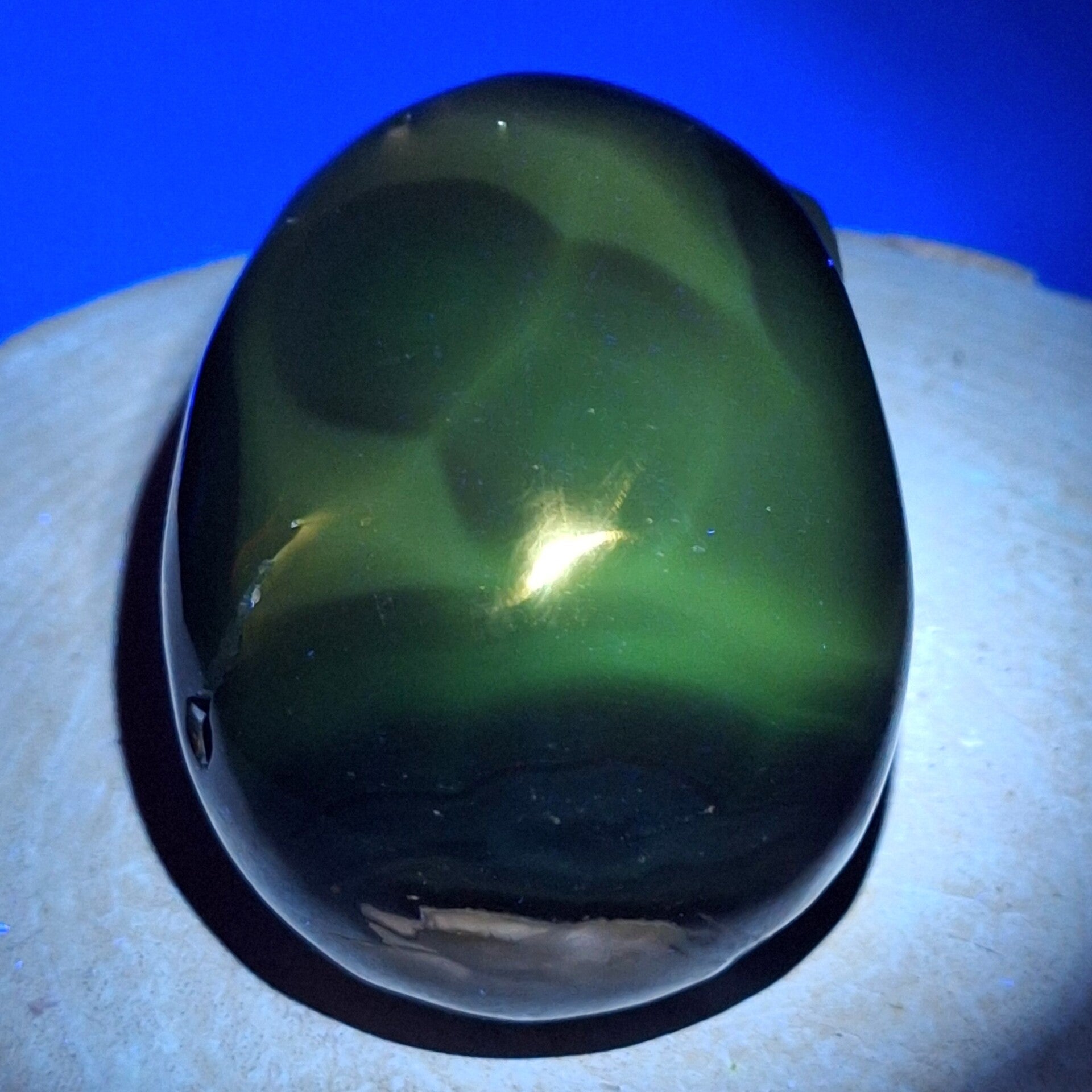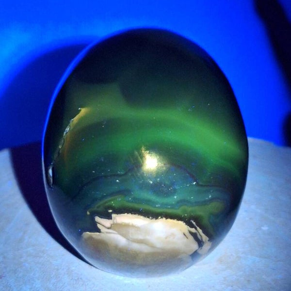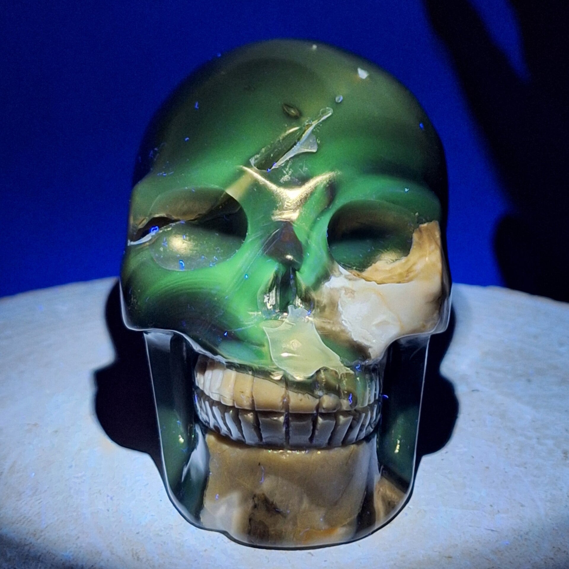Vulkaan Agaat met sterke fluoriserende uv 365nm reactie waarbij de skull groen wordt.