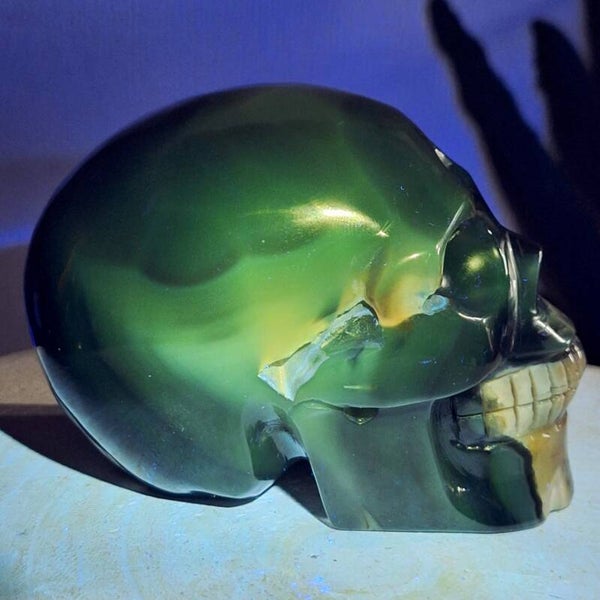 Deze Skull is uv reactief en dat betekend dat ze onder uv licht van kleur veranderd. Dit is een wonderlijke, magisch mooie eigenschap die sommige edelstenen en mineralen hebben. De benaming "uv reactief" klinkt misschien wat chemisch maar dat is het niet, het is puur natuur en absoluut niet giftig dus geen zorgen, je kunt op en top genieten van deze prachtige schat van Moeder Aarde. ♡