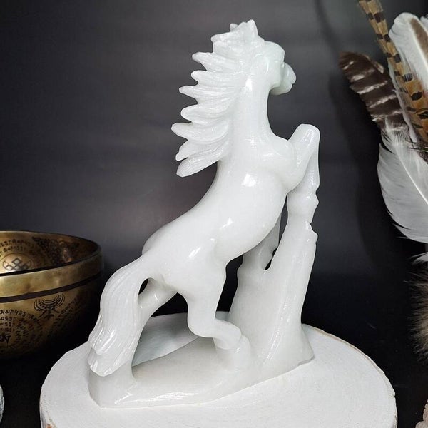 Witte jade is de edelsteen van emotionele healing. De steen geeft nieuwe hoop en vertrouwen, en helpt om oud zeer en blokkades los te laten Witte Jade zorgt ervoor dat de energetische koorden die tussen jou en andere personen zijn ontstaan, worden gereinigd en waar nodig worden losgemaakt, zodat je vrijwel direct terug komt te staan in jouw eigen kracht. Het helpt je om de gezondere keuzes voor jezelf te maken, zonder teveel te piekeren. Witte Jade zorgt voor een optimale energetische doorstroming van de kosmos, door de kruinchakra, langs de ruggengraat de aarde in. Een perfecte reinigende werking waar je heerlijk rustig van kunt worden in tijden van stress. Aangezien Jade wat vettig/mat aanvoelt en deze witte variant meer gevoelig is om vies te worden door o.a stof is er een dun laklaagje over het paard gespoten zodat stof er makkelijk afgepoetst kan worden en het paard wat glans krijgt. Witte Jade is geologisch gezien geen echte witte jade. De steen is het meest waarschijnlijk een marmersoort met kwarts.