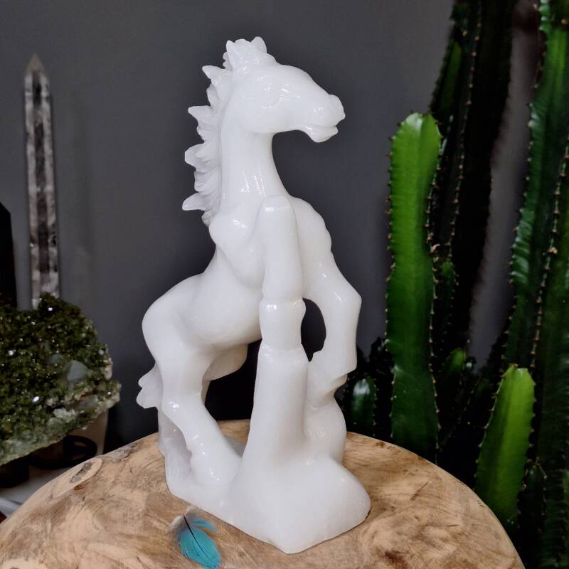 Witte jade is de edelsteen van emotionele healing. De steen geeft nieuwe hoop en vertrouwen, en helpt om oud zeer en blokkades los te laten Witte Jade zorgt ervoor dat de energetische koorden die tussen jou en andere personen zijn ontstaan, worden gereinigd en waar nodig worden losgemaakt, zodat je vrijwel direct terug komt te staan in jouw eigen kracht. Het helpt je om de gezondere keuzes voor jezelf te maken, zonder teveel te piekeren. Witte Jade zorgt voor een optimale energetische doorstroming van de kosmos, door de kruinchakra, langs de ruggengraat de aarde in. Een perfecte reinigende werking waar je heerlijk rustig van kunt worden in tijden van stress. Aangezien Jade wat vettig/mat aanvoelt en deze witte variant meer gevoelig is om vies te worden door o.a stof is er een dun laklaagje over het paard gespoten zodat stof er makkelijk afgepoetst kan worden en het paard wat glans krijgt. Witte Jade is geologisch gezien geen echte witte jade. De steen is het meest waarschijnlijk een marmersoort met kwarts.