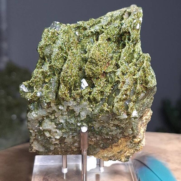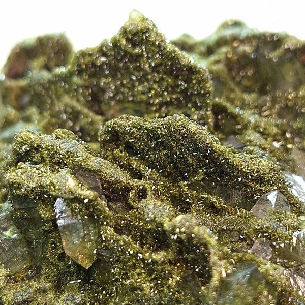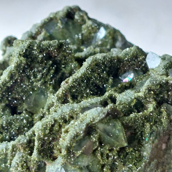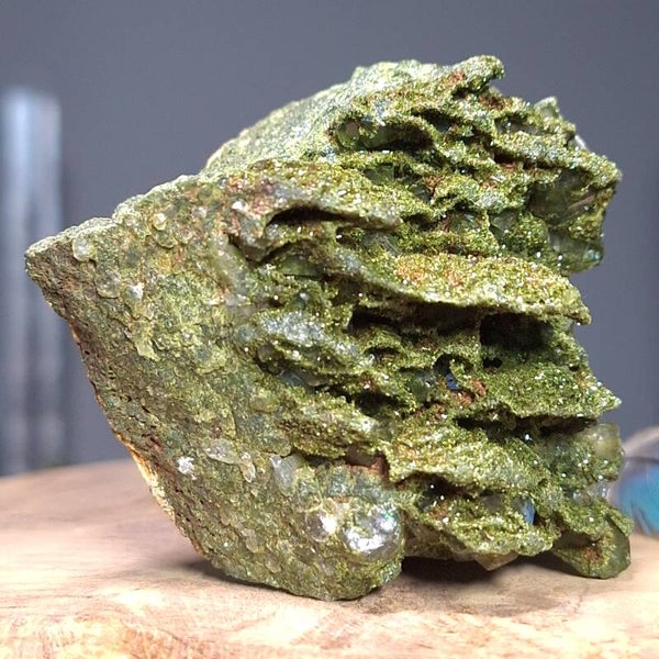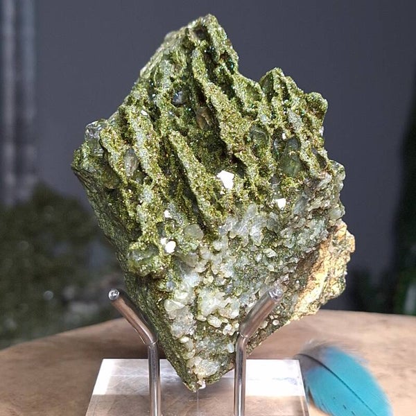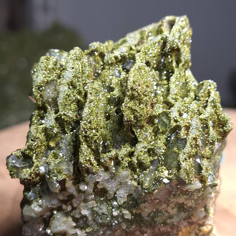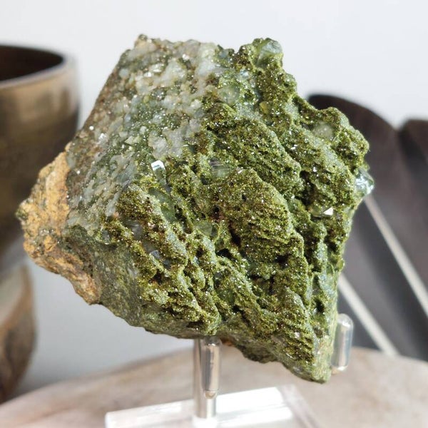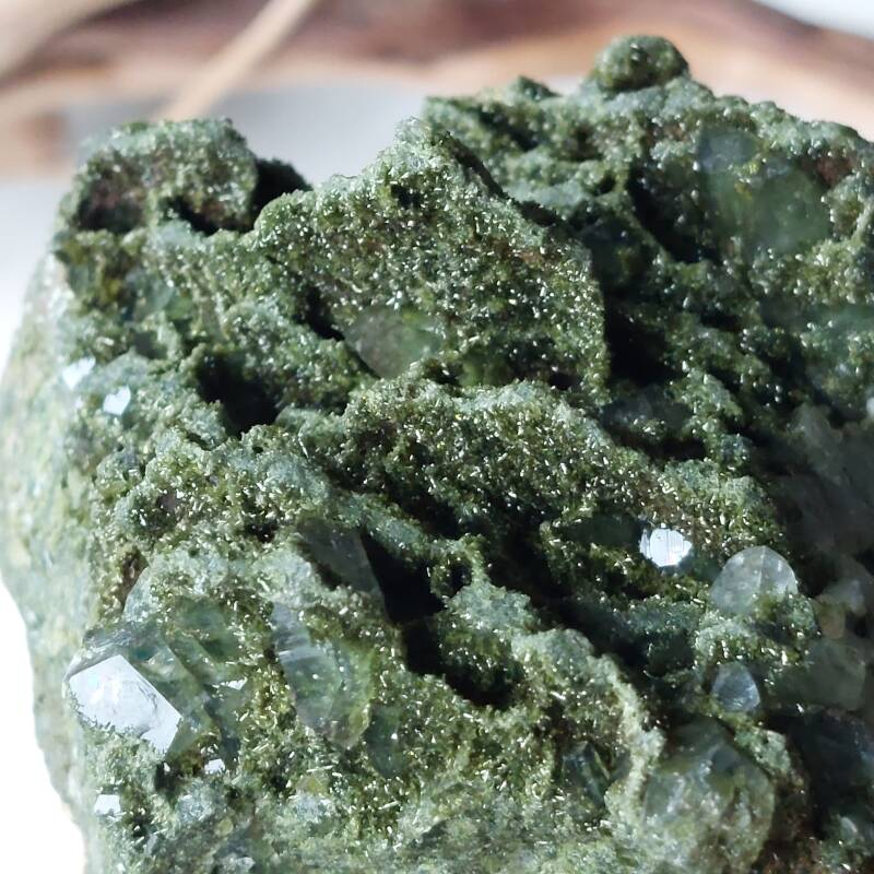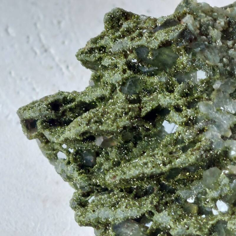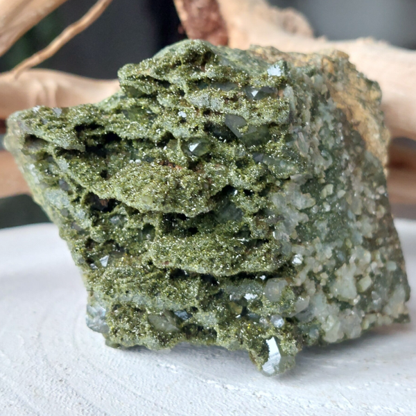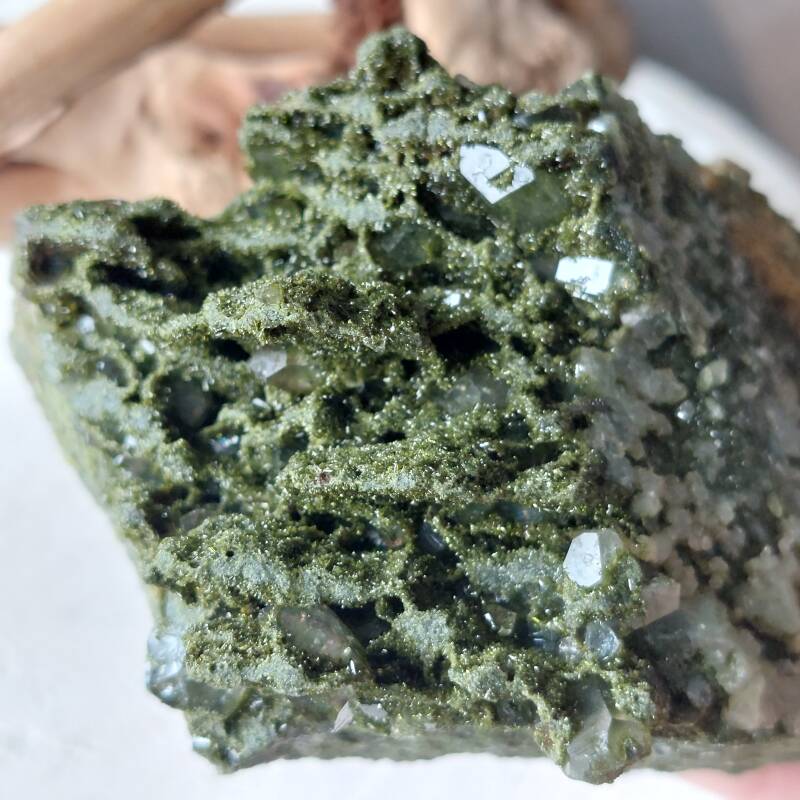 Forest epidoot, een diepgroene variant van het epidootmineraal, gecombineerd met kwartskristallen, is slechts op één plek ter wereld te vinden: het Hakkari-gebergte in Turkije. Er wordt aangenomen dat forest epidoot de energieën van andere stenen en omgevingen verbetert, waardoor het een waardevol hulpmiddel is bij kristalgenezing en energiewerk. Door de positieve trillingen te verhogen, helpt forest epidoot negatieve energieën op te ruimen en te vervangen door heilzame energieën. Er wordt gezegd dat dit versterkingseffect een meer harmonieuze en evenwichtige sfeer bevordert, wat vooral nuttig kan zijn in ruimtes die zijn gewijd aan meditatie of genezingspraktijken.