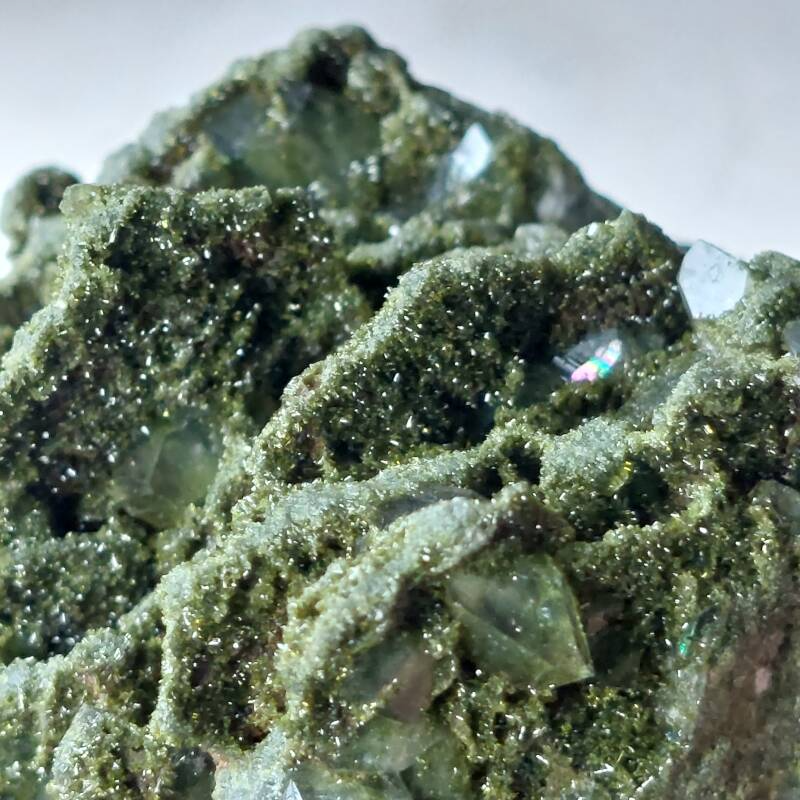 Prachtige Forest Epidote / Bos Epidoot cluster met enorm veel sprankeling uit Hakkari Turkije. Dit stuk is echt magisch mooi met haar prachtige lagen sprankelende Epidoot. Er zit veel diepte in dit stuk en ze is echt van top kwaliteit. Naast Epidoot bevat deze cluster ook prachtige heldere Bergkristal kristallen. De foto's zijn bij daglicht gemaakt buiten in de schaduw en een deel is binnen gemaakt met een lamp als lichtbron. Zo zie je dat de kleur heel divers kan zijn. Mooi als aanvulling op ieder interieur voor o.a thuis, praktijk, salon, kantoor etc. Extra sprankelend als het zonnetje of een andere lichtbron er op schijnt. Laat je verwonderen door de schoonheid en de heerlijke energie van deze schat van Moeder Aarde. Echt een prachtstuk van top kwaliteit. 8,2x7,2cm.