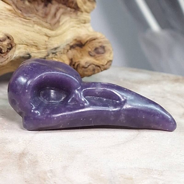 Lepidoliet Ravenskull. Deze schedel van de Raaf is prachtig paars van kleur. Een hele mooie verschijning met heerlijke energie. De skull is 6 cm, ideaal formaat om vast te houden tijdens meditatie en om mee te nemen op reis. Op het nachtkastje kan deze mooie schat van Moeder Aarde ook bijdragen aan een betere nachtrust. Vogel schedel, bird skull