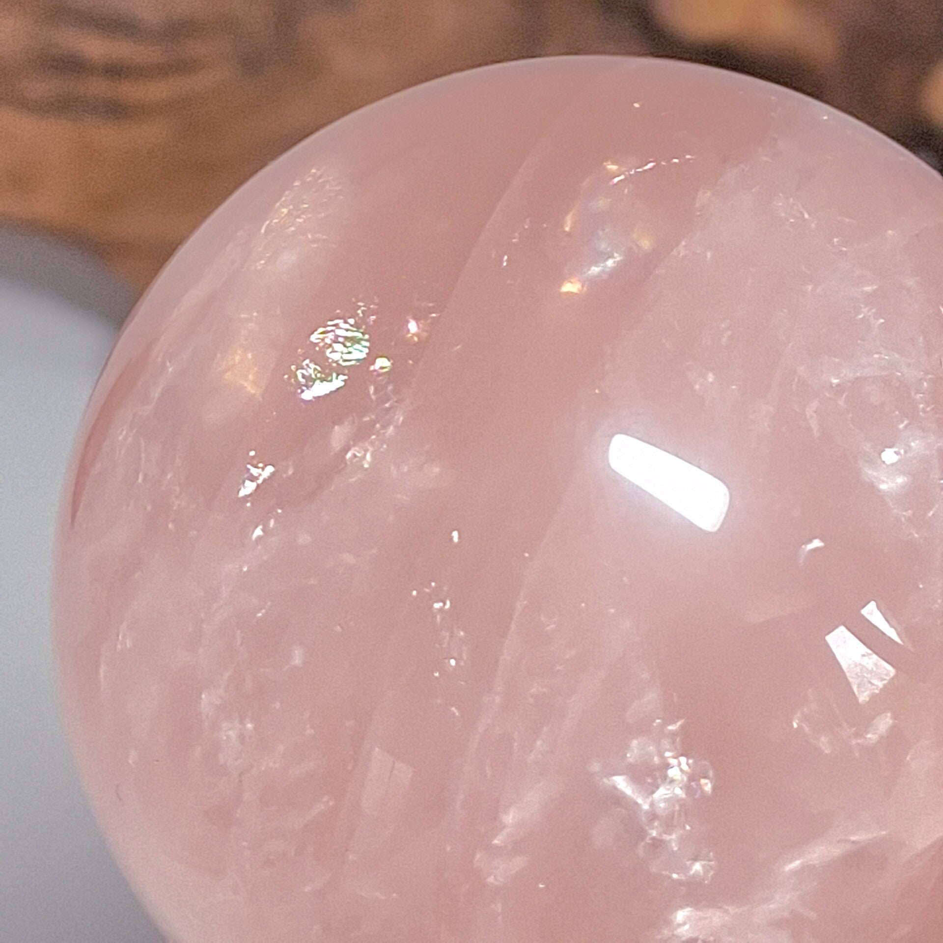 Deze prachtige rozekwarts bol van 6,6 cm heeft vele regenboogjes. Mooie kwaliteit Rozekwats. Bol wordt geleverd met houten ring om wegrollen te voorkomen.