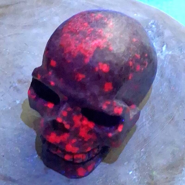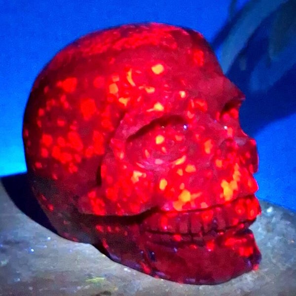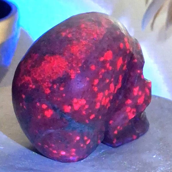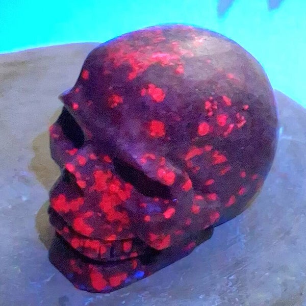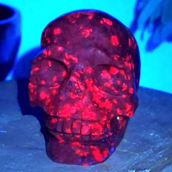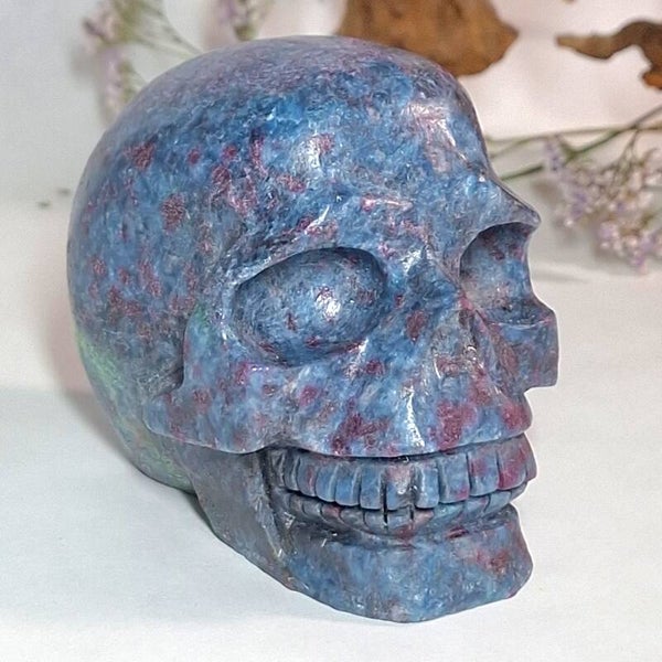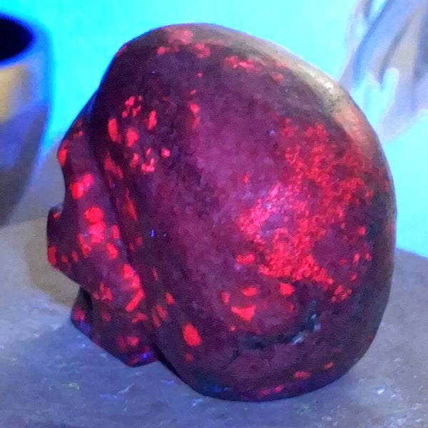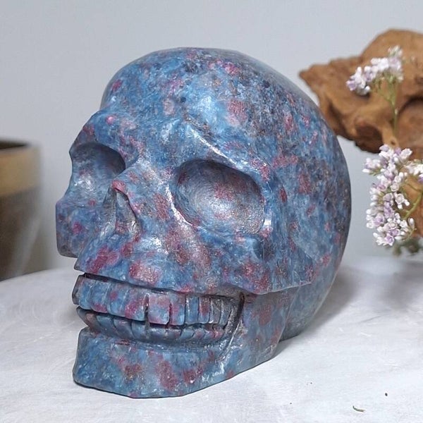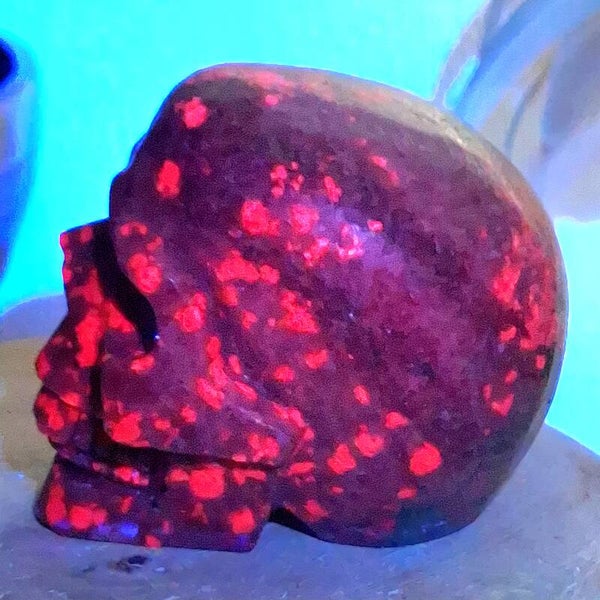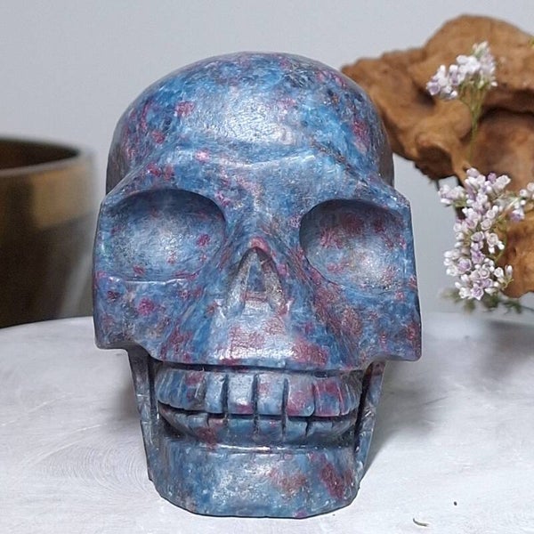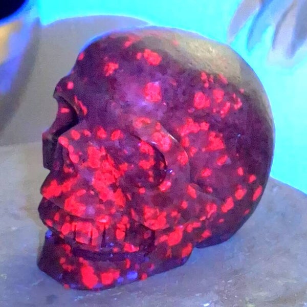 Robijn in kyaniet Skull. Prachtige uv reactieve schedel. Zeer bijzonder exemplaar.