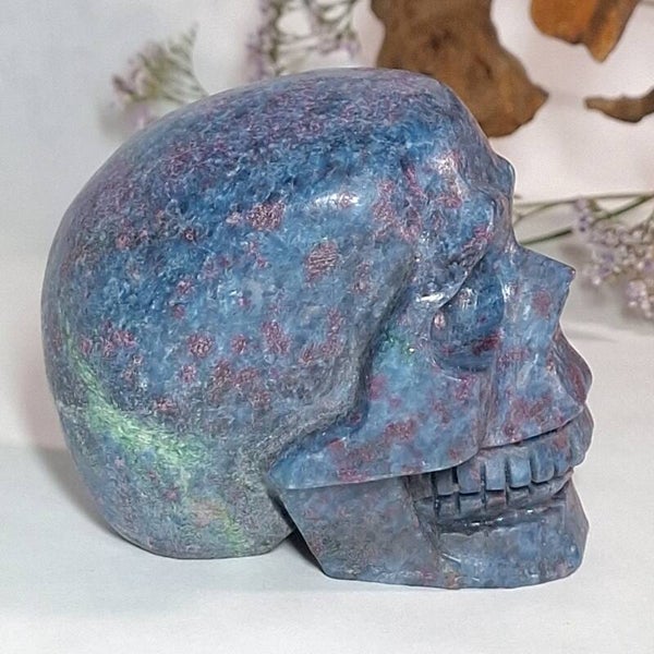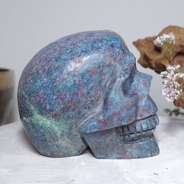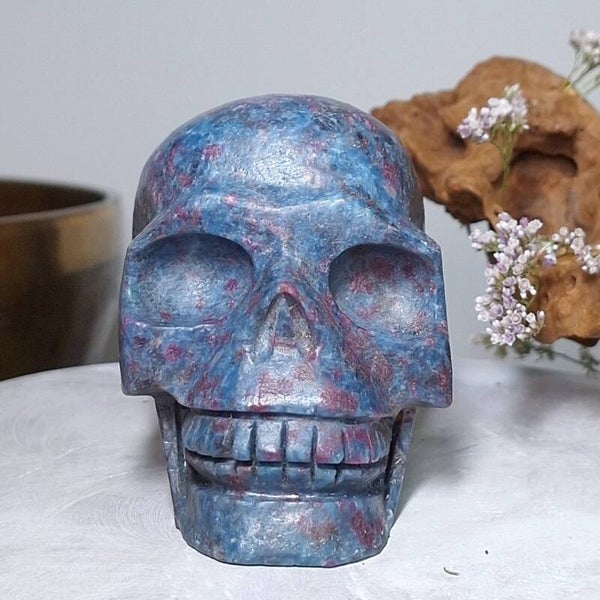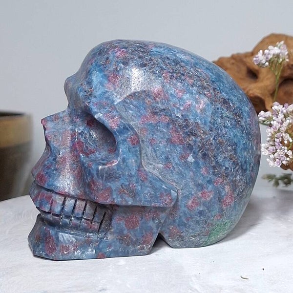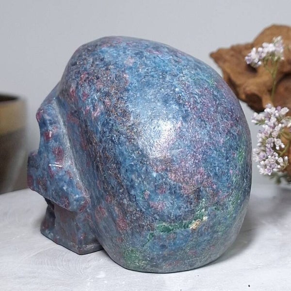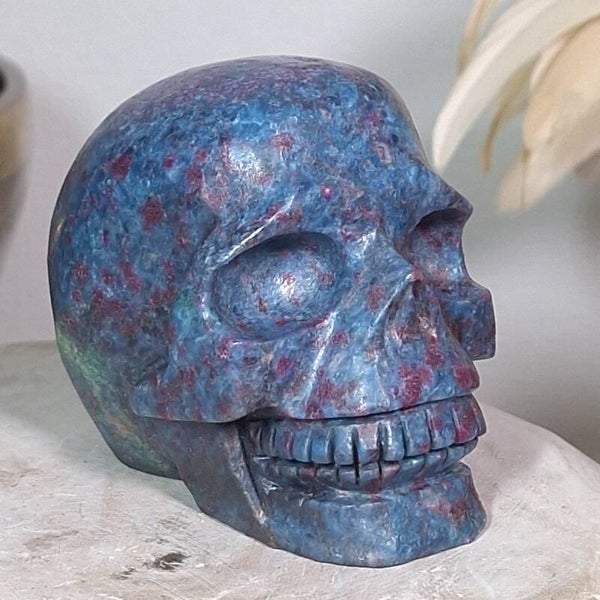 Robijn in Kyaniet handgeslepen Skull van c.a 9cm en 0.6kilo. Prachtige kwaliteit met intense kleuren. Er zit heel veel Robijn in deze fantastische schedel, het zijn de roze vlekjes die prachtig rood /oranje/roze oplichten bij diverse soorten uv licht. Dit vind ik zelf toch wel een hele bijzondere eigenschap, een stukje magie dat is gecreëerd door moeder aarde. Deze mooie schedel van Robijn in Kyaniet heeft ook een vleugje groene Fuchsiet, deze prachtige steen is afkomstig uit India met heerlijke energie.