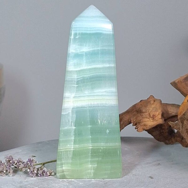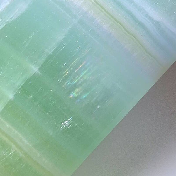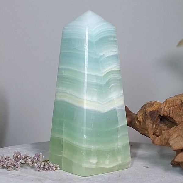 Pistache calciet , Caribbean blue Calciet toren van 9,6cm en 255 gram. Deze edelsteen / mineralen toren is van prachtige kwaliteit en heeft mooie regenboogjes. Ook wel zeegroene calciet of zeeschuim calciet genoemd, is een prachtige vorm van groene calciet, gevonden in Pakistan. Edelstenen, mineralen en kristallen als natuurlijke kunst. Spirituele krachtvoorwerpen van de schatten van Moeder Aarde. Mindful living met Home Deco van kunst uit de natuur. Aanvulling voor het interieur voor thuis, kantoor, praktijk en salon. Laat je verrassen door de positieve energie die de stenen uitstralen Of je nu zoekt naar balans, spiritualiteit of innerlijke rust, deze stenen helpen je op je persoonlijke pad te groeien. Daarnaast ook goed te gebruiken als edelsteentherapie voor o.a holistische, energetische praktijken. Als begeleiding tijdens ceremonies, meditatie, coaching sessies. Healing for the mind body and soul.