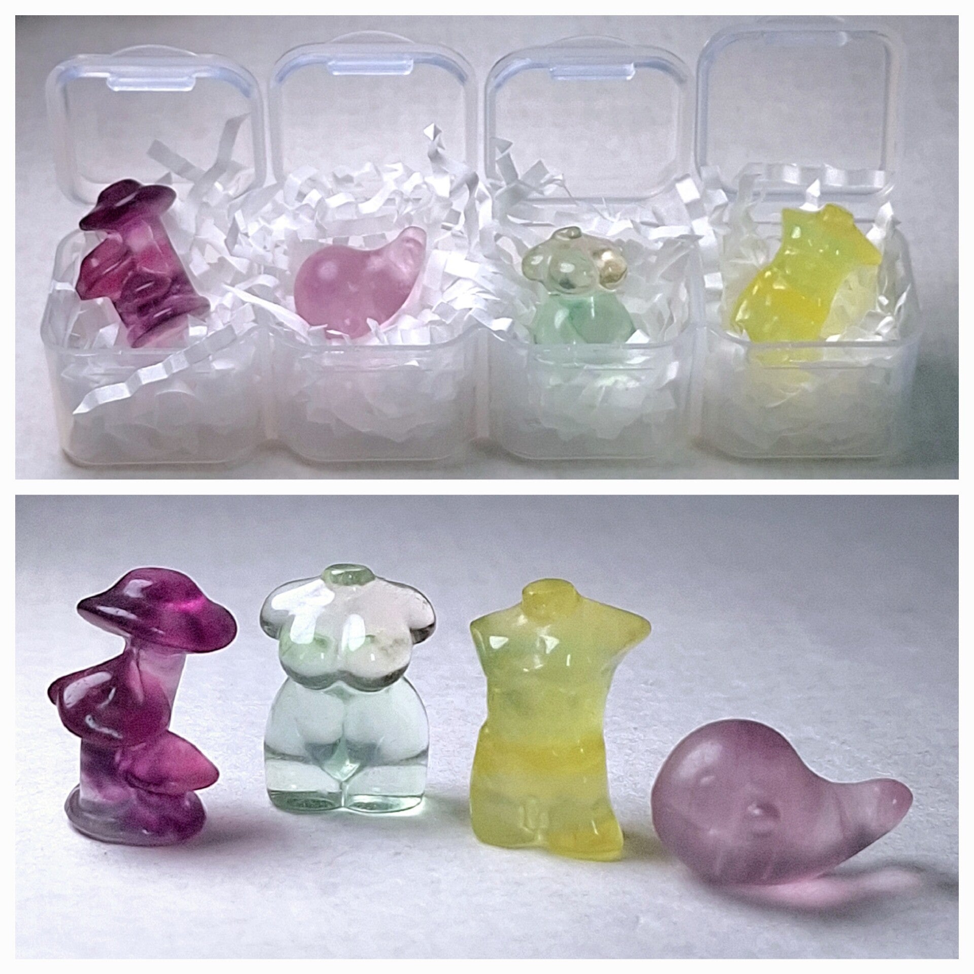Set van 4 Fluoriet crystal carvings. De schattige beeldjes zijn miniatuur formaat van c.a 2cm. Je krijgt de walvis, paddenstoelen, vrouwen body en mannen torso die op de foto's staan afgebeeld inclusief doosje.