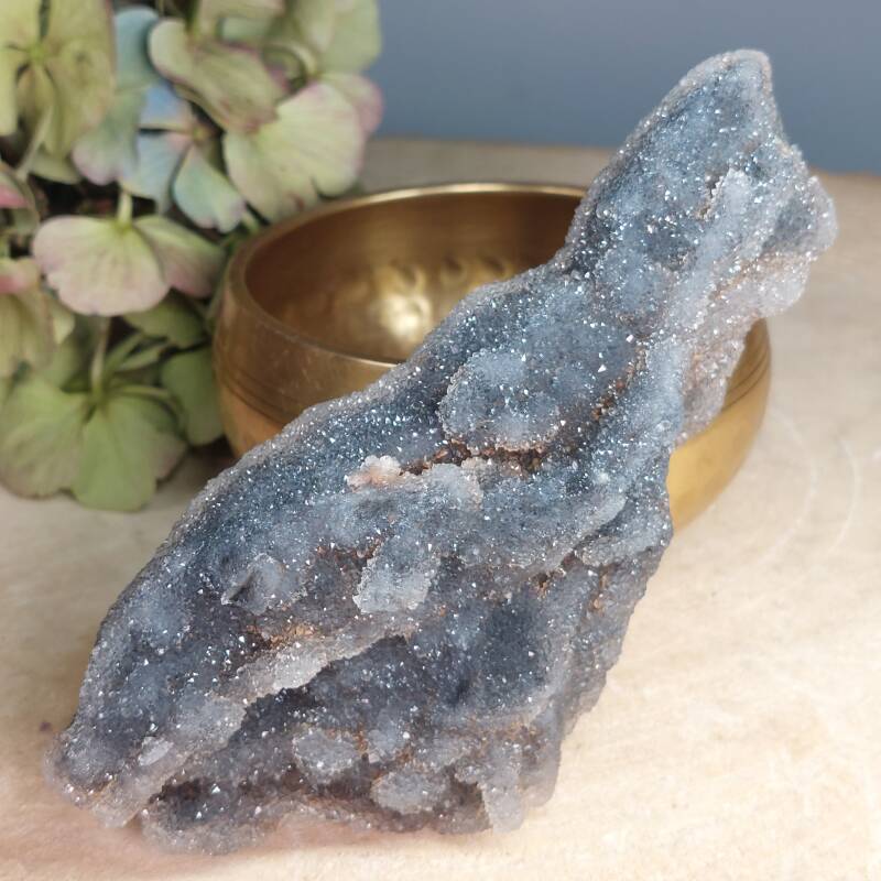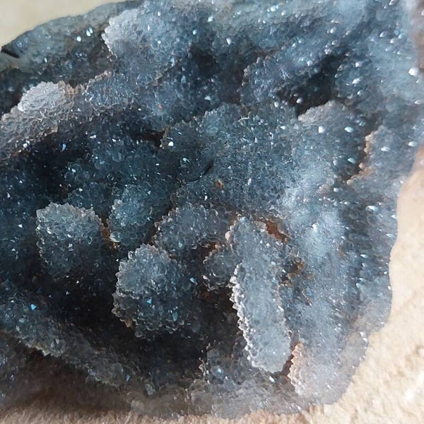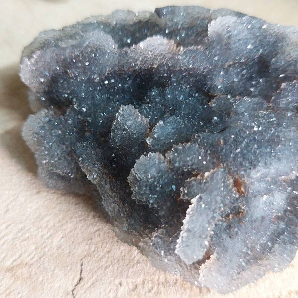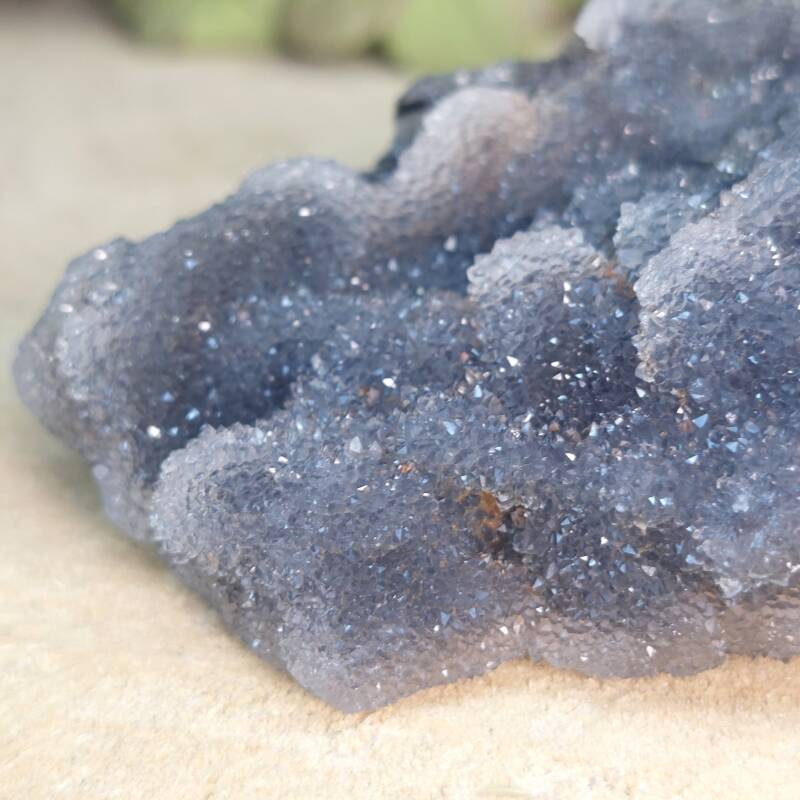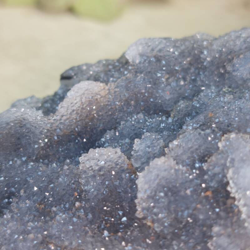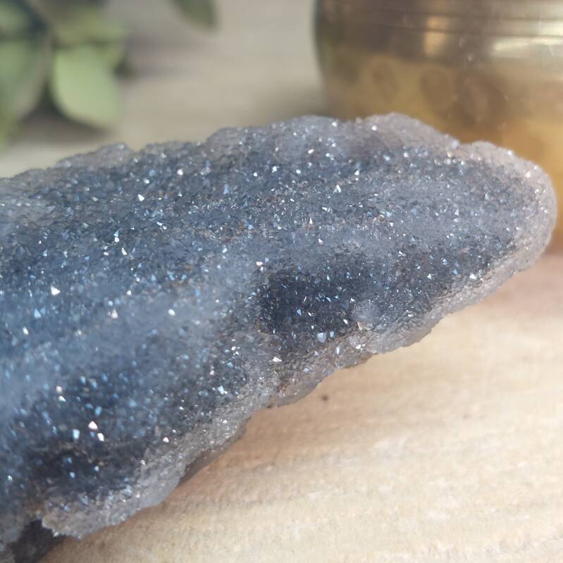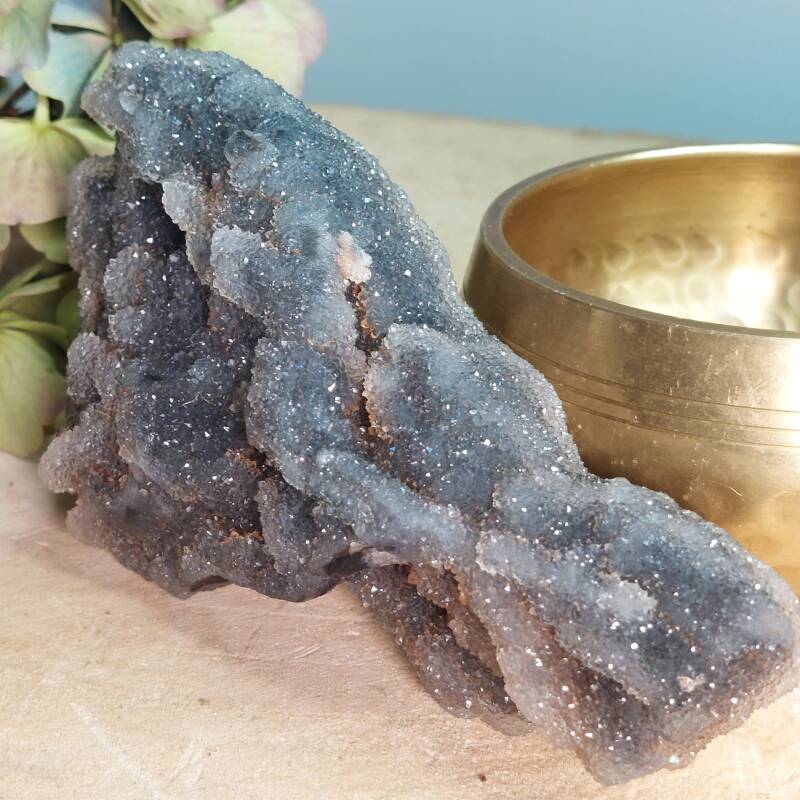 Prachtige stuk met zowel voor-achter- en zijkanten prachtige glinterende "druzy" kristalletjes op (waarschijnlijk) Chalcedoon. 12,2x6,2 cm. Op de foto's is de sprankeling helaas minder goed te zien maar in het echt zit dit prachtige stuk vol met glinsteringen. Ook savonds onder een lampje zal dit een ware eyecatcher zijn.