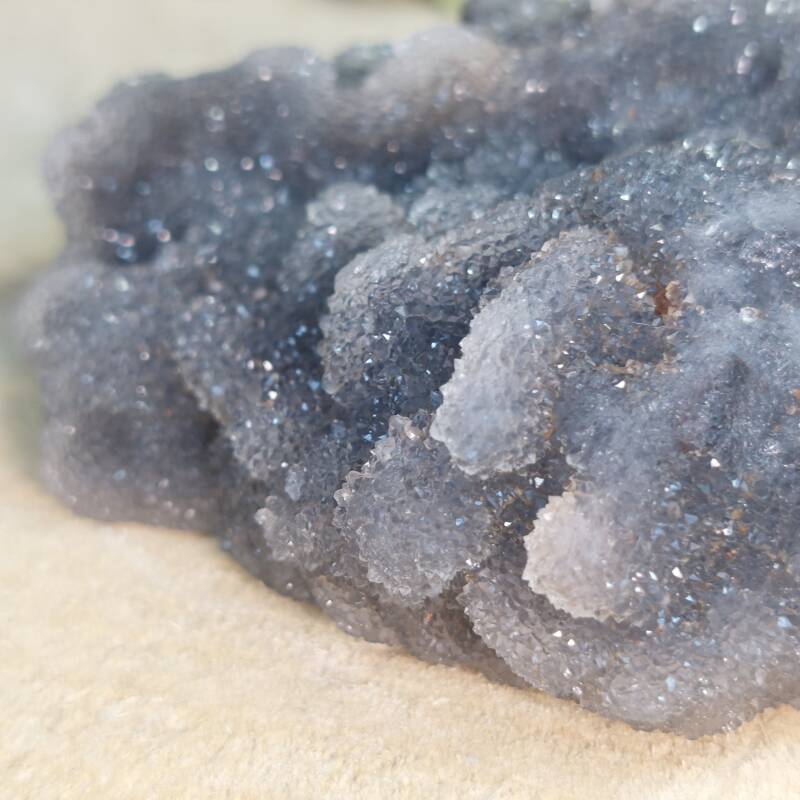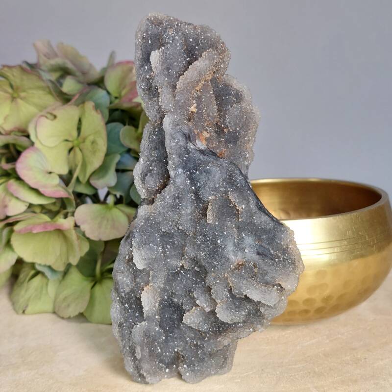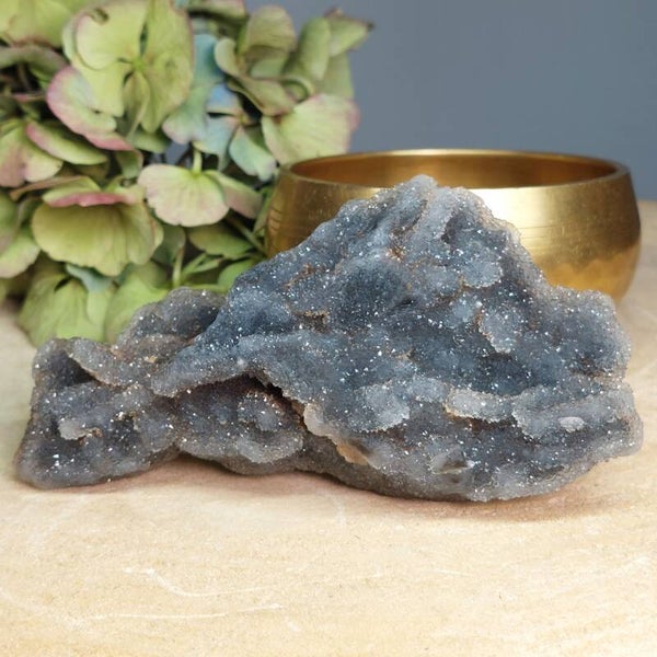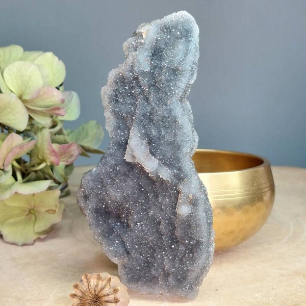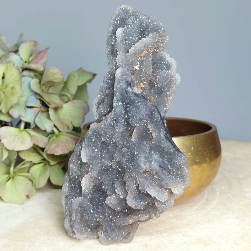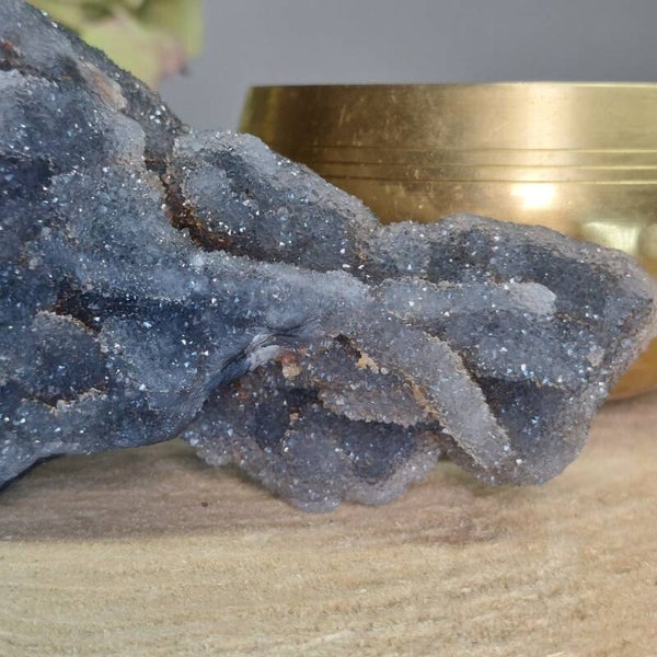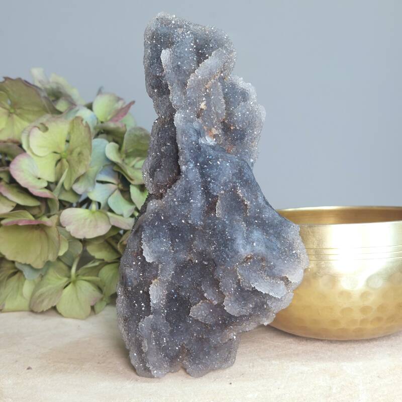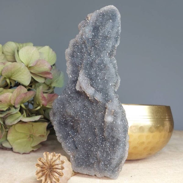 Prachtige stuk met zowel voor-achter- en zijkanten prachtige glinterende "druzy" kristalletjes op (waarschijnlijk) Chalcedoon. 12,2x6,2 cm. Op de foto's is de sprankeling helaas minder goed te zien maar in het echt zit dit prachtige stuk vol met glinsteringen. Ook savonds onder een lampje zal dit een ware eyecatcher zijn.