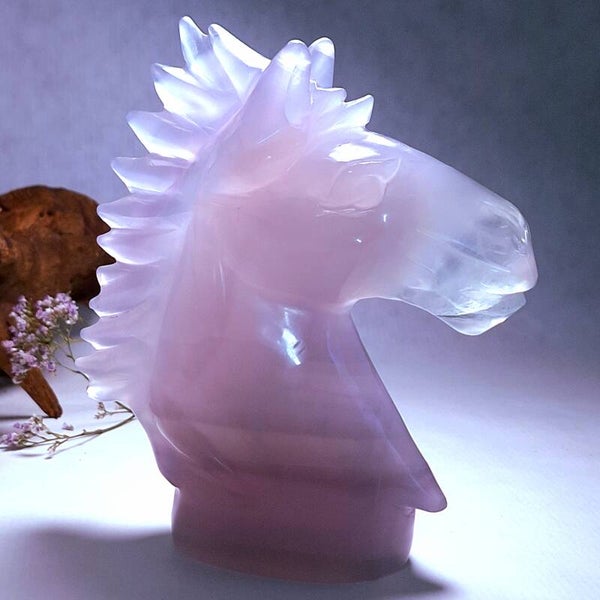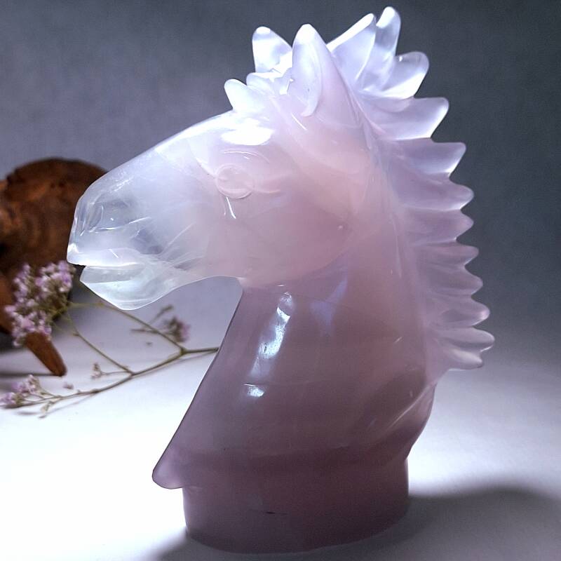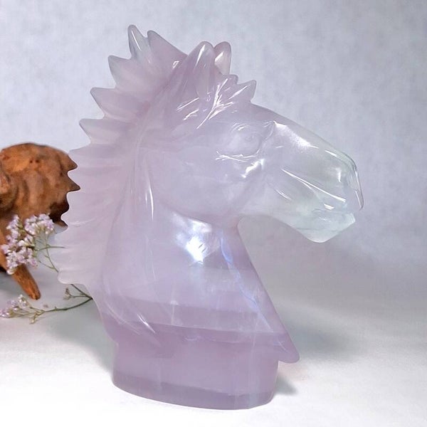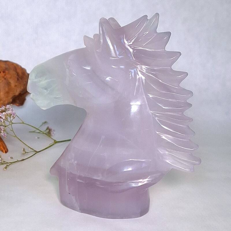 Prachtig groot handgeslepen Yttrium / Lavendel Fluoriet paard uit Brazilië. Ik wilde heel graag een carving van een realistisch paardenhoofd, je ziet vooral Eenhoorns wat ook prachtig is maar zonder hoorn was ik nog nooit een mooie carving tegengekomen. Deze schoonheid is daarom speciaal voor ons ontworpen en met de hand geslepen. Dit prachtige paard lijkt bij verschillende soorten lichtinval van kleur te veranderen, van zijde-achtige zachte lavendel kleur naar een wat transparanter lavendel tint met licht mintgroene snuit / mond. Deze Fluoriet reageert ook op UV licht wat dit paard extra magisch maakt. De foto's waarbij het paard blauw van kleur is zijn gemaakt met 365nm en 395nm UV licht. Een prachtig uniek exemplaar, we zijn bijzonder blij met de vormgeving, details en liefdevolle energie van deze beauty van 0,7 kilo en 14cm.