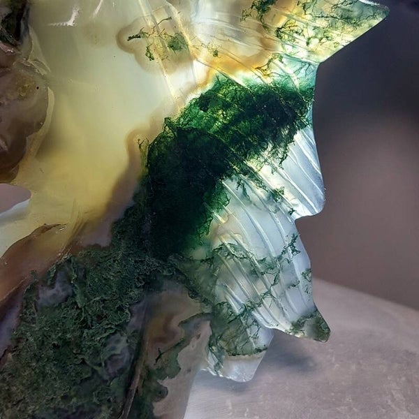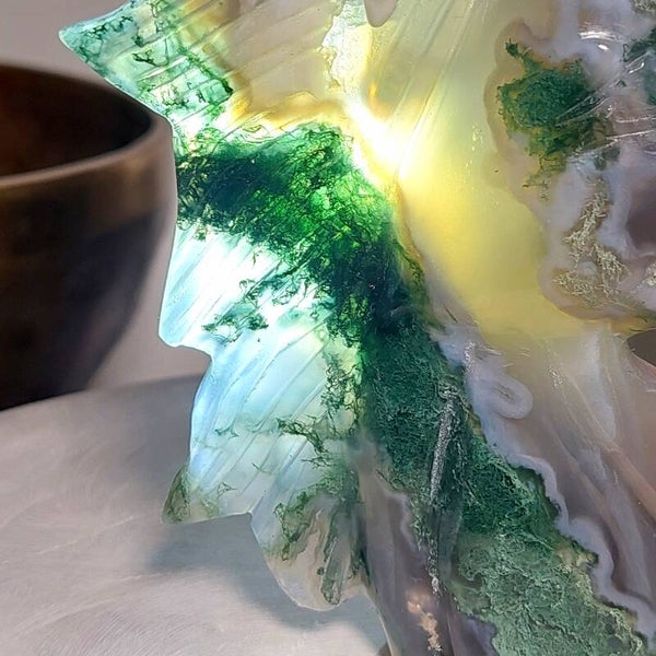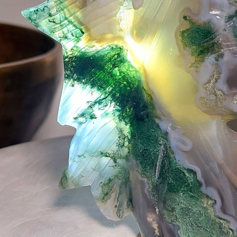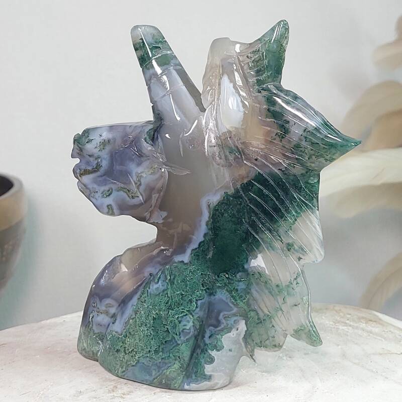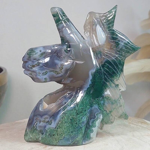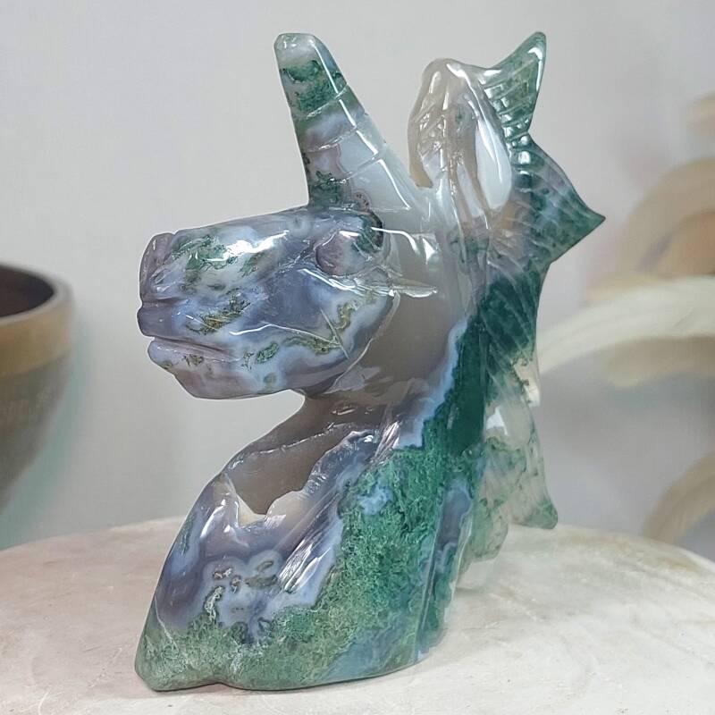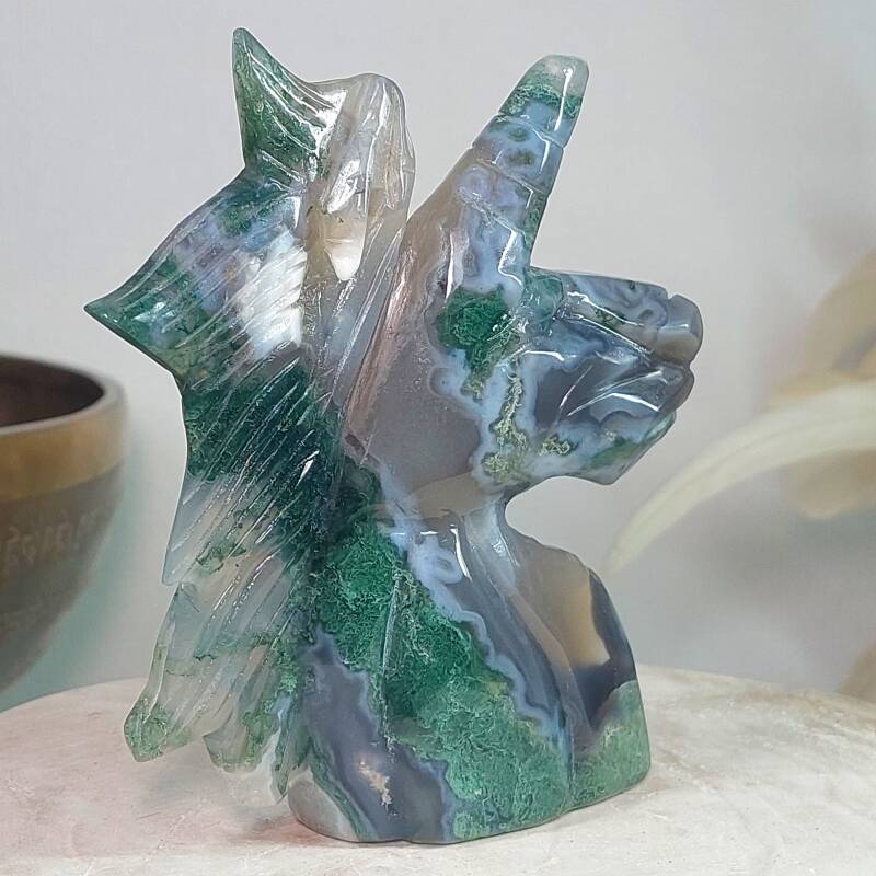 Wat een plaatje is de mooie Mosagaat unicorn. Je blijft kijken naar de prachtige lichte, dikke Chalcedoon lijnen mooie patronen mosagaat, heerlijk om erbij in weg te dromen. Ook heeft de meeste Eenhoorn druzy en een mooie opening in de halslijn. Diagonaal 14,5 cm