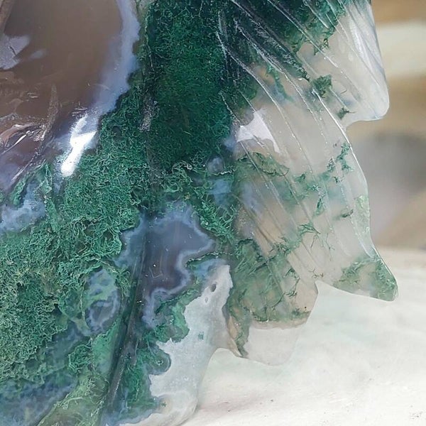 Mos agaat helpt je om zorgen los te laten en te ontspannen. Goed voor huid, haren en bevordert spijsvertering. Maakt actief en vitaal. Mos agaat geeft rust en helderheid, maakt bevalling makkelijker, positieve invloed op de ontwikkeling van de foetus, stimuleert wilskracht en werklust, zorgt voor meer uithoudingsvermogen, opent het hart voor universele liefde, geeft energie en helpt om beter te aarde. Mos agaat heeft een positieve werking op de weerstand, het immuunsysteem, hart en bloedvaten en de longen. De energieën zijn bescheiden maar heilzaam. Hij werkt stabiliserend en aardend. De energie van deze steen zorgt ervoor dat lichaam, geest en ziel naar hun natuurlijke evenwicht worden gebracht zodat je meer rust kunt ervaren op alle niveaus. Mos agaat helpt je te herstellen na ziekte en om weer tot jezelf te komen na een periode van emotionele onrust. Mos agaat werkt goed tegen angsten en stress. Helpt tegen straling. Mosagaat is heel goed voor mensen met schrik en angsten en fobieën of straatvrees, door het dragen krijg je meer eigenwaarde en gevoel van onaantastbaarheid, hij helpt je om overal weer de schoonheid van in te zien.Mosagaat helpt je bij gevoeligheid voor het weer en bij milieuvervuiling.Deze steen is zeer goed voor alle mensen die met planten en gewassen werken.Het is een steen voor een nieuw begin en helpt bij het opheffen van blokkades.Bij een scheiding, overlijden of intens verdriet geeft de mosagaat een steuntje in de rug, hij helpt je ook bij hetafscheid nemen van het verleden en geeft rust in lichaam en geest.Mosagaat is een steen van rijkdom en trekt overvloed aan.Hij helpt ook mensen die erg in hun hoofd zitten bij hun gevoel te komen.De steen helpt om met andere mensen om te gaan en deze ruimte tot groei te geven. Geestelijk bevordert hij zelfexpressie en communicatie.Deze optimistische steen is zeer behulpzaam voor mensen die depressief zijn vanwege hunlevensomstandigheden of door een onbalans in de hersenen, hij geeft dan inzicht in de achterlliggende oorzaken.Mosagaat is goed bij ongemakken aan de neus_ en keelholten, ook zorgt hij voor het beter oplossen van slijm,ontkrampt de maag, darmen en blaas.Ook goed voor de seksuele organen en maakt ze gelijktijdig actief.De steen gaat ontstekingen tegen, reinigt de bloedsomloop en versterkt het immuunsysteem.Goed voor het lymfesysteem en als elixer op de huid aangebracht behandelt mosagaat schimmelinfecties enandere huidinfecties.