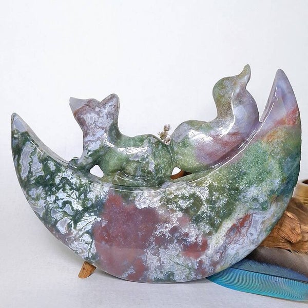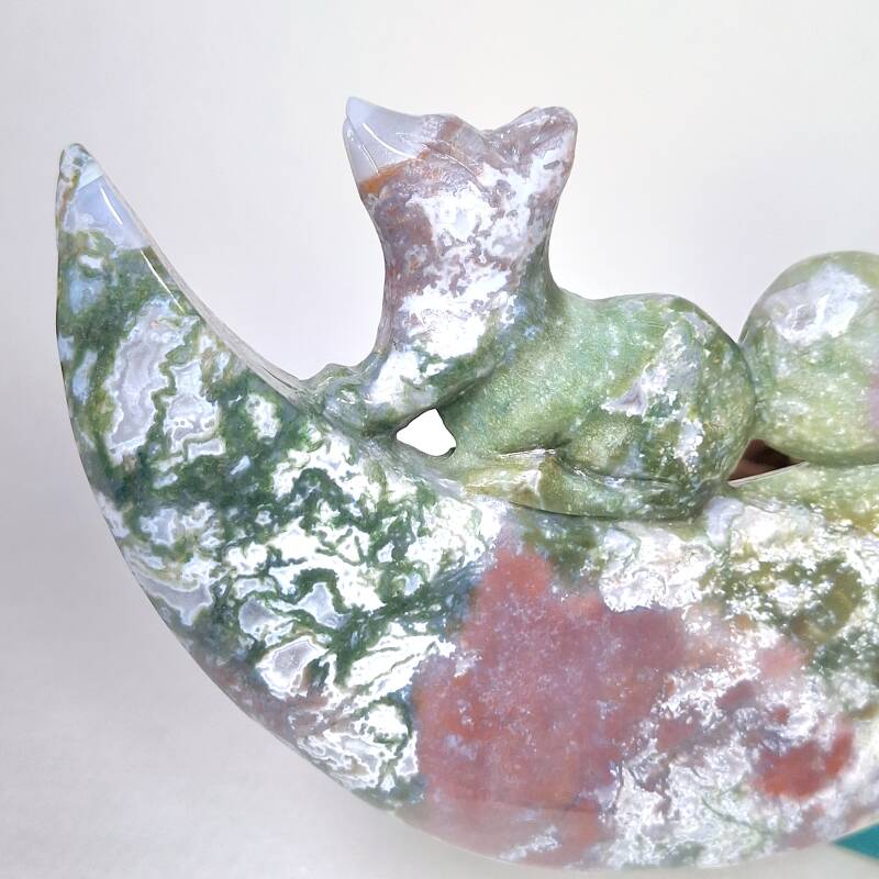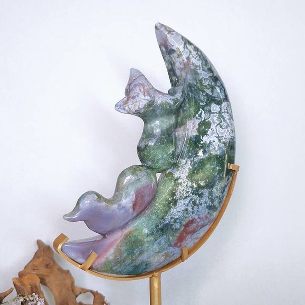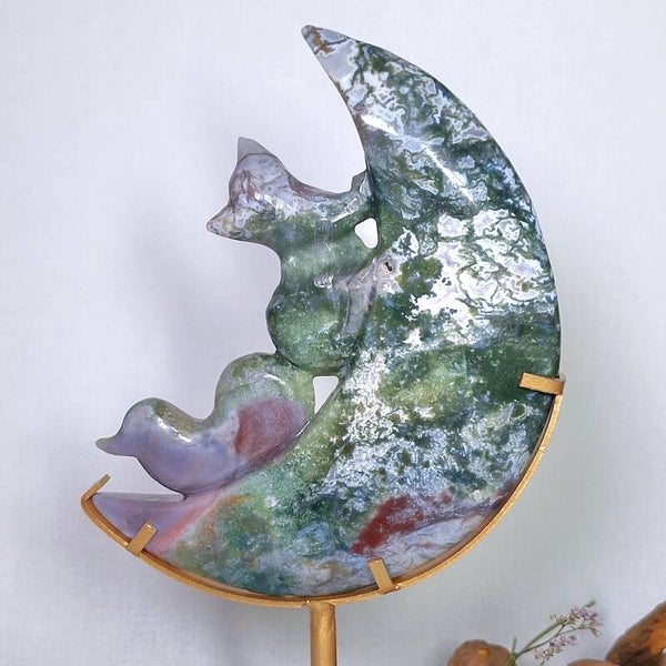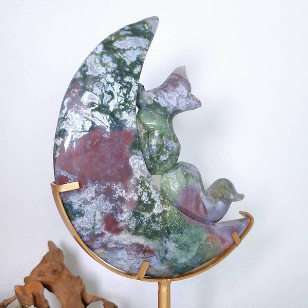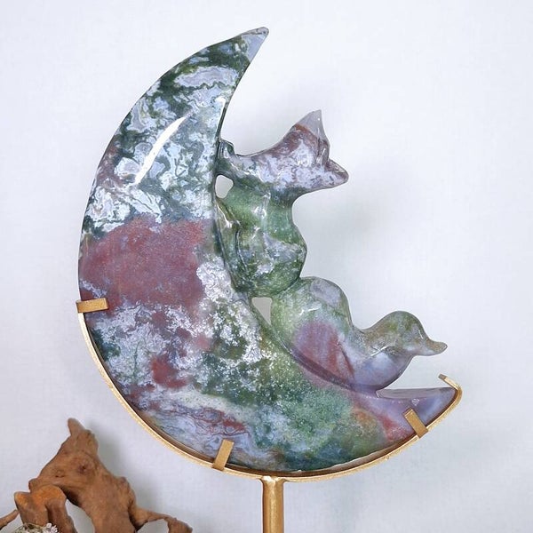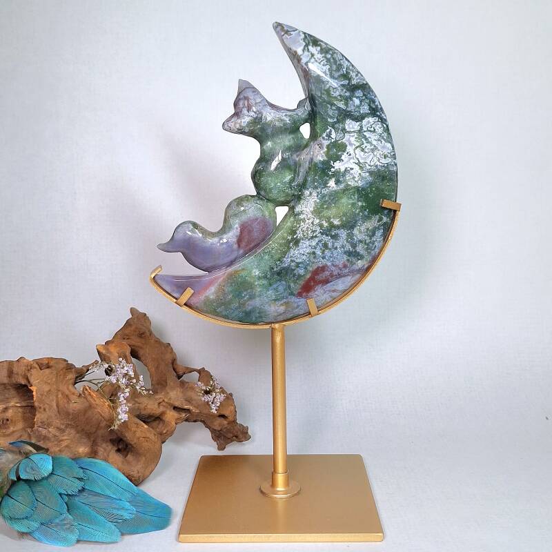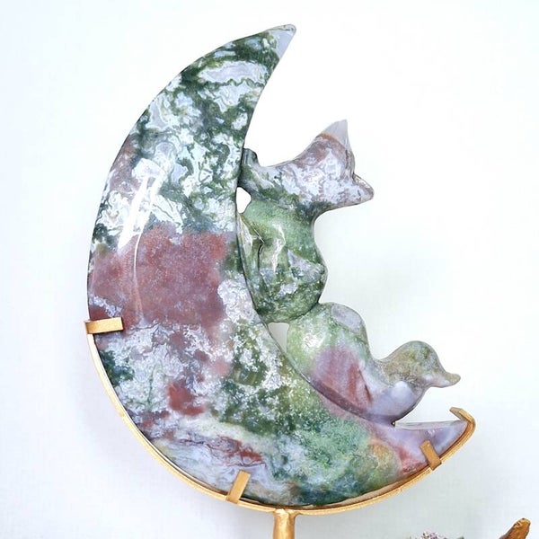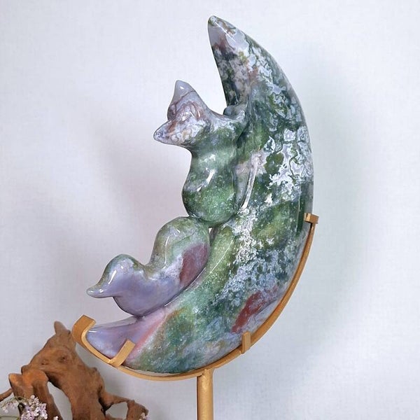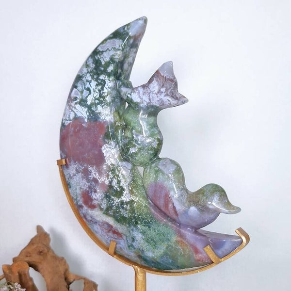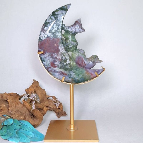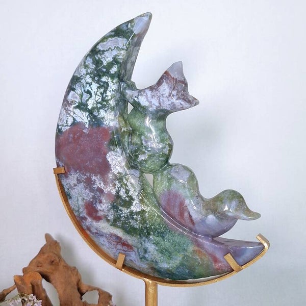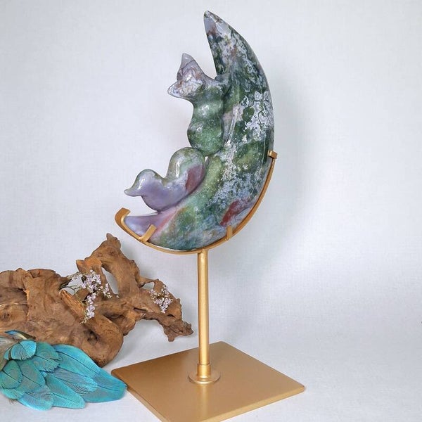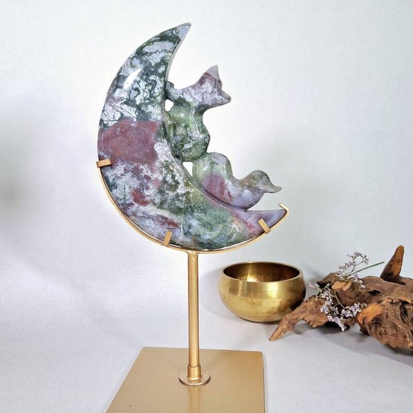 Mosagaat met Oceaan Jaspis maan in standaard. Prachtige grote Maan met bijzonder mooie kleuren Mosagaat en Jaspis. Geweldig mooie patronen om in weg te dromen en de kleuren roze, lavendel paars, rood en groen maakt deze deze Maan extra uniek. Een prachtig exemplaar van groot formaat, ze wordt geleverd met standaard en is c.a 26x14cm en 0,8 kilo. De maan zelf is maar liefst 15cm groot. Deze Maan in metalen goudkleurige standaard is een echte eyecatcher voor ieder interieur. Ze straalt een heerlijke positieve, rustgevende enegie uit. Deze "magisch" mooie maan met haar prachtige kleuren, patronen en vormgeving zal ook ideaal zijn voor in de slaapkamer om de nachtrust te bevorderen.
