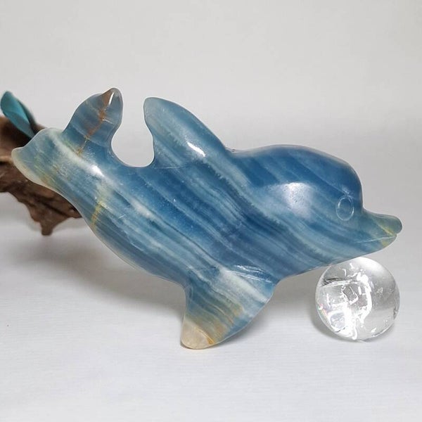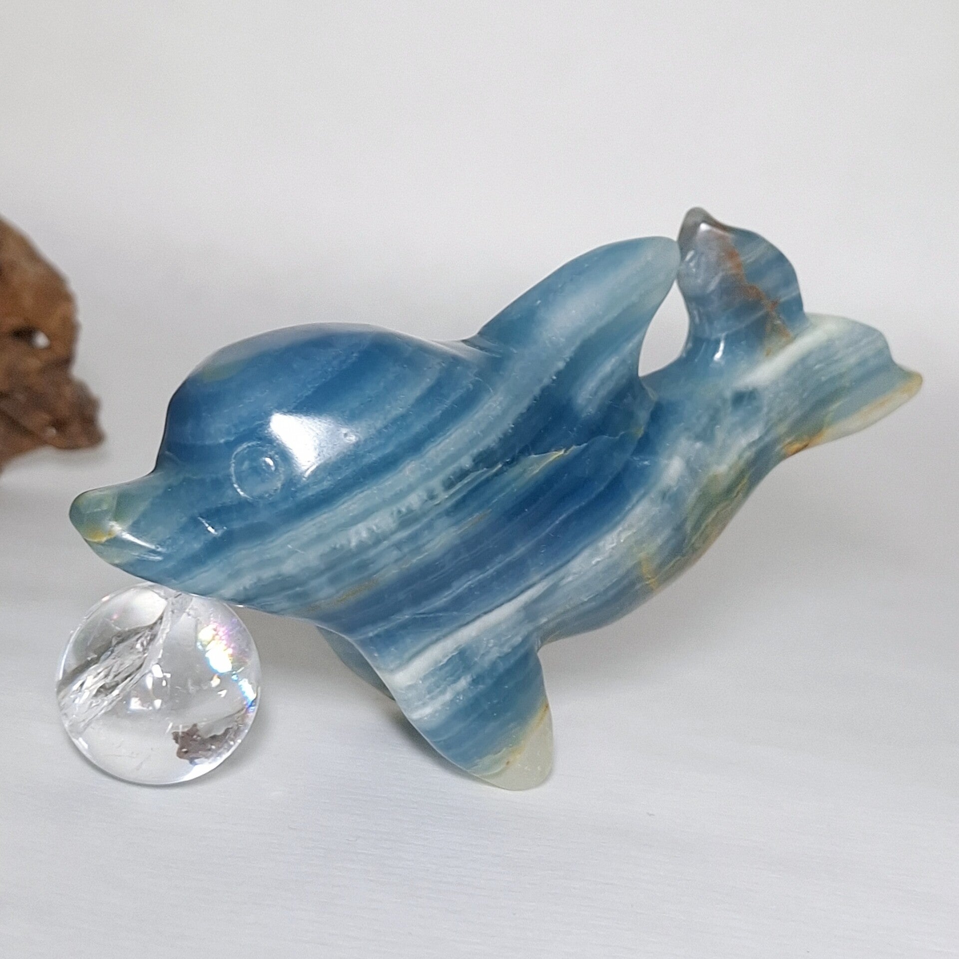 Prachtige handgeslepen dolfijn van Lemurian Aquatine calciet uit Argentinië. Wat een magisch mooie dolfijn is er voor ons met de hand geslepen. Zo mooi blauw van kleur en met een prachtige uitstraling en enorm fijne energie, deze is precies zoals ik voor ogen had. Ze is 11 cm groot en het heldere Bergkristallen bolletje met regenboogjes is 2,2cm en wordt erbij meegeleverd. Een prachtige combinatie. De verschillende gegeven namen maken het verwarrend wat de steen exact is, het staat bekend onder de namen lemurische aquatine calciet, aqua(tine) calciet, lemurische (blauwe) onyx, oceaan calciet, Argentijnse blauwe onyx en nog vele anderen. Geologisch gezien is het echter geen calciet en ook geen onyx, maar een op chalcedoon gebaseerde agaat, een vorm van kwarts. Deze steen is ontdekt in 2009 in Argentinië en is vrij zeldzaam en heeft een bijzonder krachtige liefdevolle energie. Lemurian aquatine calciet kan helpen om de intentie te zetten en te maken voor de verbinding met Lemurië. De steen helpt ons om toegang te krijgen tot vorige levens, oude kennis en de Akasha-kronieken. Het helpt ook om veel gemakkelijker af te stemmen op het verleden van de aarde. De steen heeft een sterke verbinding met walvissen, dolfijnen en andere wezens van de zee, tijdens meditatie met deze steen kunnen deze verbindingen worden versterkt. De energie die de dolfijn van nature met zich meedraagt, heeft een helende werking. Zijn zuivere ZIJN heelt. Daar hoeft hij eigenlijk helemaal niets voor te doen dan alleen aanwezig te ZIJN. Jij krijgt toch automatisch die lach op jouw gezicht of dat blije gevoel als je hem ziet? Als jij kunt ZIJN, zoals de dolfijn, dan "heel" je automatisch.