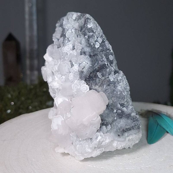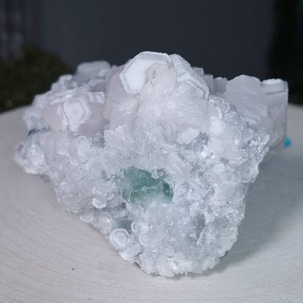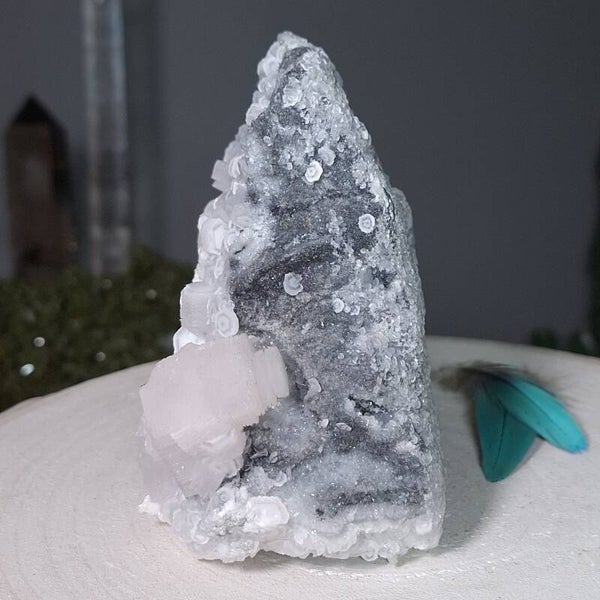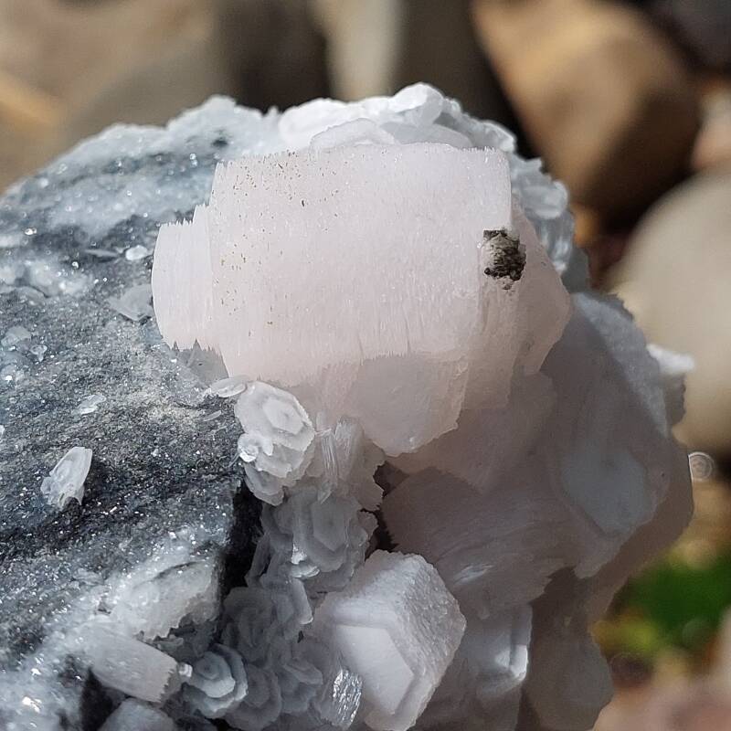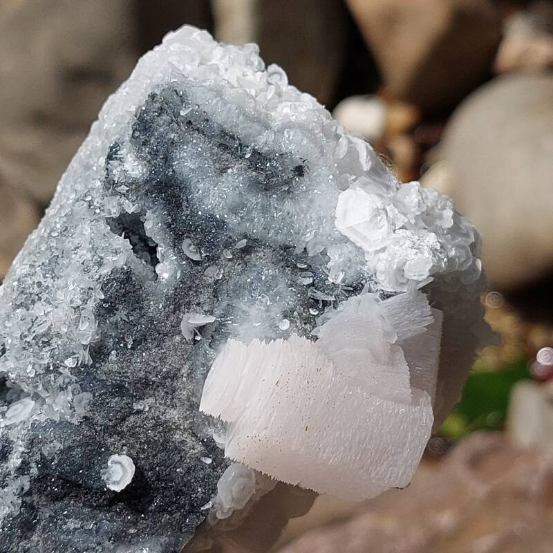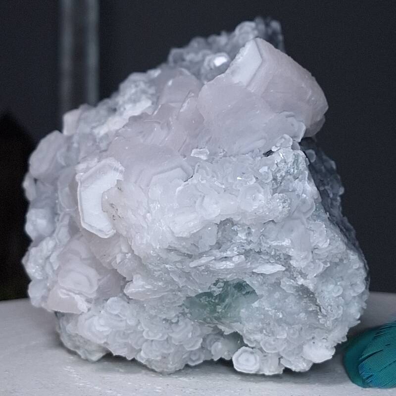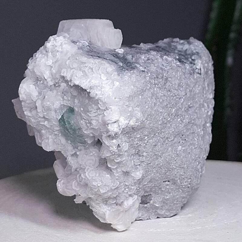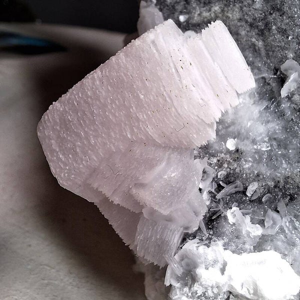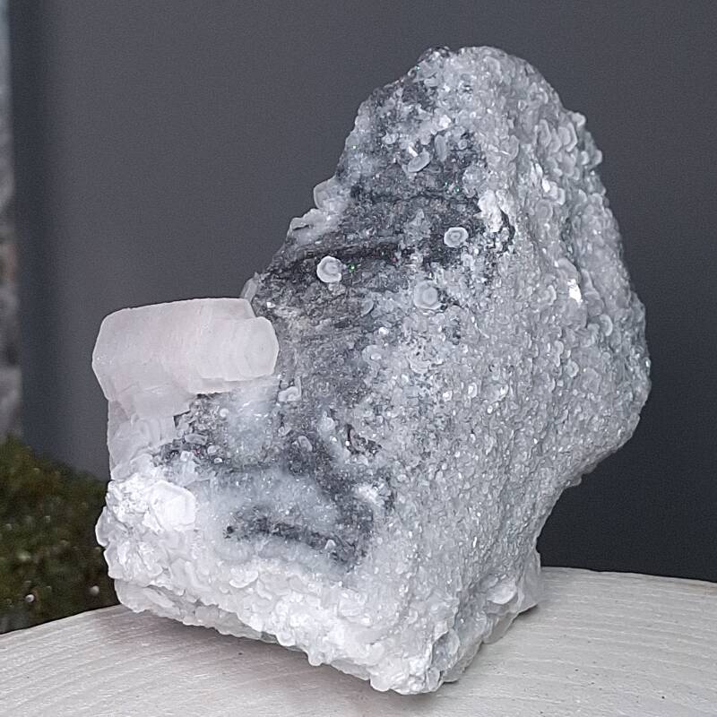 Zeldzaam, bijzonder combinatiestuk met Pink coin Calcite (ook wel 1000 lagen roze munt calciet genoemd), green Fluorite and sugar quartz uit Longyan Fujian China. Dankbaar ben ik dat een aantal van deze bijzondere stukken heb kunnen bemachtigen. Zowel de roze Calciet, bestaande uit flinterdunne laagjes, als de groene Fluoriet zijn uv reactief.