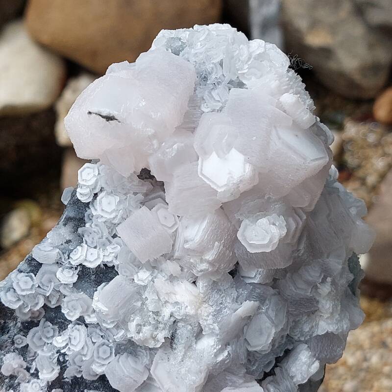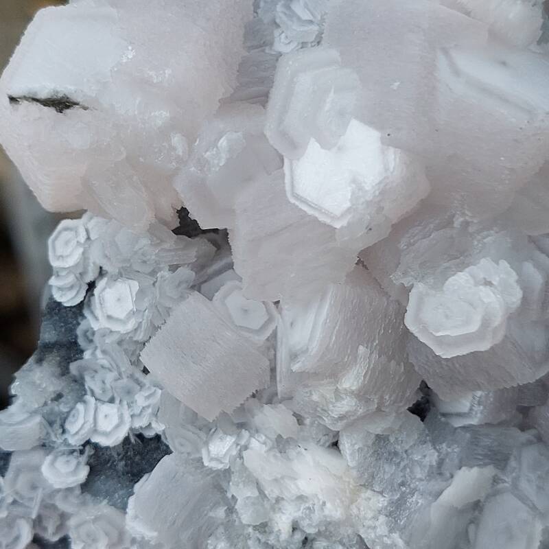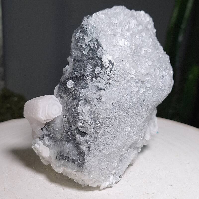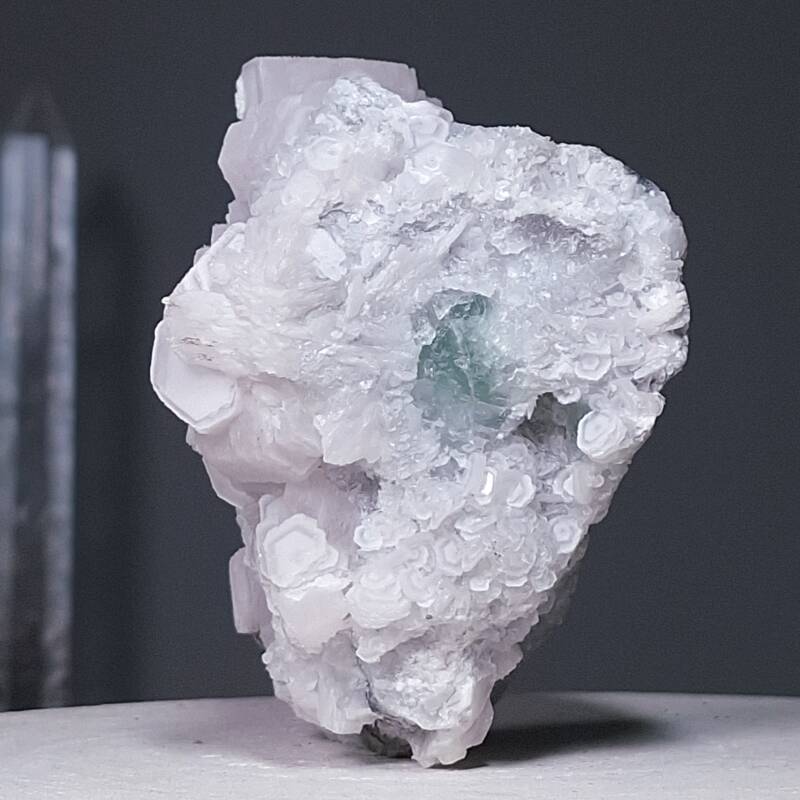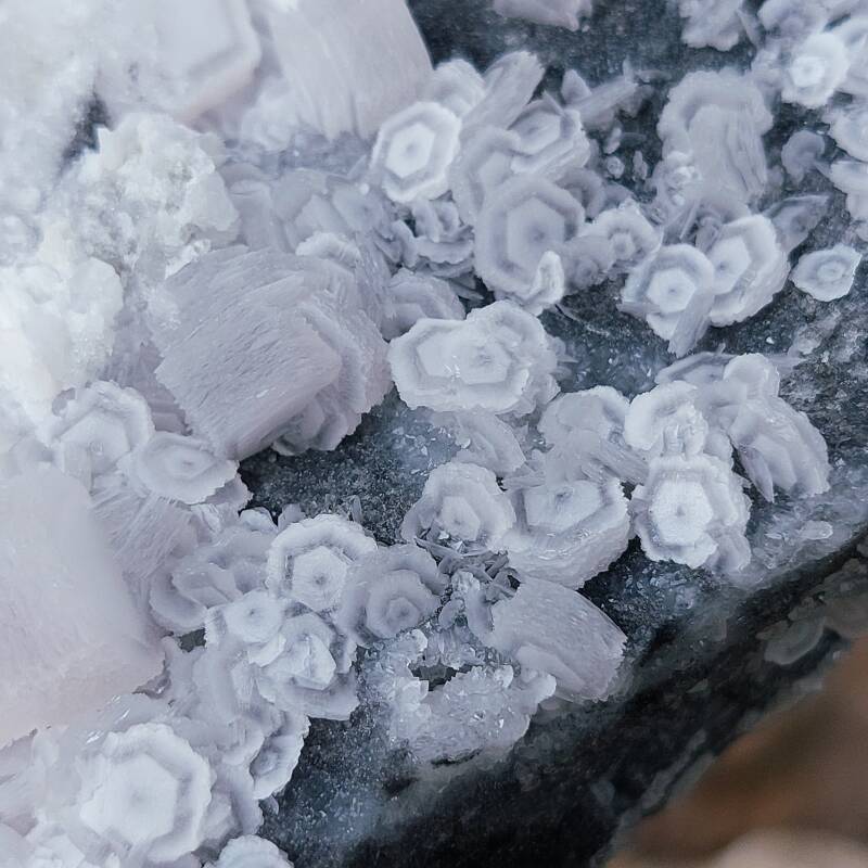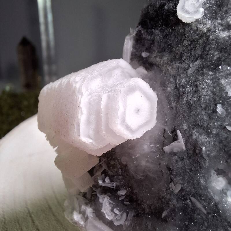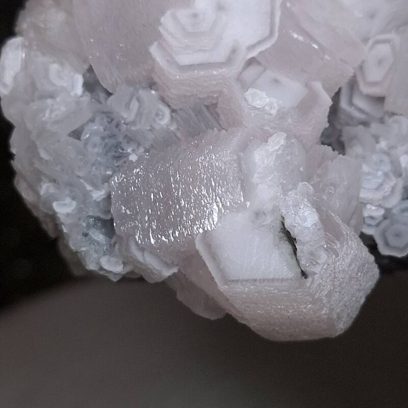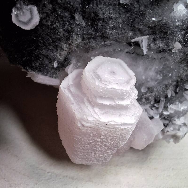 Zeldzaam, bijzonder combinatiestuk met Pink coin Calcite (ook wel 1000 lagen roze munt calciet genoemd), green Fluorite and sugar quartz uit Longyan Fujian China. Dankbaar ben ik dat een aantal van deze bijzondere stukken heb kunnen bemachtigen. Zowel de roze Calciet, bestaande uit flinterdunne laagjes, als de groene Fluoriet zijn uv reactief.