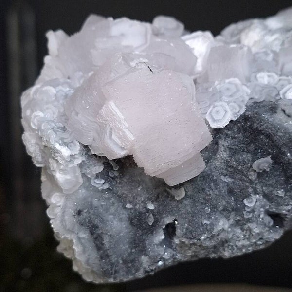 Zeer bijzondere en zeldzaam combinatiestuk. Bevat roze calciet met zeshoekige formatie die is opgebouwd is uit vele dunne laagjes, tevens bevat dit stuk groene Fluoriet en sprankelende kwarts kristalletjes. Zowel de Calciet als de Fluoriet zijn uv reactief onder diverse soorten uv lampjes.