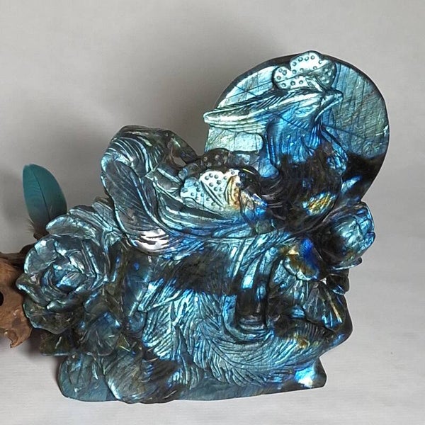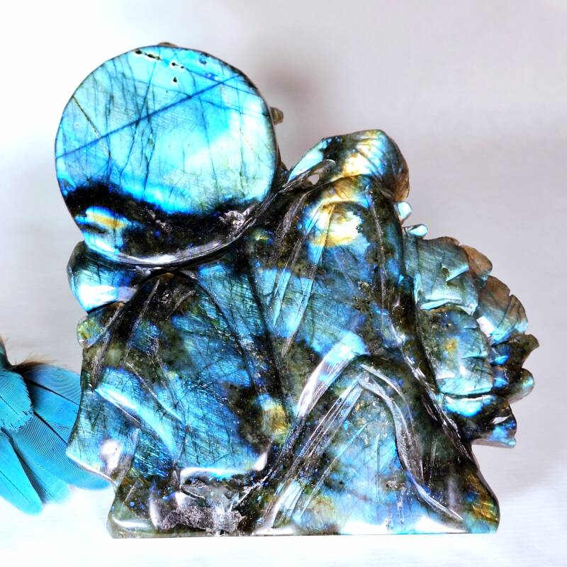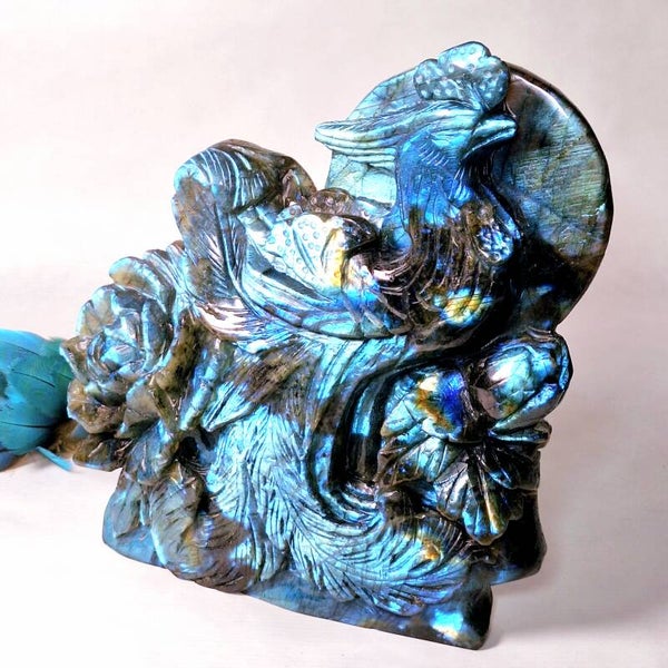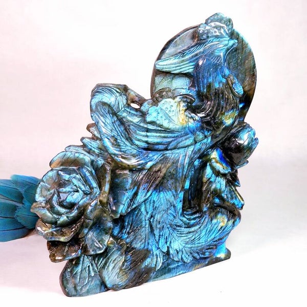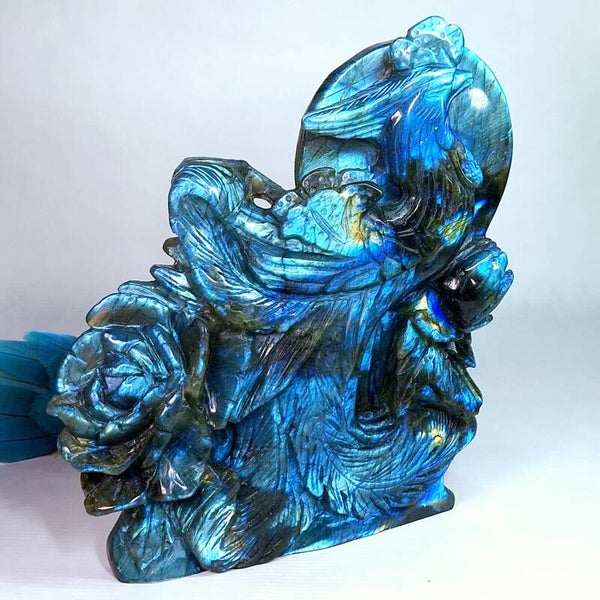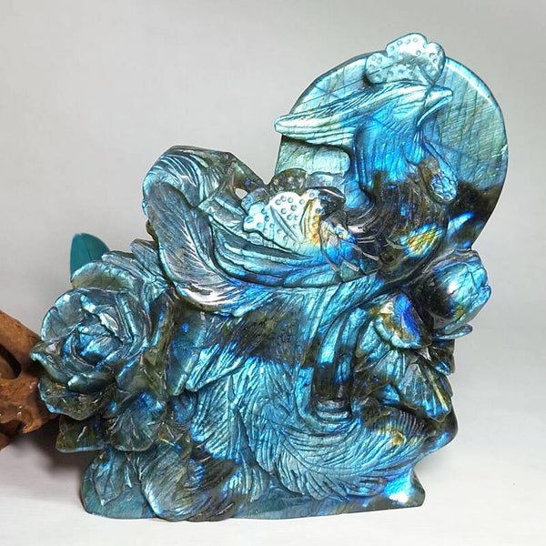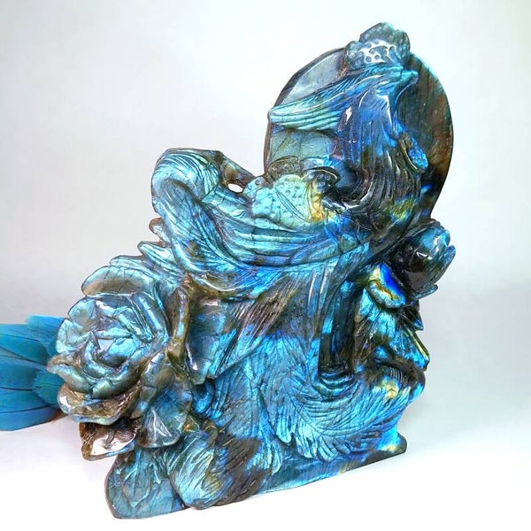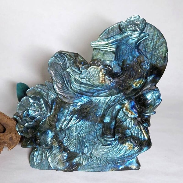 Prachtige XL Labradoriet Phoenix, Feniks met enorm veel "flash" aan zowel voorkant en achterkant. Een handgeslepen prachtig beeld met geweldig mooie betekenis. Het exclusieve, unieke natuurlijke kunstwerk heeft prachtige details, de Feniks zelf heeft prachtige veren en daarnaast zijn er ook enorme mooie bloemen geslepen uit de prachtige kwaliteit Labradoriet. Langste kant is maar liefst 22cm en lengte x breedte = 18,5x17,5cm.