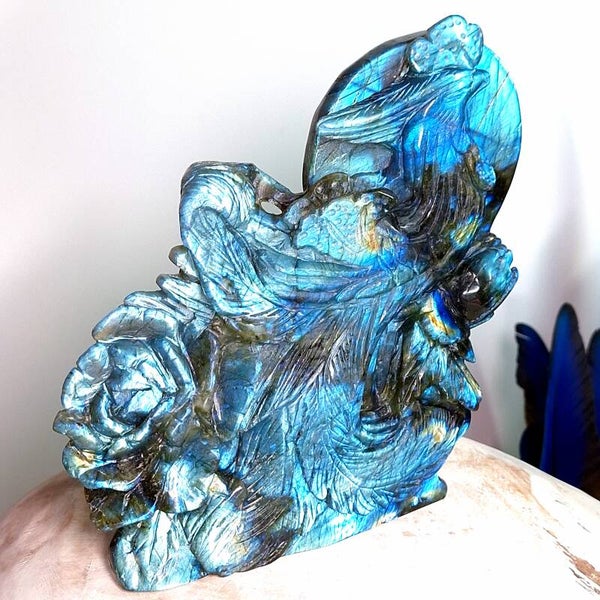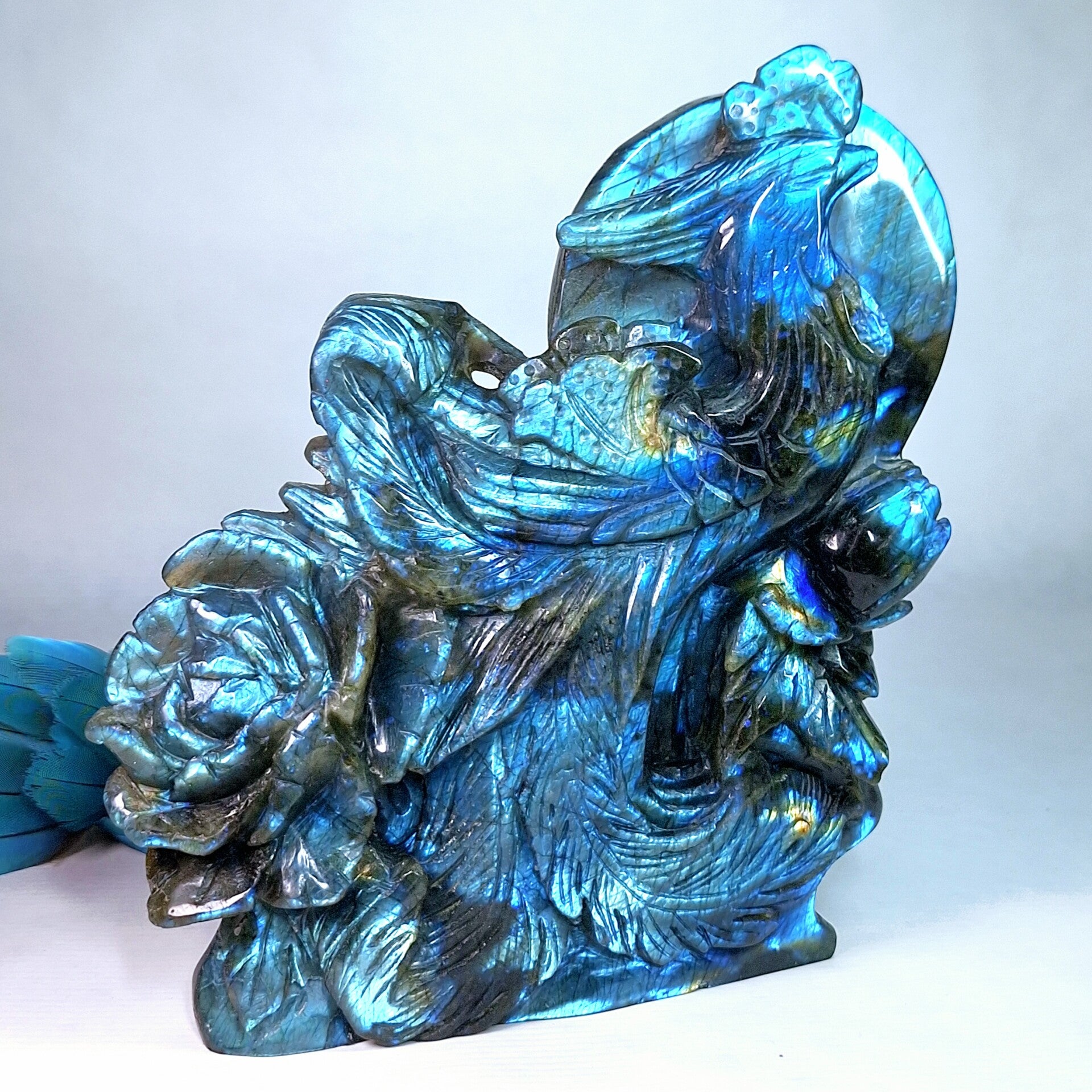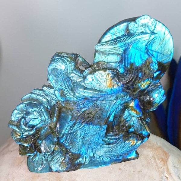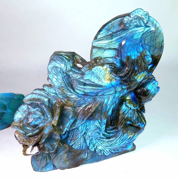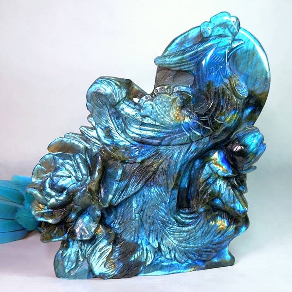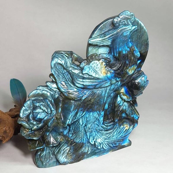 Prachtige XL Labradoriet Phoenix, Feniks met enorm veel "flash" aan zowel voorkant en achterkant. Een handgeslepen prachtig beeld met geweldig mooie betekenis. Het exclusieve, unieke natuurlijke kunstwerk heeft prachtige details, de Feniks zelf heeft prachtige veren en daarnaast zijn er ook enorme mooie bloemen geslepen uit de prachtige kwaliteit Labradoriet. Langste kant is maar liefst 22cm en lengte x breedte = 18,5x17,5cm.