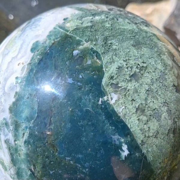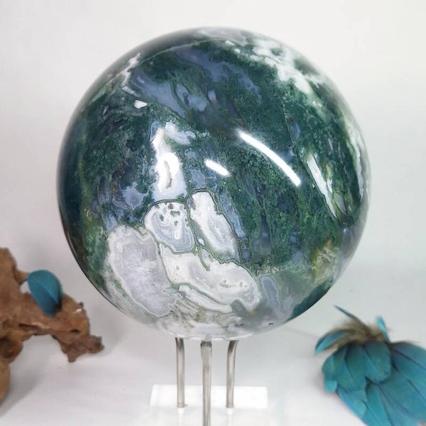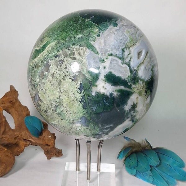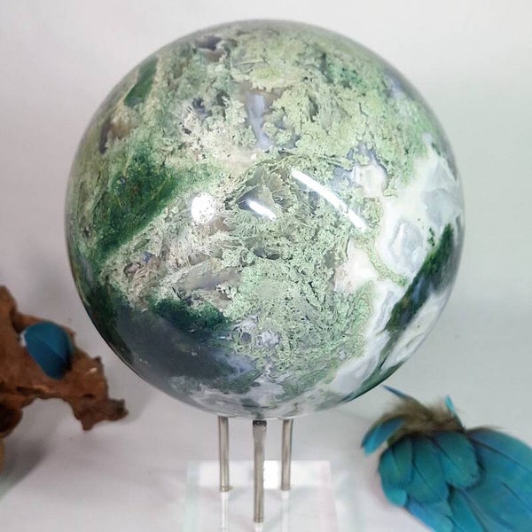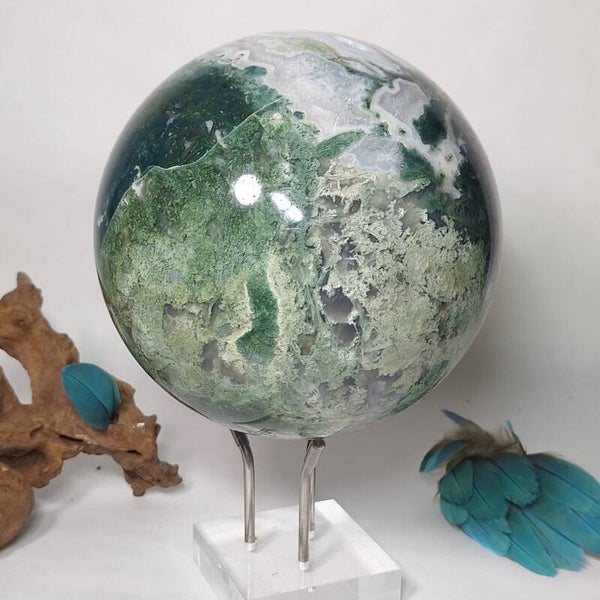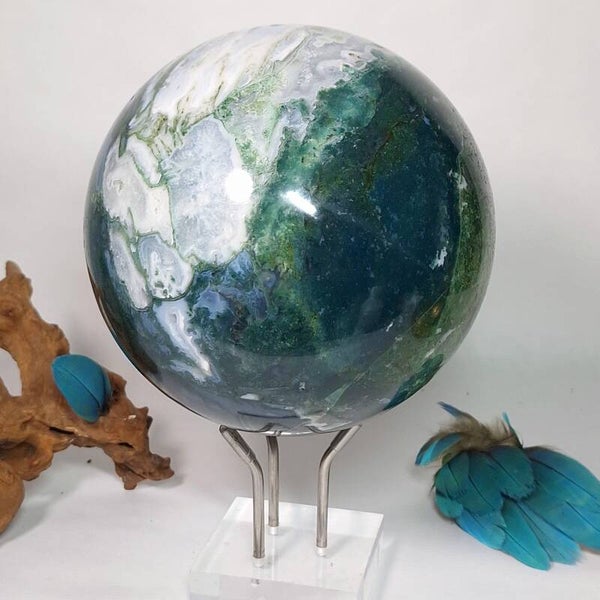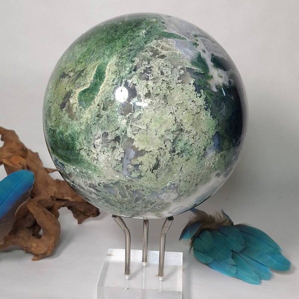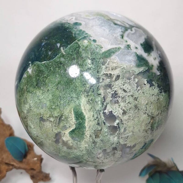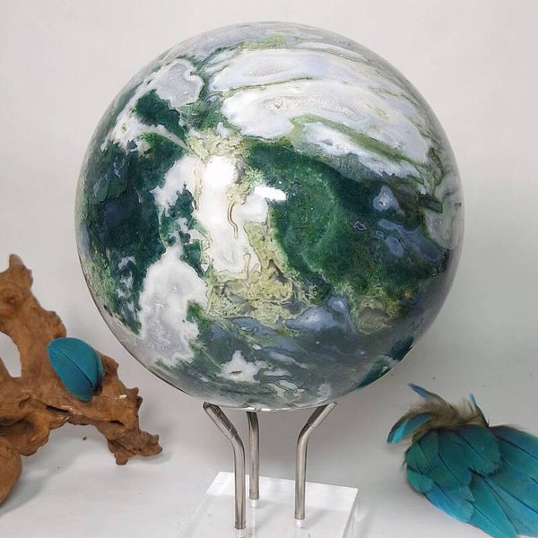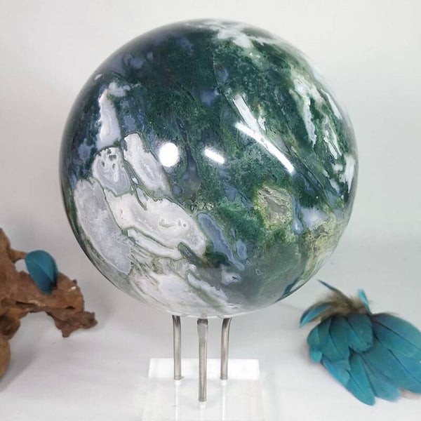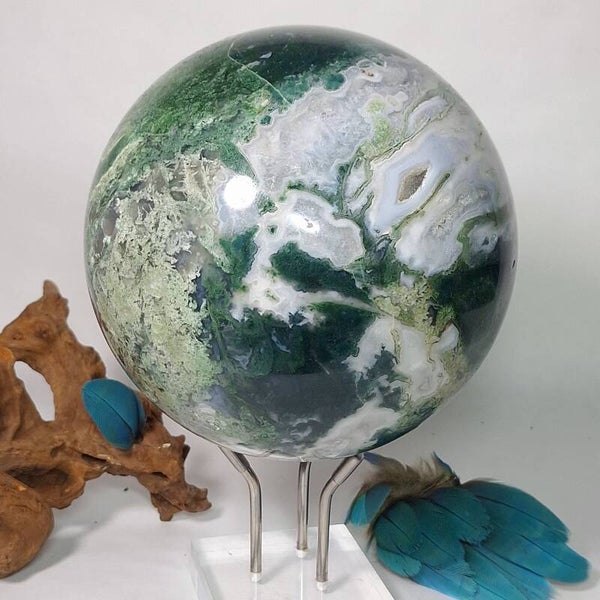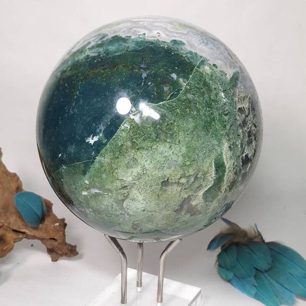 Wat een plaatje is deze Mosagaat bol met prachtige patronen, klein lichtblauwe Blauwe Chalcedoon en wat kleine geodes met druzy kristallen. Deze grote bol van 3,4 kilo zal een fantastische aanwinst zijn voor iedere ruimte. Voor o.a thuis, kantoor, praktijk en salon. Met haar prachtige aardende, positieve energie zal ze een verrijking zijn voor iedereen. De patronen zijn magisch mooi en nodigen je uit om te blijven kijken naar dezeschat van moeder aarde. Heerlijk om in weg te dromen en ook zeer geschikt om te gebruiken tijdens meditaties en (healing) sessies. Deze bol heeft een hele dunne witte ader over één kant van de bol lopen wat mij doet denken aan de evenaar, de twee kanten zijn heel verschillend van kleur en patronen. De ene kant is heel licht van kleur terwijl de andere kant een donker groene kleur heeft, een hele mooie verschijning die onder andere vanwege de diversiteit nooit zal vervelen. Bekijk ook de video van deze schoonheid hieronder
