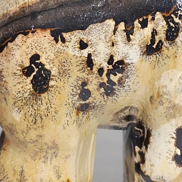 In plaats van het beeld te polijsten is er een flinter dun laagje olie/lak over het beeld gespoten.