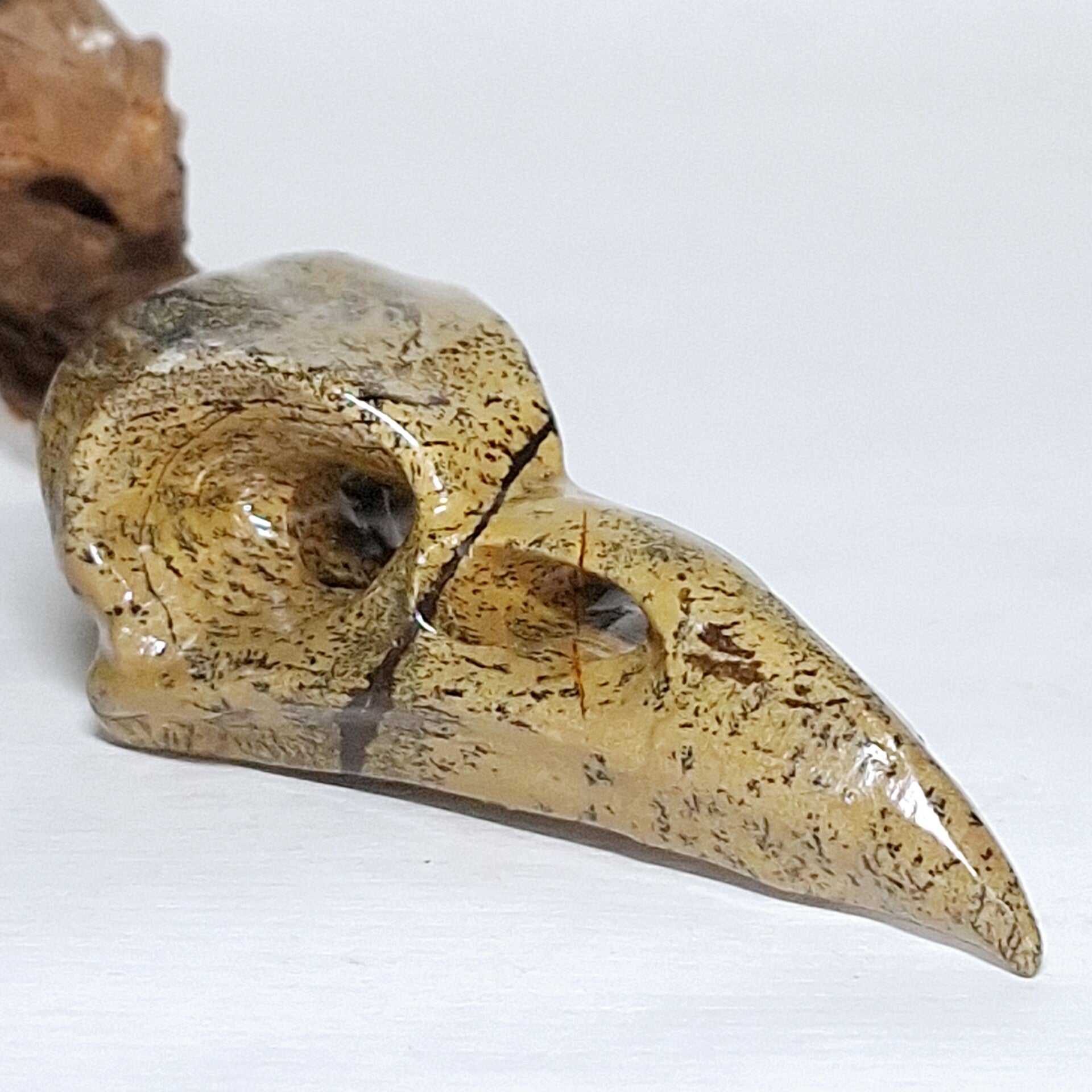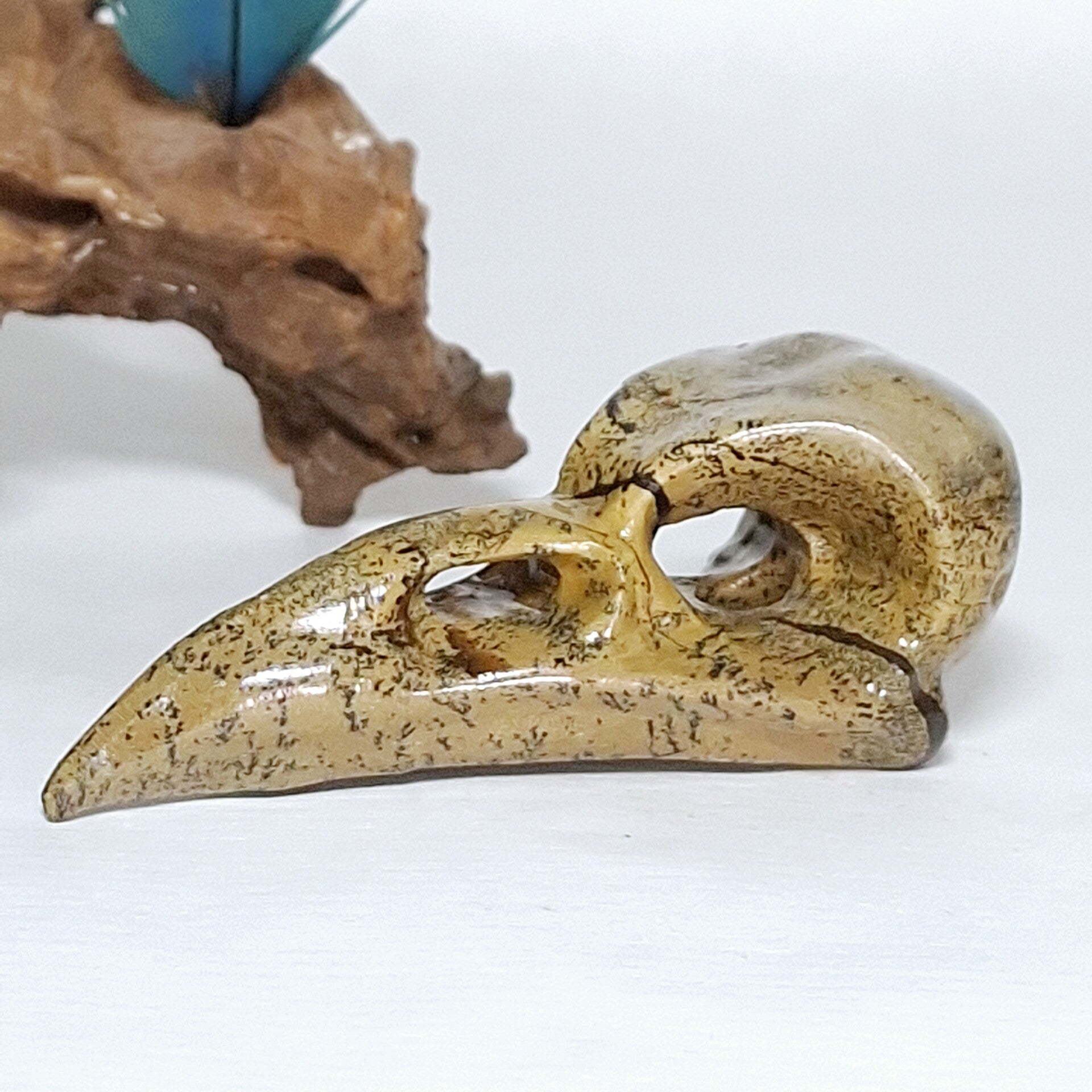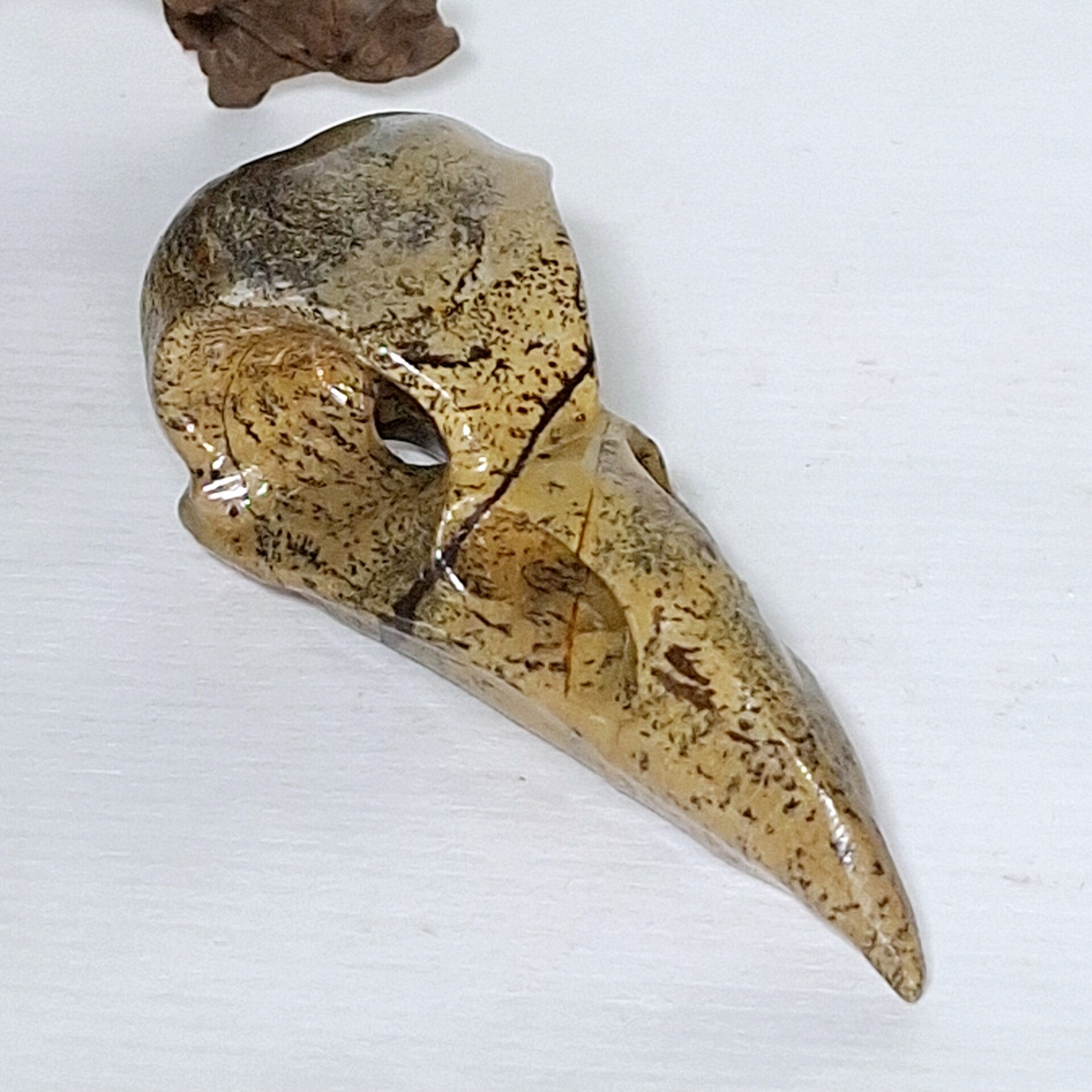 Raven Skull gemaakt van Dendriet Jaspis. Zeer mooie schedel van een Raaf met prachtige patronen. 8 cm. Ook te gebruiken als hanger als je een touwtje of ketting door de ogen doet. Bord skull, vogel schedel.