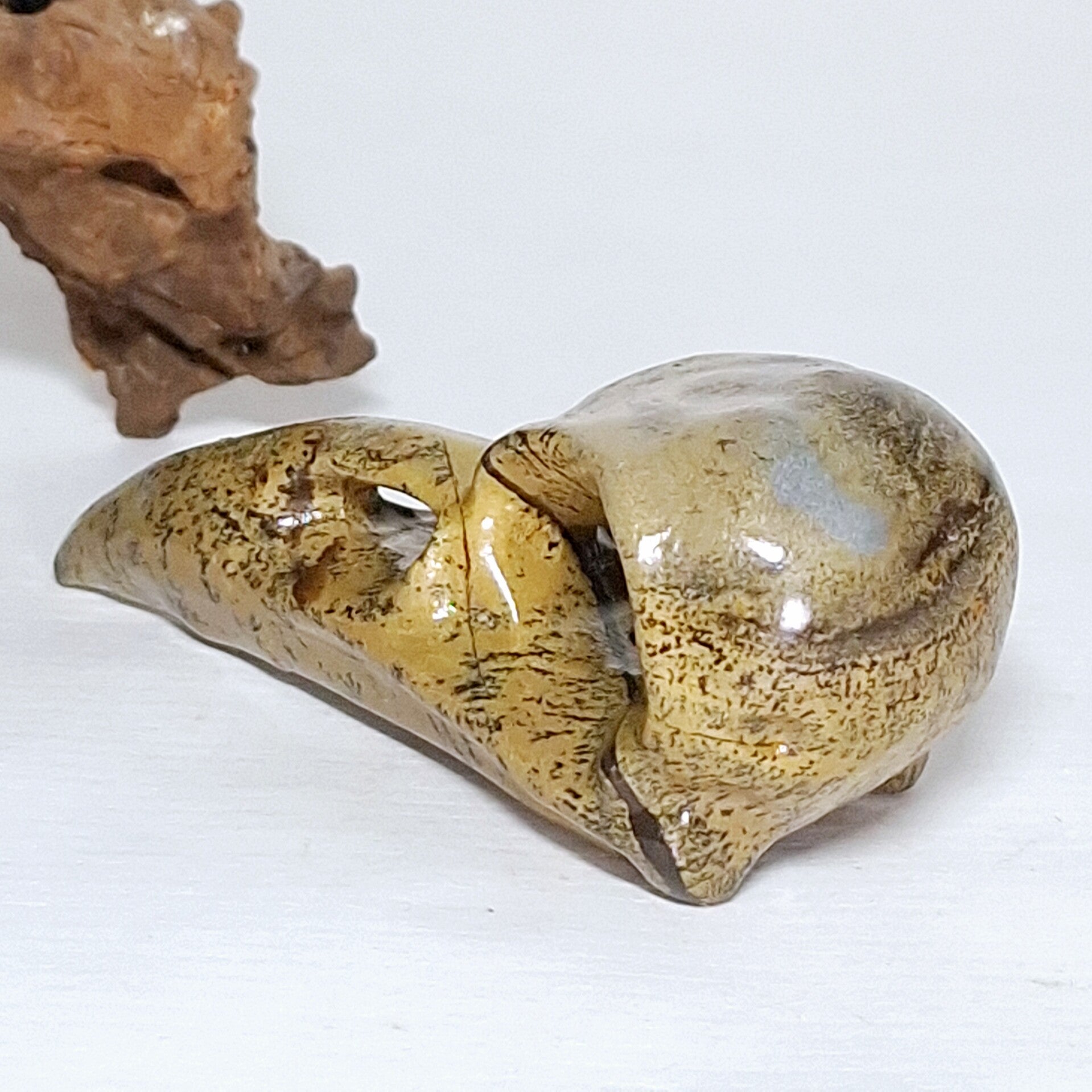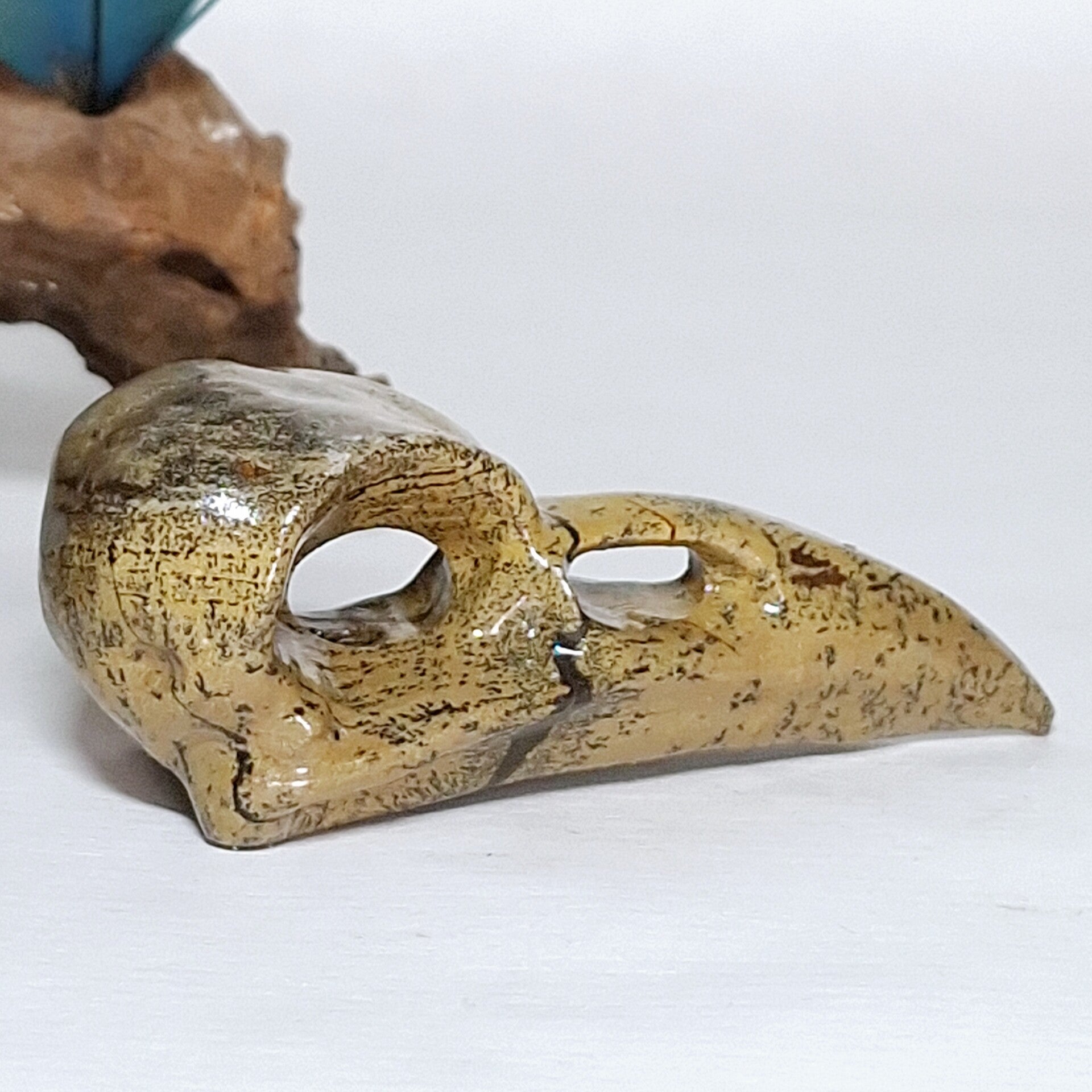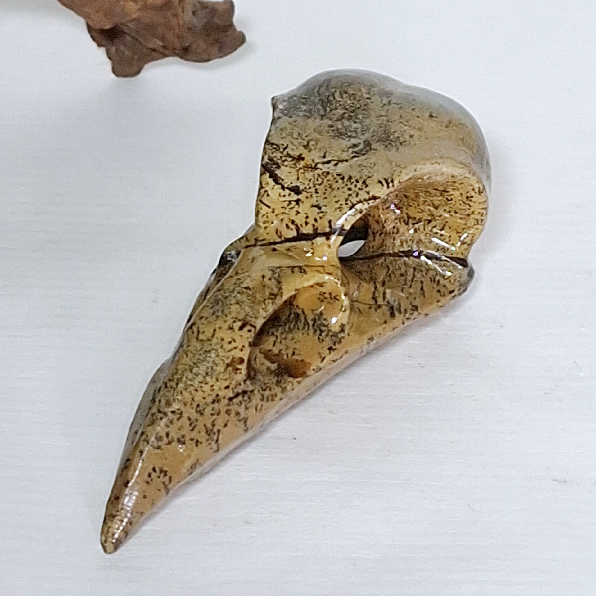 Raven Skull gemaakt van Dendriet Jaspis. Zeer mooie schedel van een Raaf met prachtige patronen. 8 cm. Ook te gebruiken als hanger als je een touwtje of ketting door de ogen doet. Bord skull, vogel schedel.