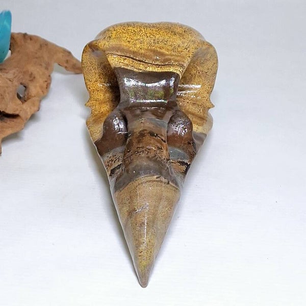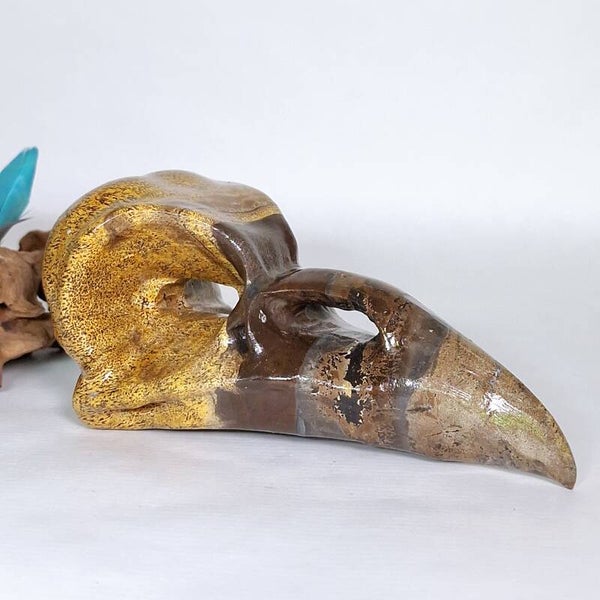 Raven Skull gemaakt van Landschaps , Dendriet Jaspis. Zeer mooi groot beeld van een Raaf 15,5 cm. Deze raven schedel zal prachtig op o.a een kast, bureau en tafel staan, tevens kan deze ook als wand decoratie dienen door een koord door de ogen te doen en vast te knopen kan deze bijvoorbeeld aan een spijker worden opgehangen. Ideaal om negatieve energieën te weren.