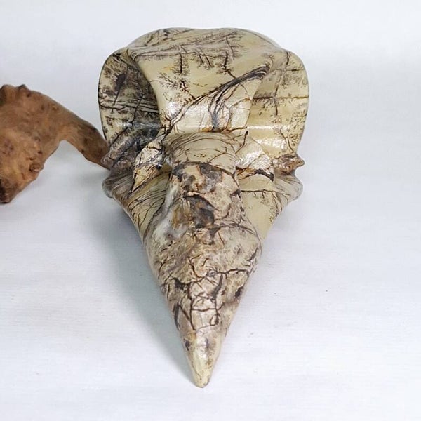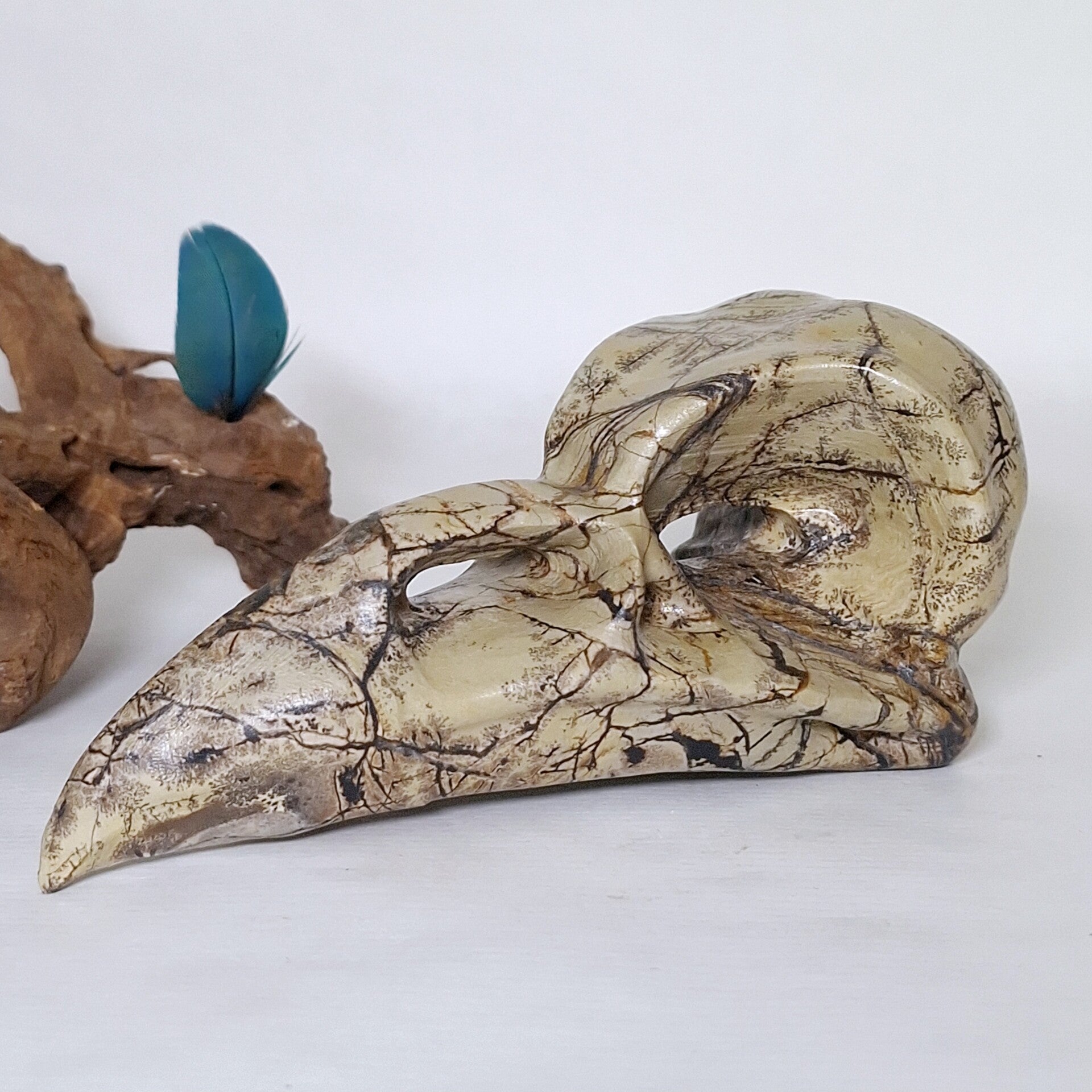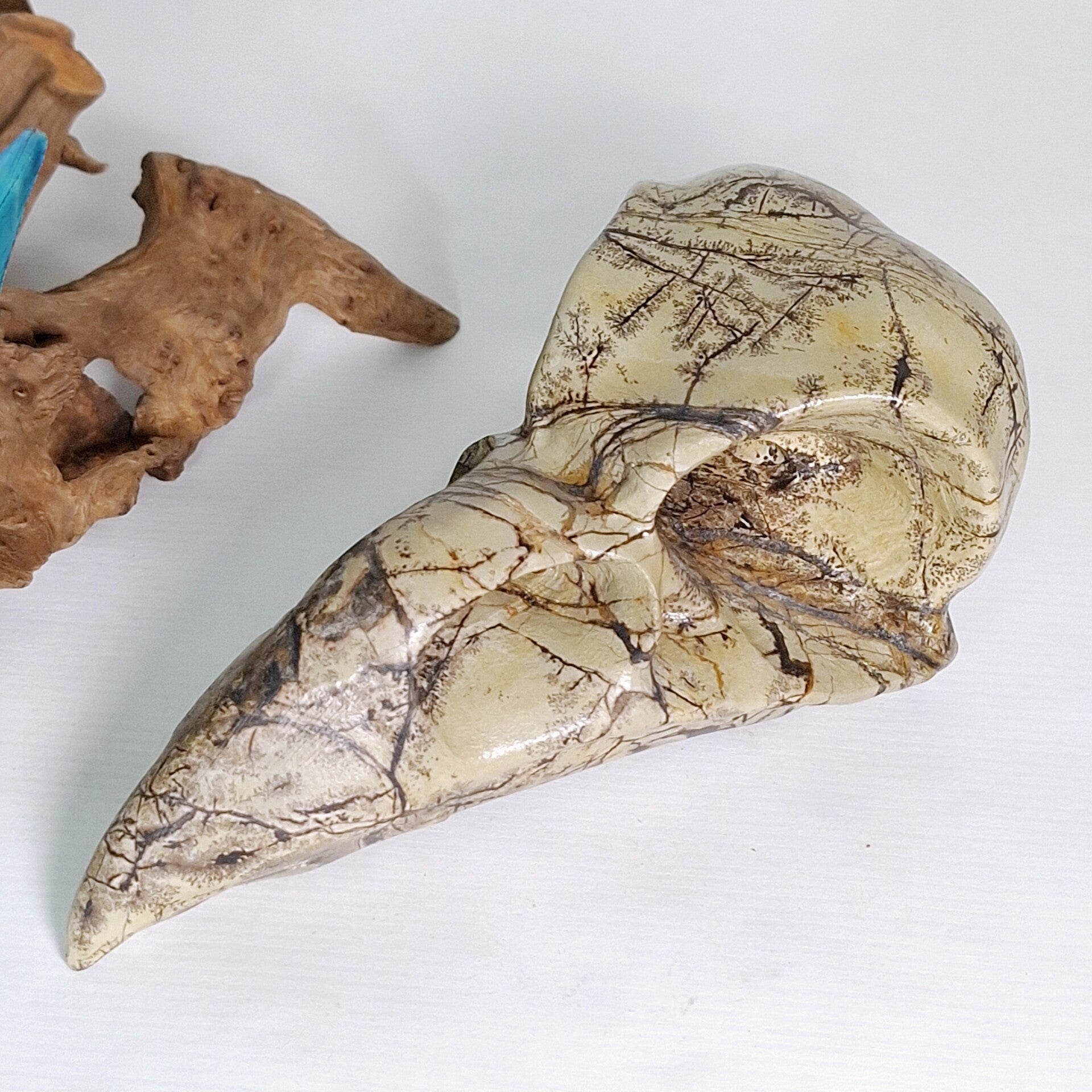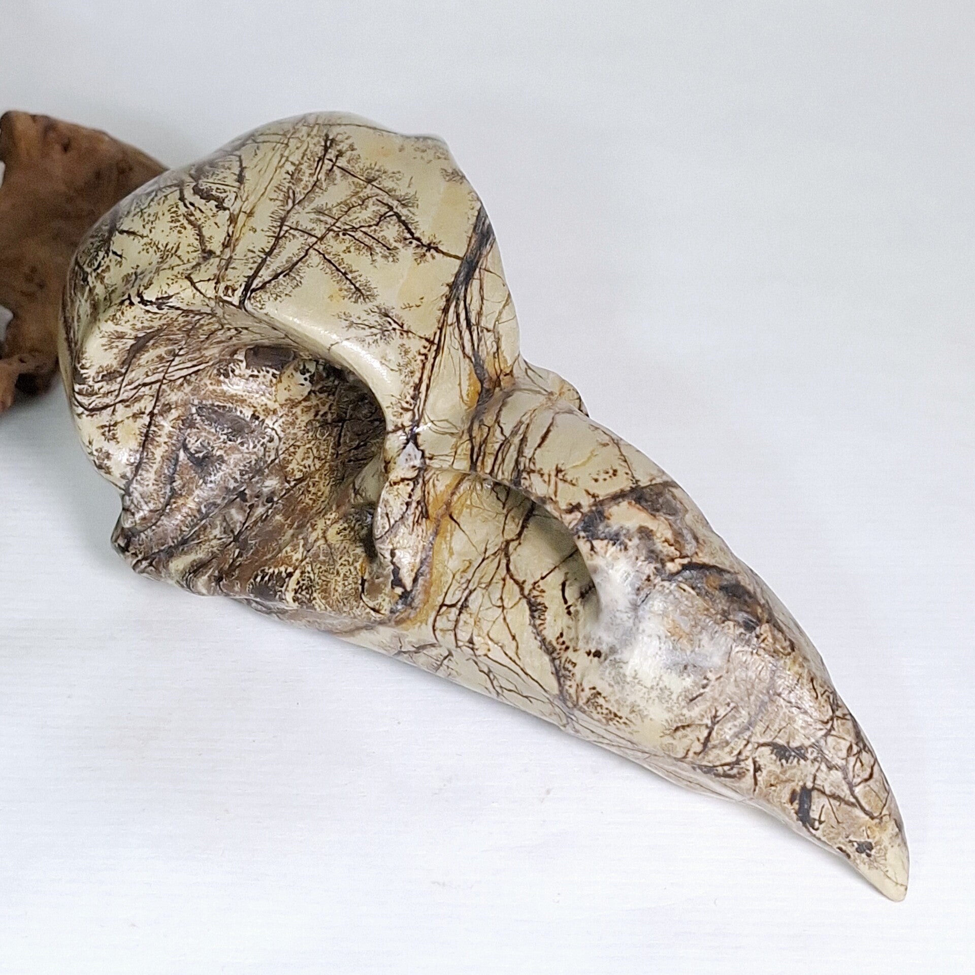 Raven skull van Landschaps, Dendriet Jaspis met een paar bijzondere aders van kwarts. Zeer mooie grote schedel van een Raaf 15,5 cm