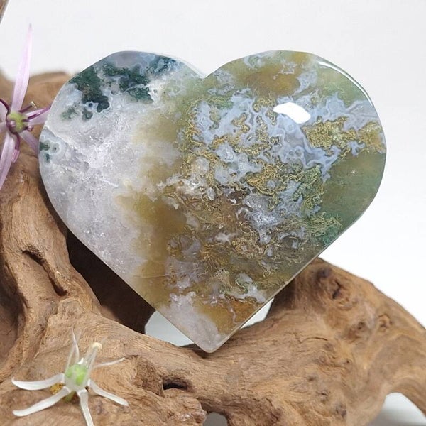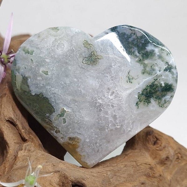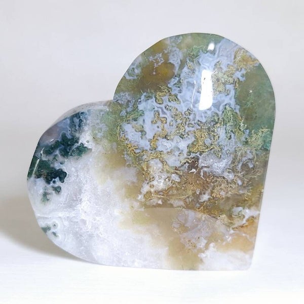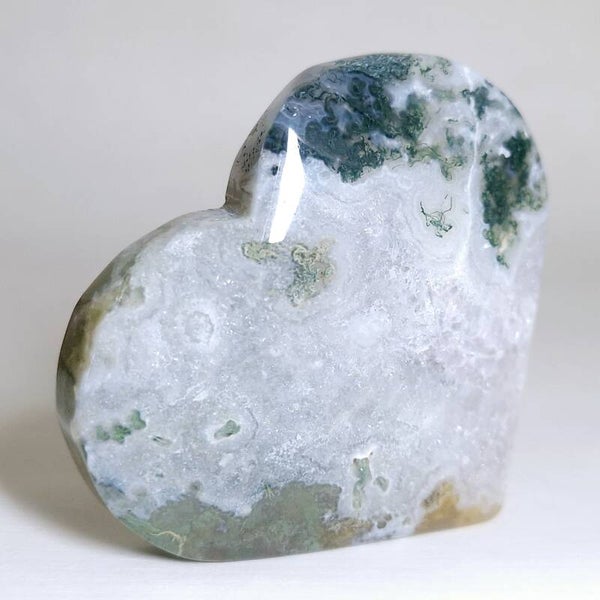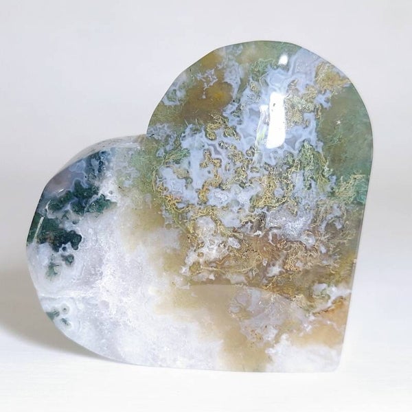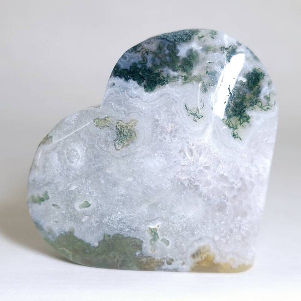 Prachtig Mosagaat hart van 6 cm. Dit hart heeft prachtige patronen van licht en donkergroene Mosagaat, lichtblauwe Chalcedoon en kwarts met regenboogjes. Ze kan zelfstandig op de zijkanten staan dus zonder standaard kun je haar ook op allerlei manieren tentoonstellen.