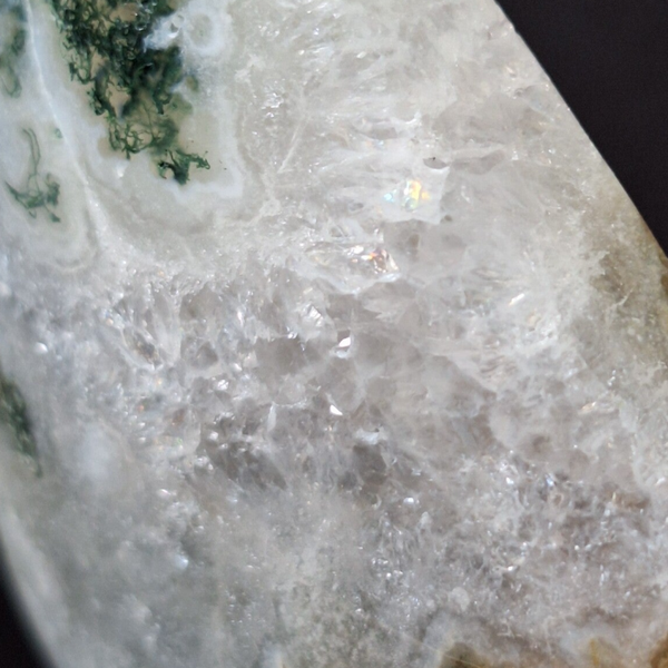 Mosagaat is een steen voor iedereen. De energieën zijn bescheiden maar heilzaam. Hij werkt stabiliserend en aardend. De energie van deze steen zorgt ervoor dat lichaam, geest en ziel naar hun natuurlijke evenwicht worden gebracht zodat je meer rust kunt ervaren op alle niveaus. Mos agaat helpt je te herstellen na ziekte en om weer tot jezelf te komen na een periode van emotionele onrust. Mos agaat werkt goed tegen angsten en stress. Helpt tegen straling. Mos agaat helpt je om zorgen los te laten en te ontspannen. Goed voor huid, haren en bevordert spijsvertering. Maakt actief en vitaal. Mos agaat geeft rust en helderheid, maakt bevalling makkelijker, positieve invloed op de ontwikkeling van de foetus, stimuleert wilskracht en werklust, zorgt voor meer uithoudingsvermogen, opent het hart voor universele liefde, geeft energie en helpt om beter te aarde. Mos agaat heeft een positieve werking op de weerstand, het immuunsysteem, hart en bloedvaten en de longen