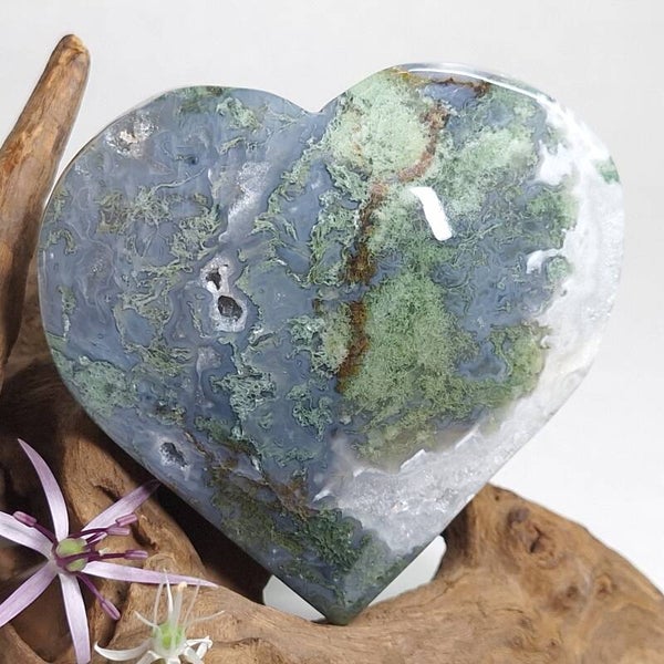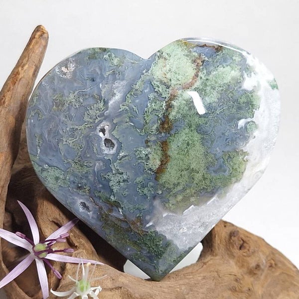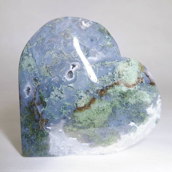 Mosagaat hart, mooi fors exemplaar van 7 cm. Ze heeft prachtige patronen met groene Mosagaat, blauwe Chalcedoon en kwarts. Tevens zijn er wat sprankelende kwarts kristalletjes zichtbaar in de kleine geodes. Als je het hart voor een lampje houdt dan schijnt op sommige delen de patronen er mooi doorheen, dat is erg leuk om te zien. Ze kan zelfstandig op de zijkanten staan dus zonder standaard kun je haar ook op allerlei manieren tentoonstellen.