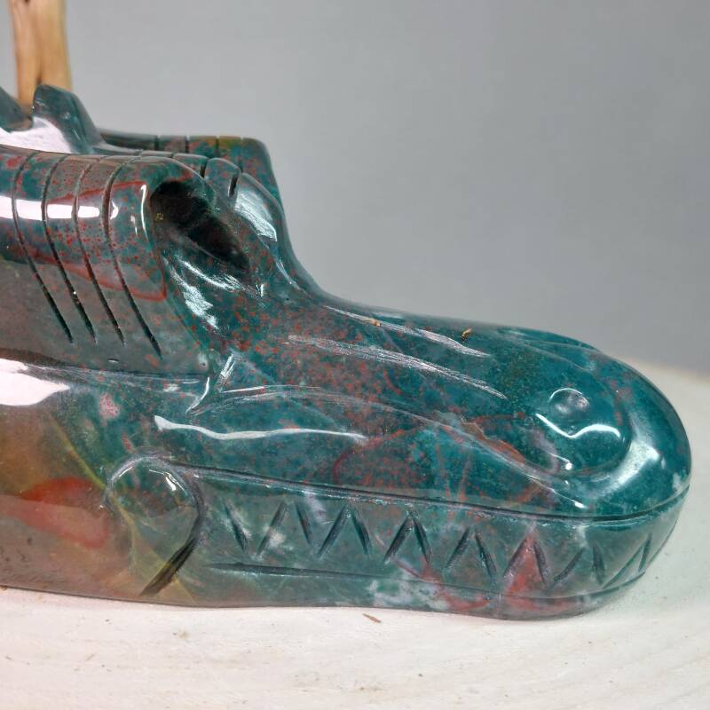 Draak van Heliotroop / Bloedsteen, prachtig exemplaar met heerlijke energie. Groot exemplaar van 13,5 cm en 540 gram. Deze Draak is speciaal voor ons gemaakt door een slijper die liefde heeft voor de natuur en ook veel waarde hecht aan de energetische werking van de "stenen" en hun vorm. Dat deze carving met geduld, zorgvuldig en met liefde is gemaakt is ook te zien en energetisch te voelen. Het is een mooie grote Draak geworden met met prachtige vormgeving en heerlijke energie. Drakenenergie die o.a zacht, krachtig en liefdevol is.