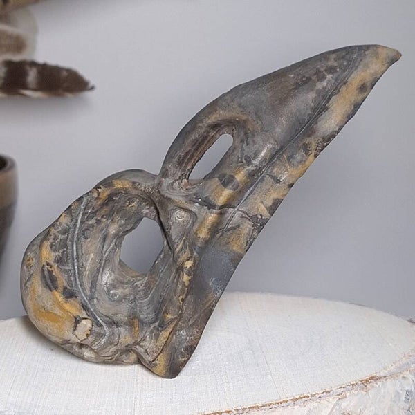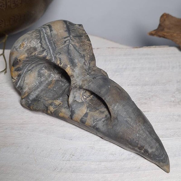 Deze raven schedel zal prachtig op o.a een kast, bureau en tafel staan, tevens kan deze ook als wand decoratie dienen door een koord door de ogen te doen en vast te knopen kan deze bijvoorbeeld aan een spijker worden opgehangen. Ideaal om negatieve energieën te weren.