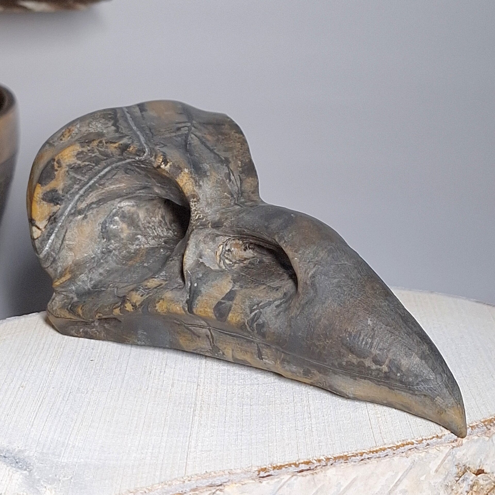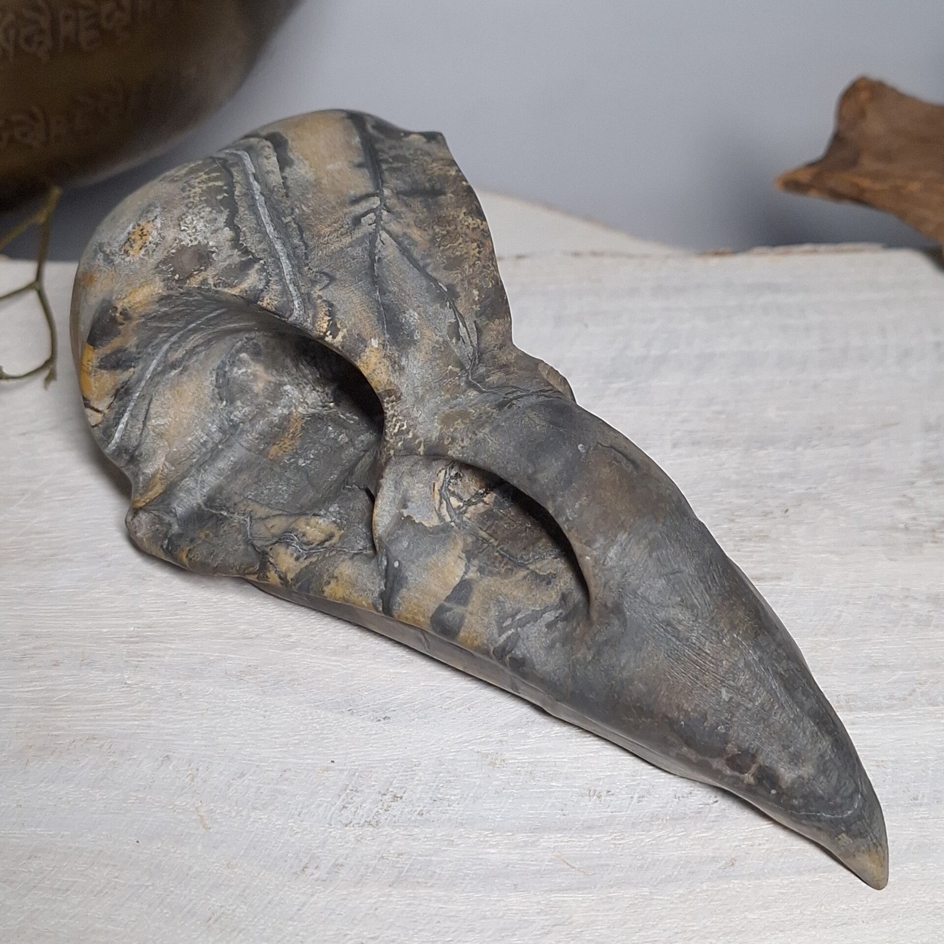 Raven skull van Landschaps, Dendriet Jaspis met een paar bijzondere aders van kwarts. Zeer mooie grote schedel van een Raaf 15,3x7,5 cm