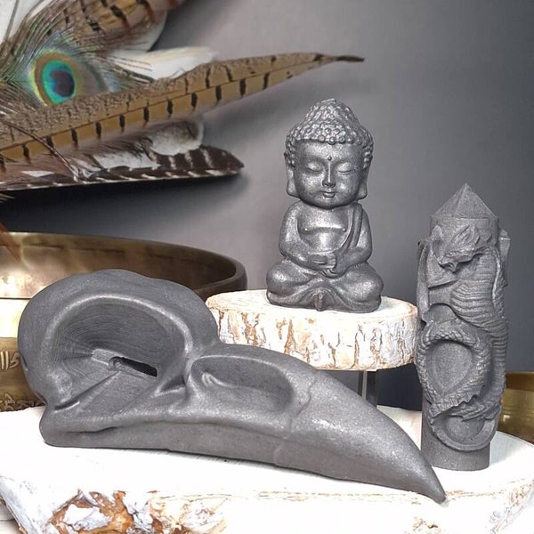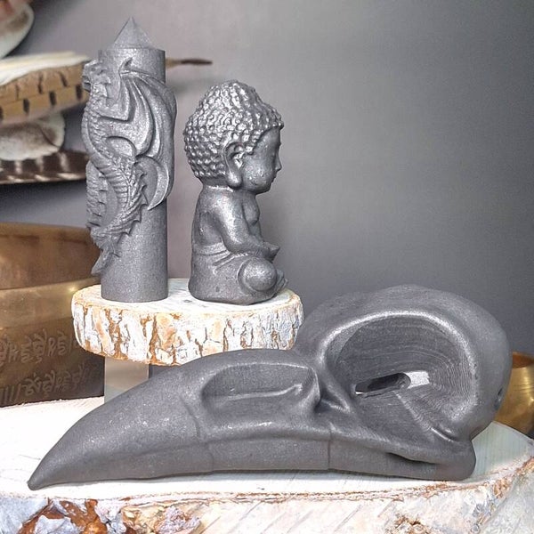 Shungiet. XL set met Boeddha, Raaf en Draak van Shungit uit Rusland