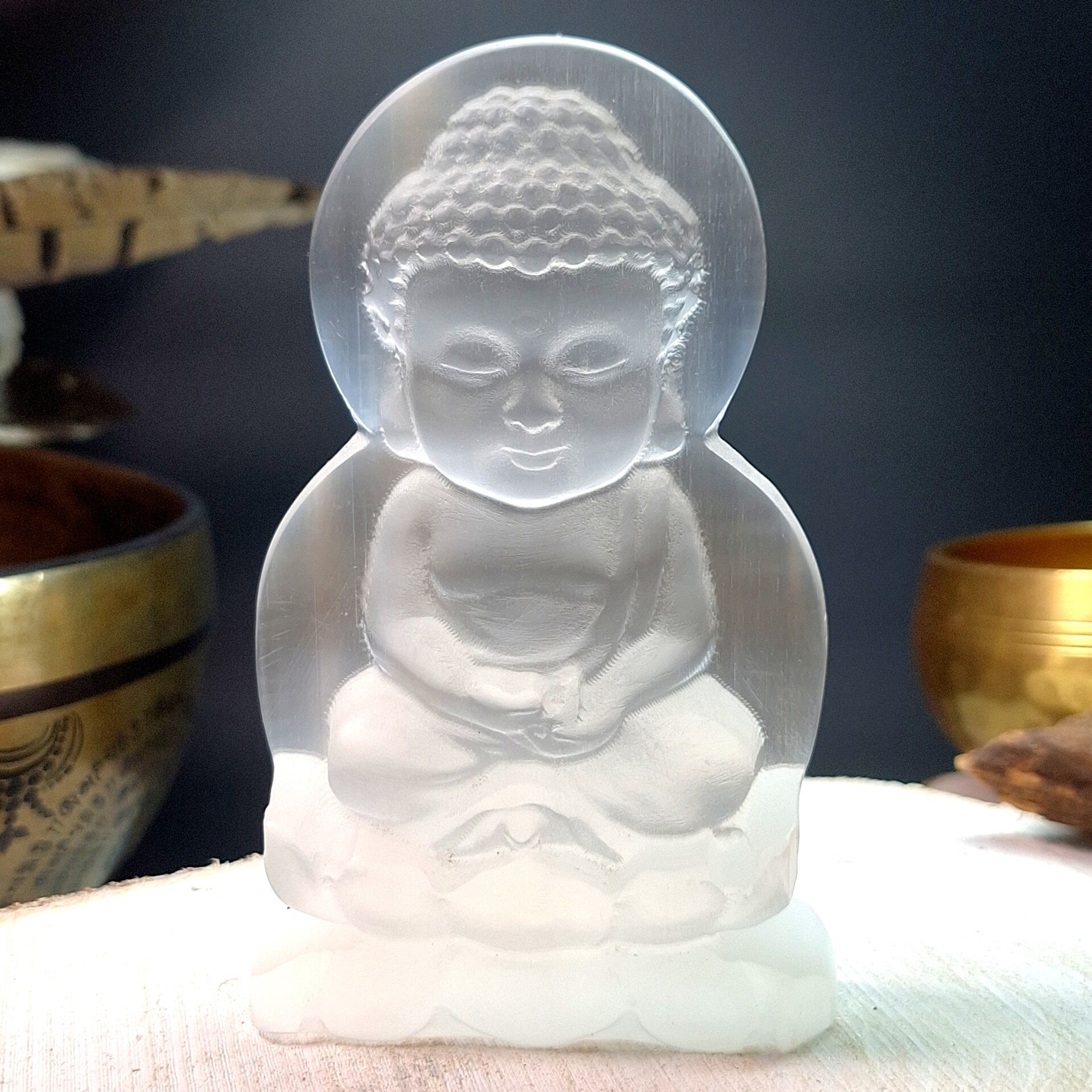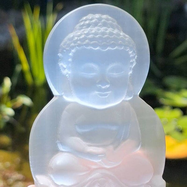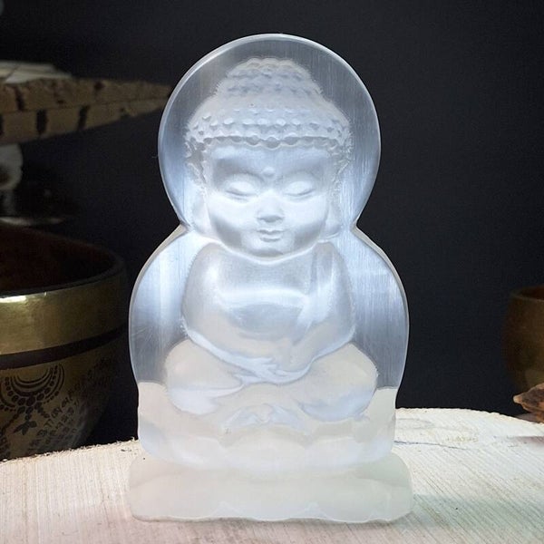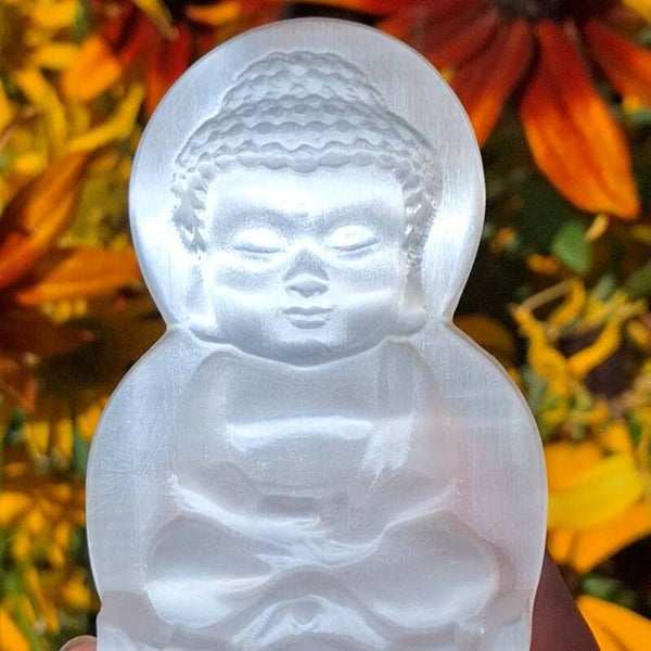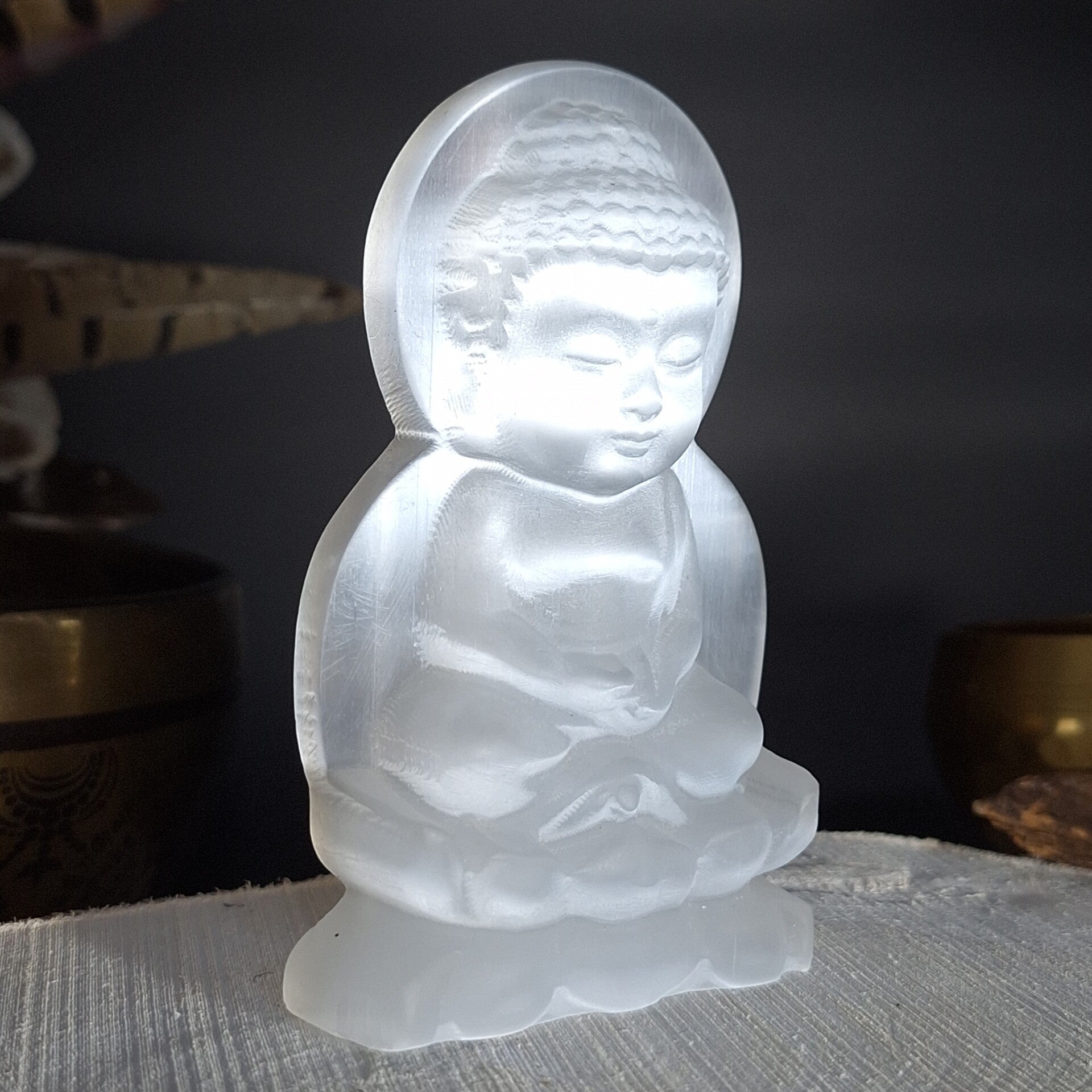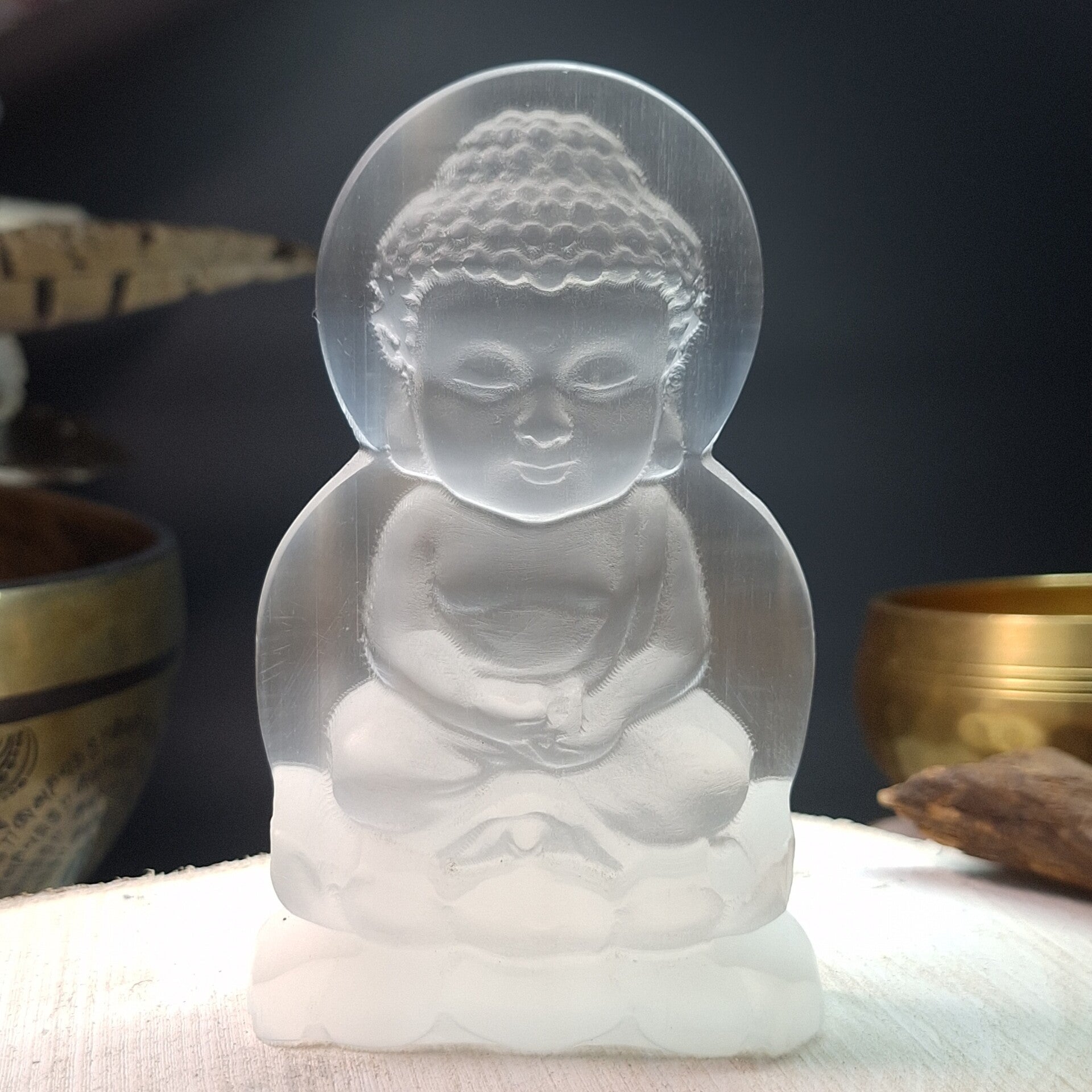 Prachtige Buddha met zachte, liefdevolle energie. Een zeer mooi exemplaar van prachtige kwaliteit satijnspaat/ seleniet 10,5 x 6,5 cm. Je raakt niet uitgekeken op deze magisch mooie Boeddha, Prachtig gedetailleerd beeld met liefdevolle uitstraling en zachte energie. Zeer geschikt als toevoeging op het interieur voor o.a thuis, praktijk, kantoor of salon maar ook zeer geschikt om mee te werken als ondersteuning tijdens ceremonies en healing sessies. Hij heeft een prachtige flash aan alle kanten waardoor het een betovering lijkt als je er naar kijkt. Iedere keer lijkt dit prachtexemplaar weer een beetje te veranderen door de flash die telkens verplaatst. Bekijk ook vooral de video waarin de prachtige "flash" goed zichtbaar is. Het beeld heeft een platte achterkant waardoor het beeld wat dunner is en daardoor doorschijnend is, indien er een lichtbron achter dit beeld wordt geplaatst dan schijnt het licht er heel mooi doorheen, dat geeft echt een magisch mooi effect en lijkt hij ook nog op een sfeerlamp. Seleniet, ook wel engelen steen/ beschermen steen genoemd. Deze kan helpen rust en balans te creëren en zou de aura kunnen reinigen.Seleniet is de engelensteen bij uitstek. De hoge vibratie van deze witte steen brengt oneindige liefde, heling en transformatie. De edelsteen staat in directe verbinding met het lichtlichaam en hogere engelen energie. Het maakt stemt positief door de sterke connectie met de zon. De zon zorgde immers voor het verdampen van de zee waardoor het gesteente ontstond. Verder zorgt het voor een heldere geest en opent het kruin chakra. Verder staat de steen bekend om het brengen van rust en zelfvertrouwen. Als de edelsteen in huis wordt gelegd zal het een beschermend licht netwerk rond het huis weven waardoor een veilige rustige ruimte ontstaat. Zorgt voor betere nachtrust. Helpt positief te denken en zorgt dat trauma’s getransformeerd worden. Helpt bij stress en neemt irritatie door vermoeidheid weg. Seleniet niet reinigen met water.