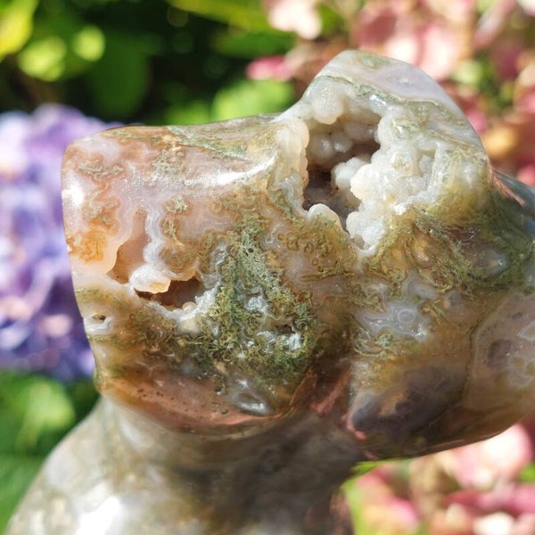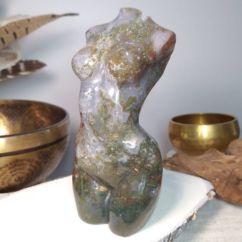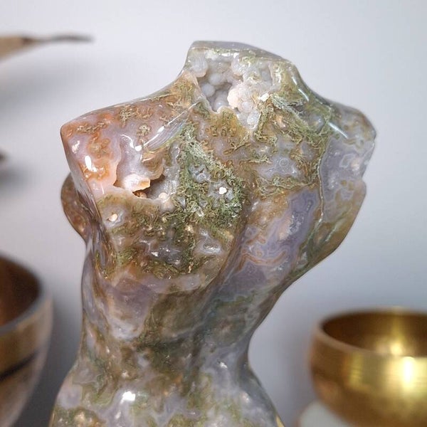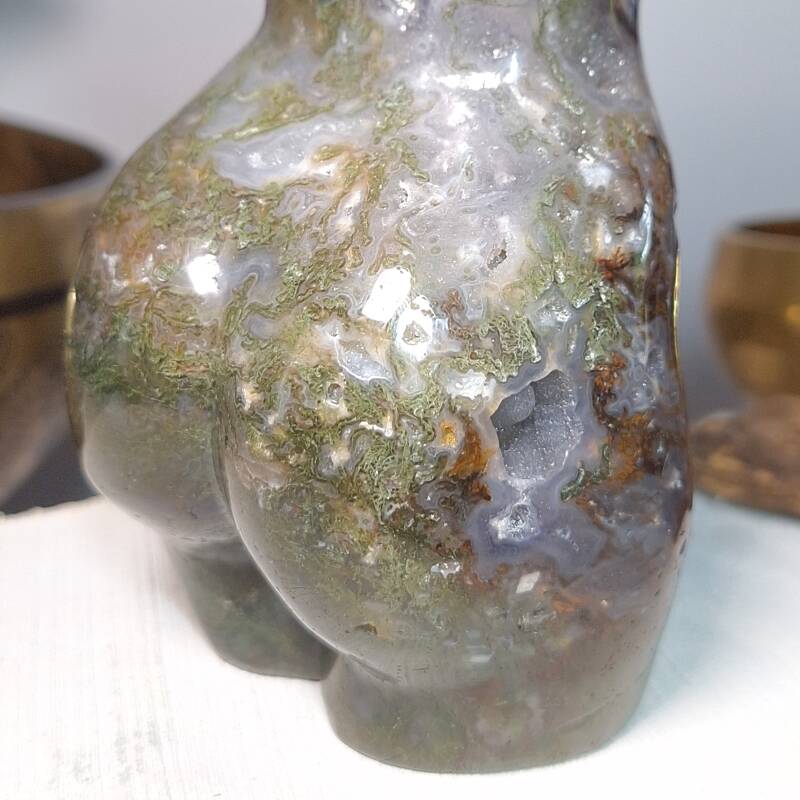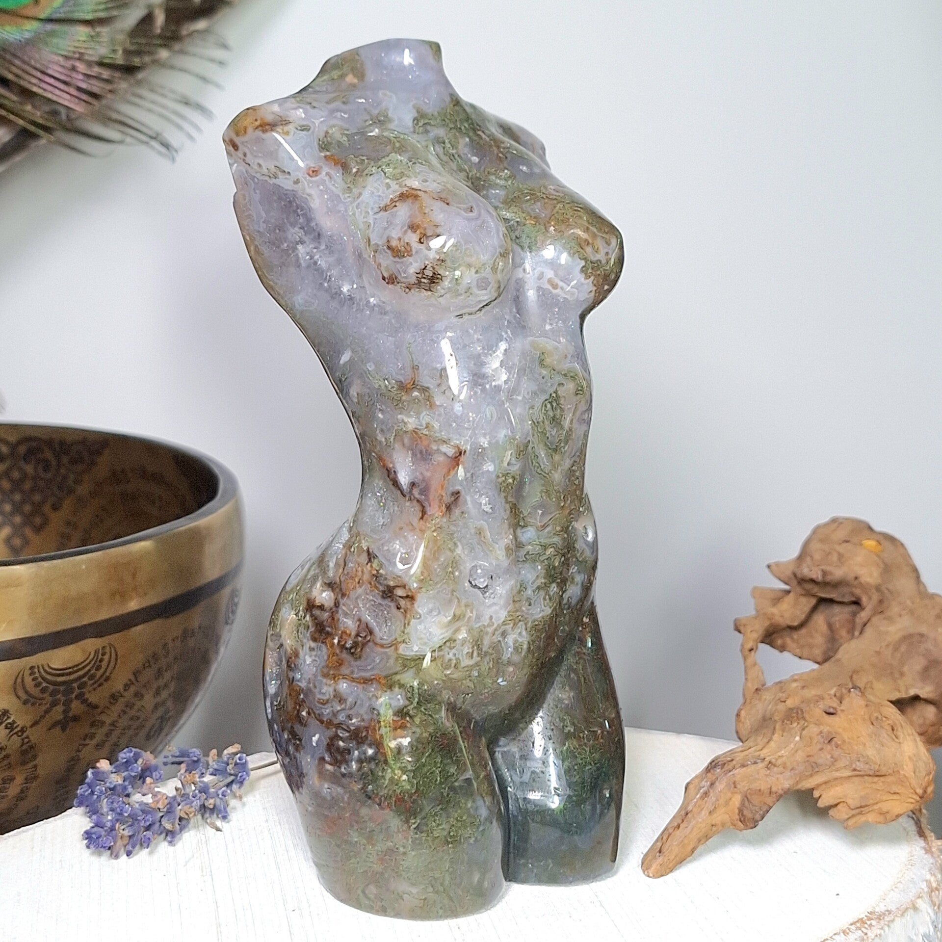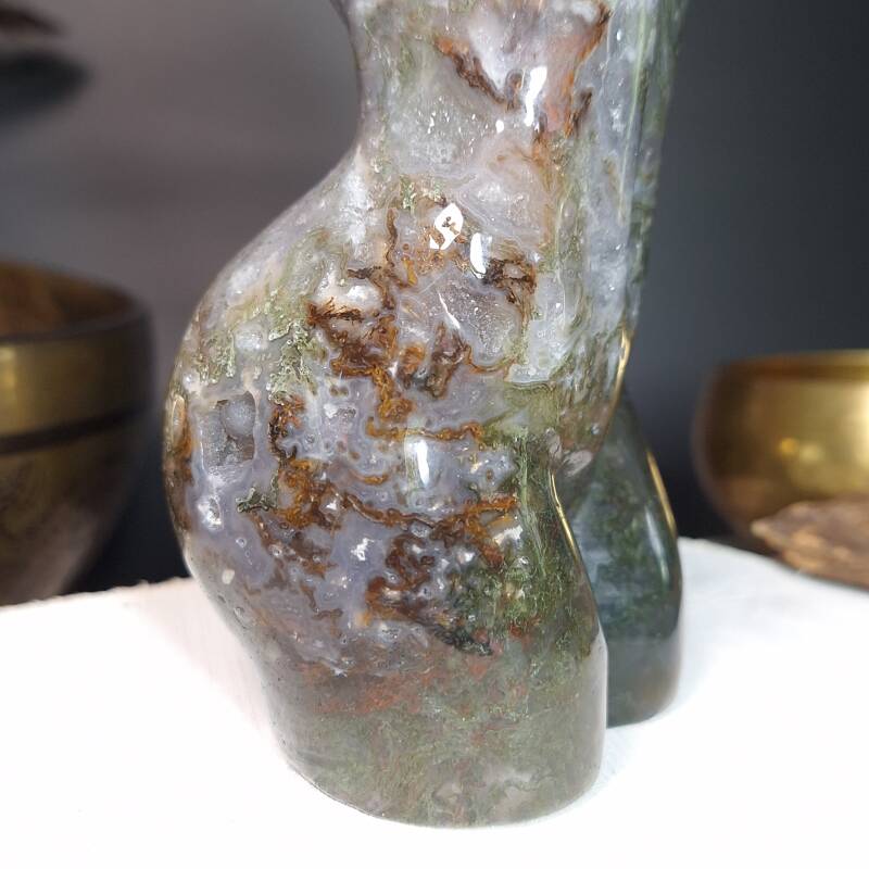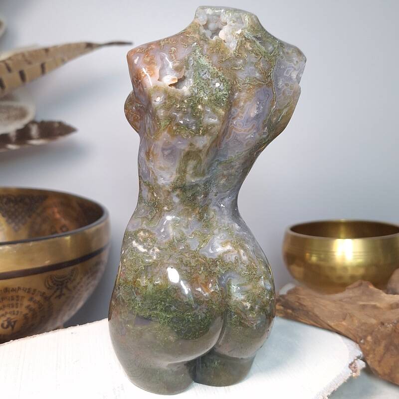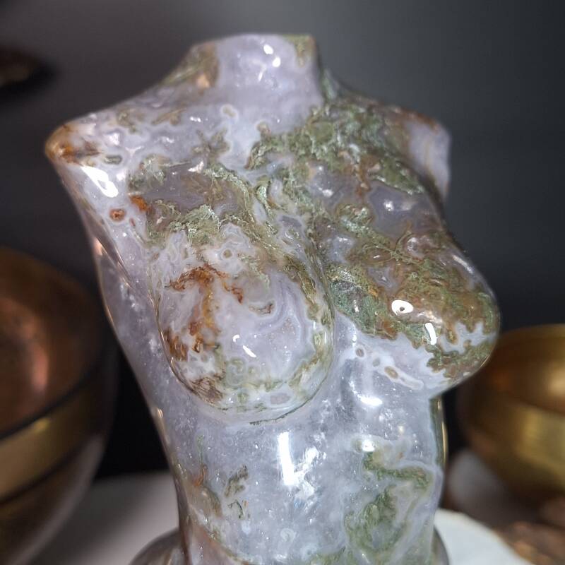 Mosagaat met Botryoïdale Chalcedoon, Carneool en Bergkristal body. Prachtige handgeslepen vrouwen torso van top kwaliteit Mosagaat met Chalcedoon en vele kleine holtes met kristalletjes. Je raakt niet op haar uitgekeken met de vele prachtige patronen om in weg te dromen. Het bijzondere aan deze combinatie "steen" is wel de Botryoïdale groeivorm van Chalcedoon in de holtes in de hals, de schouder en de zijkant van de bil. De torso is maar liefst 15,5cm en 800 gram. De body straalt enorm veel rust, liefde en kracht uit en werkt zeer aardend, echt een aanwinst voor iedere ruimte. Bekijk de video van deze prachtig vrouwen torso onderaan deze pagina.
