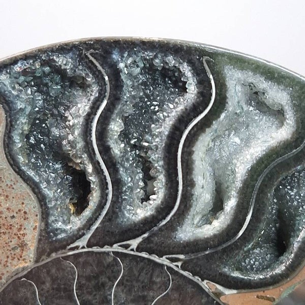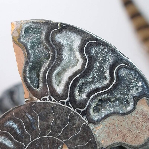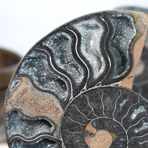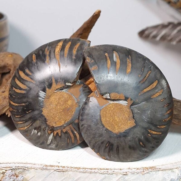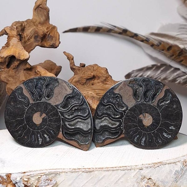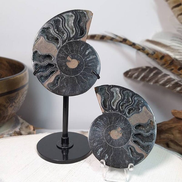 Prachtig Ammonieten paar uit Madagaskar. Heeft mooie kamers met "druzy"kristallen. Ze zijn ieders 8cm lang. In metalen zwarte standaard 14,5cm, deze is er eventueel bij te bestellen.