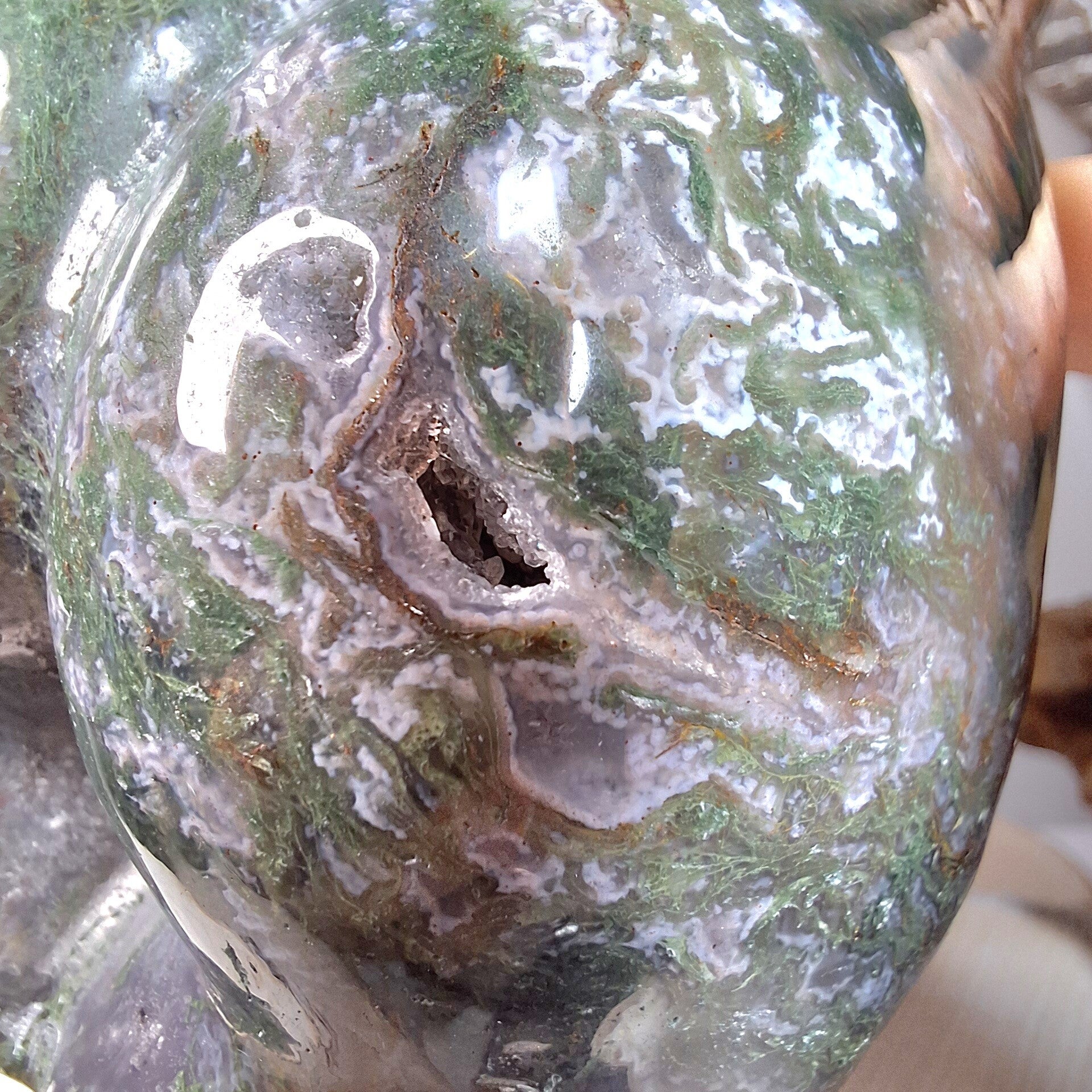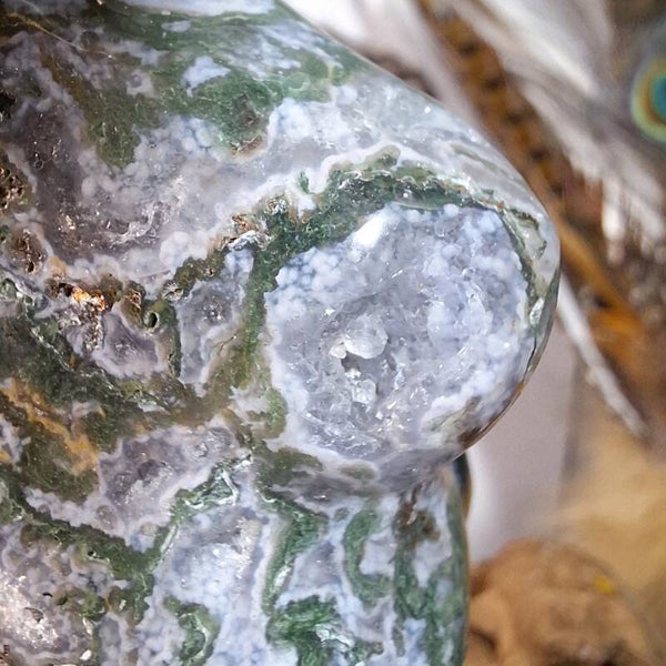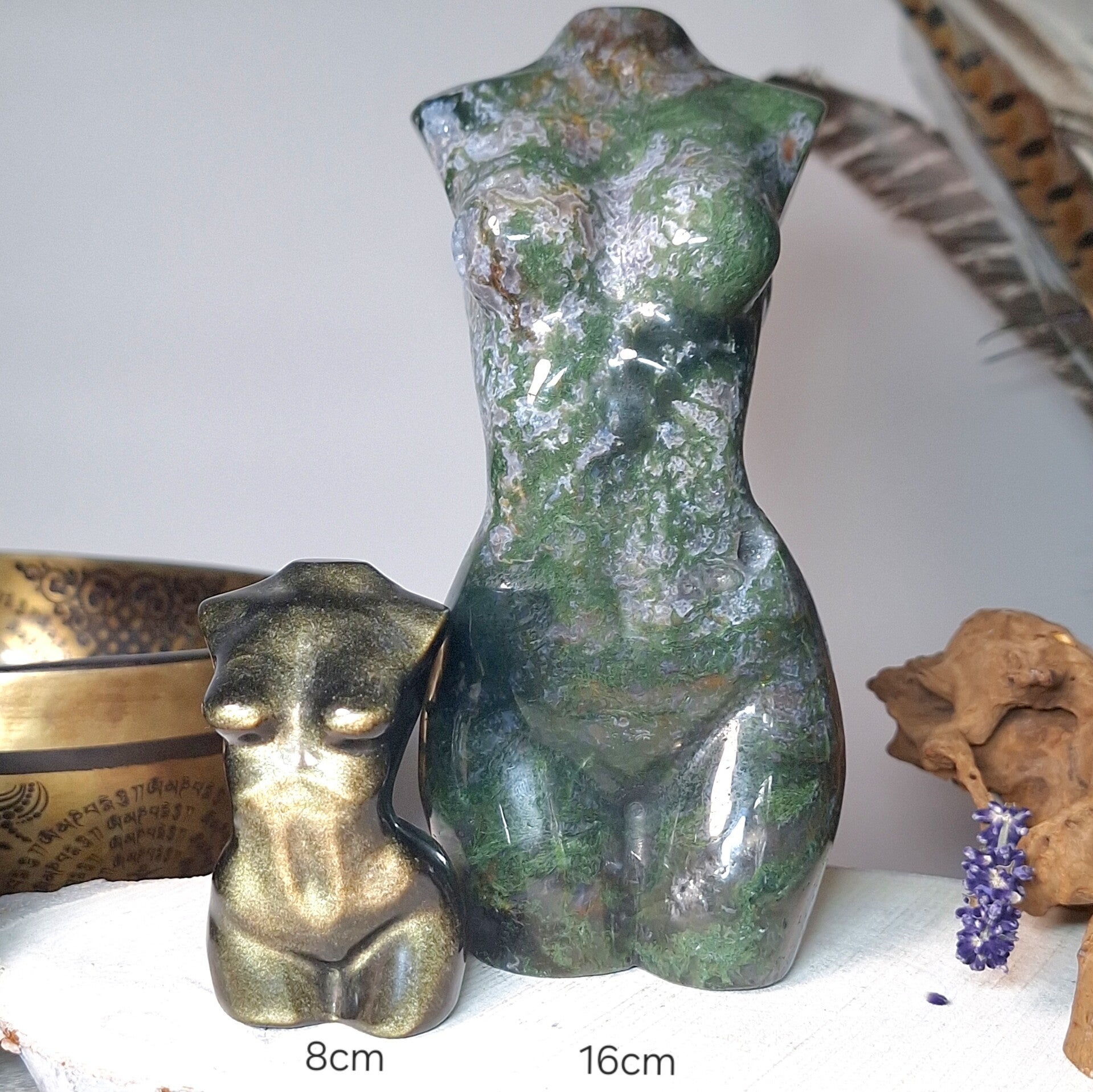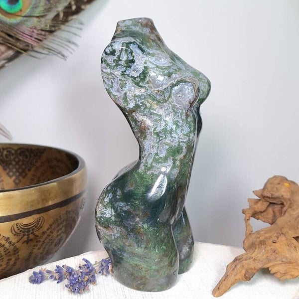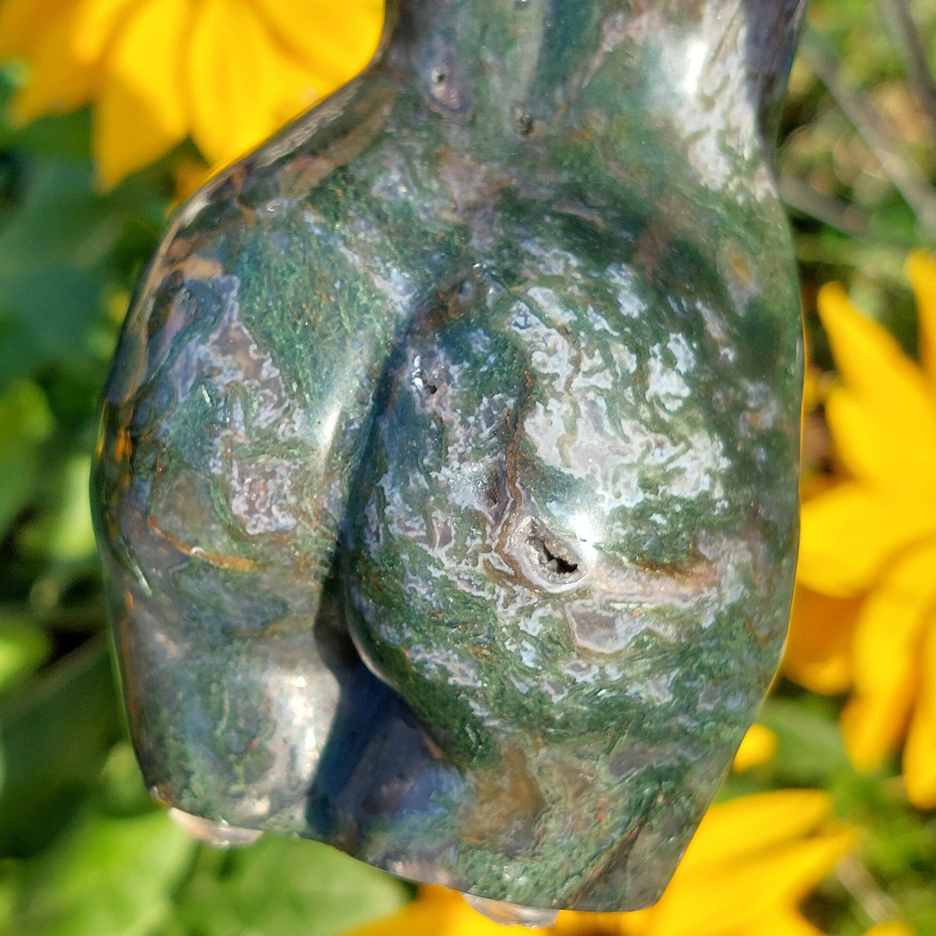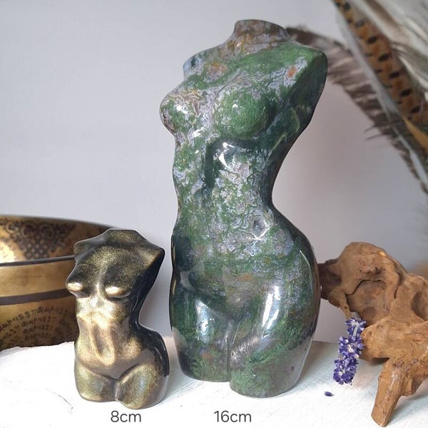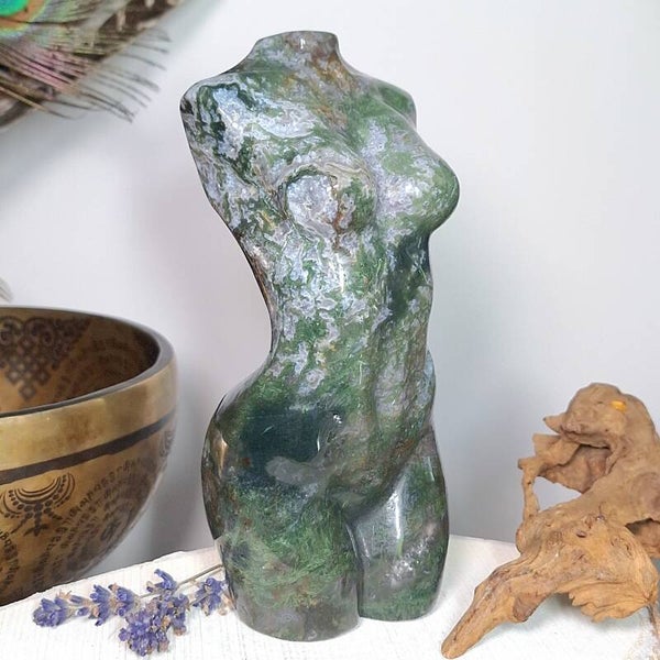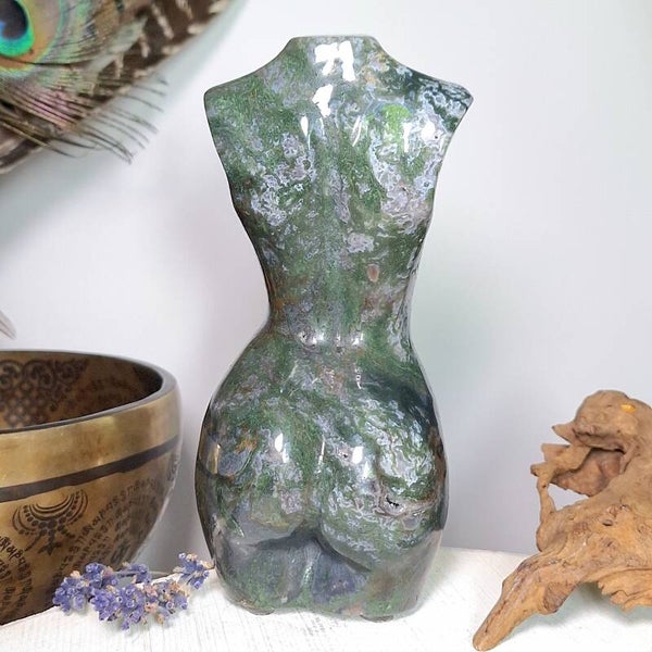 Mosagaat body. Geweldig mooie kunst uit de natuur ♡ Unieke handgeslepen vrouwen torso van prachtige kwaliteit Mosagaat met hier en daar kleine geodes met kwarts kristalletjes. Ze heeft prachtige patronen om in weg te dromen, telkens zie je weer wat anders in deze torso, de patronen zijn echt magisch mooi. De torso is maar liefst 16cm en 810 gram. De Mosagaat is van navel tot onderkant donkergroen van kleur en heeft prachtige mosachtige patronen, bovenkant van de body is lichter van kleur en bevat ook Kwarts en Chalcedoon. De rechterborst heeft een kleine geode en daar zijn prachtige bergkristalletjes te zien, verder zijn er op de rest van deze schoonheid nog meerdere natuurlijke kleine holtes met sprankelende kristallen. De body straalt enorm veel rust, liefde en kracht uit en werkt zeer aardend, echt een aanwinst voor iedere ruimte. De body is afgeprijst omdat de onderkant van de carving iets te schuin is geslepen waardoor deze wat schuin staat en daardoor makkelijk naar achteren kan vallen. Om dit te voorkomen hebben we dunne transparante stootdopjes op de bodem geplakt. Deze zijn niet zichtbaar als de body rechtop staat. Door de dopjes staat ze stevig en valt ze niet om. De dopjes kunnen ook makkelijk verwijdert worden als je haar liever zonder dopjes wil neerzetten.