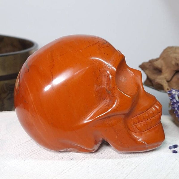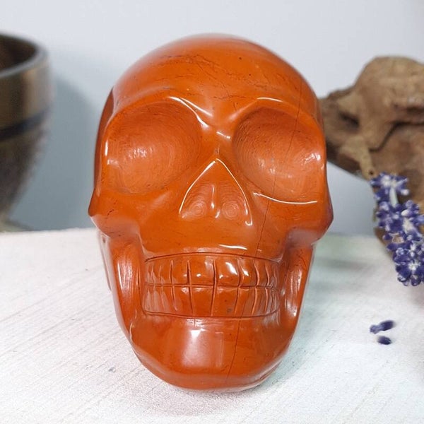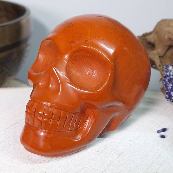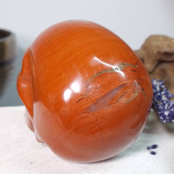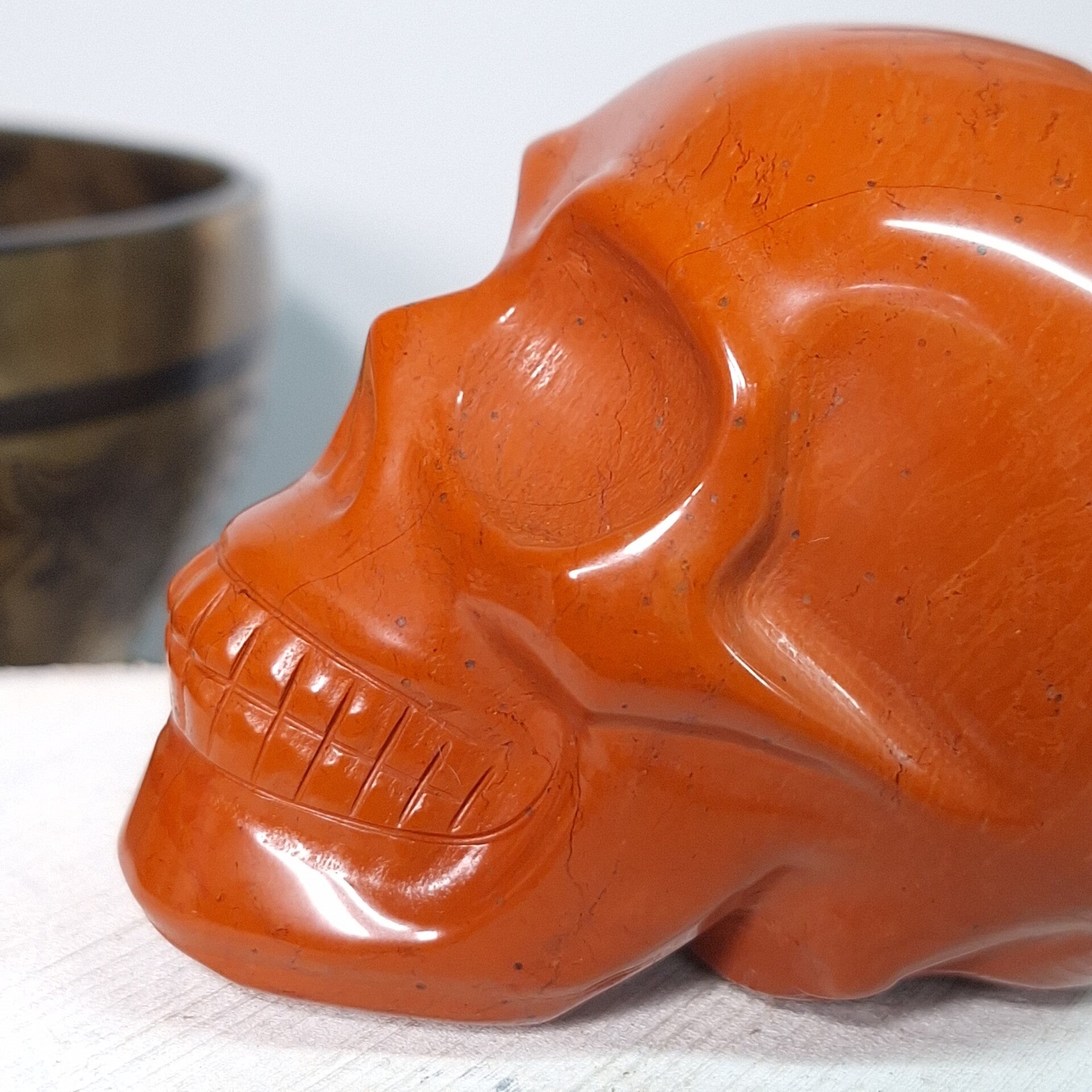 Rode Jaspis Kull van hele mooie kwaliteit. De schedel is van groot formaat en 500 gram en 9,4 cm. Prachtig exemplaar met unieke patronen en een heerlijke energie.