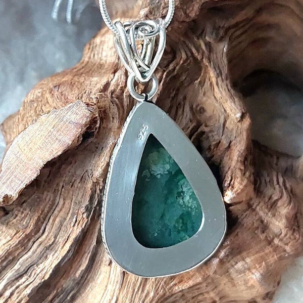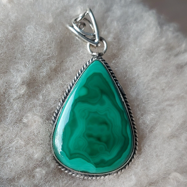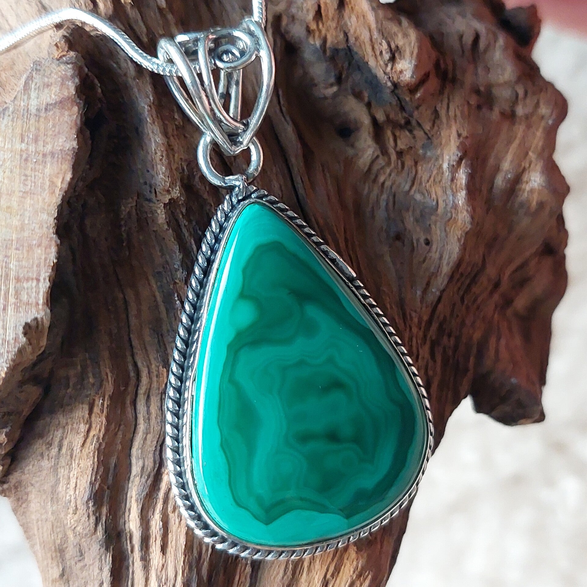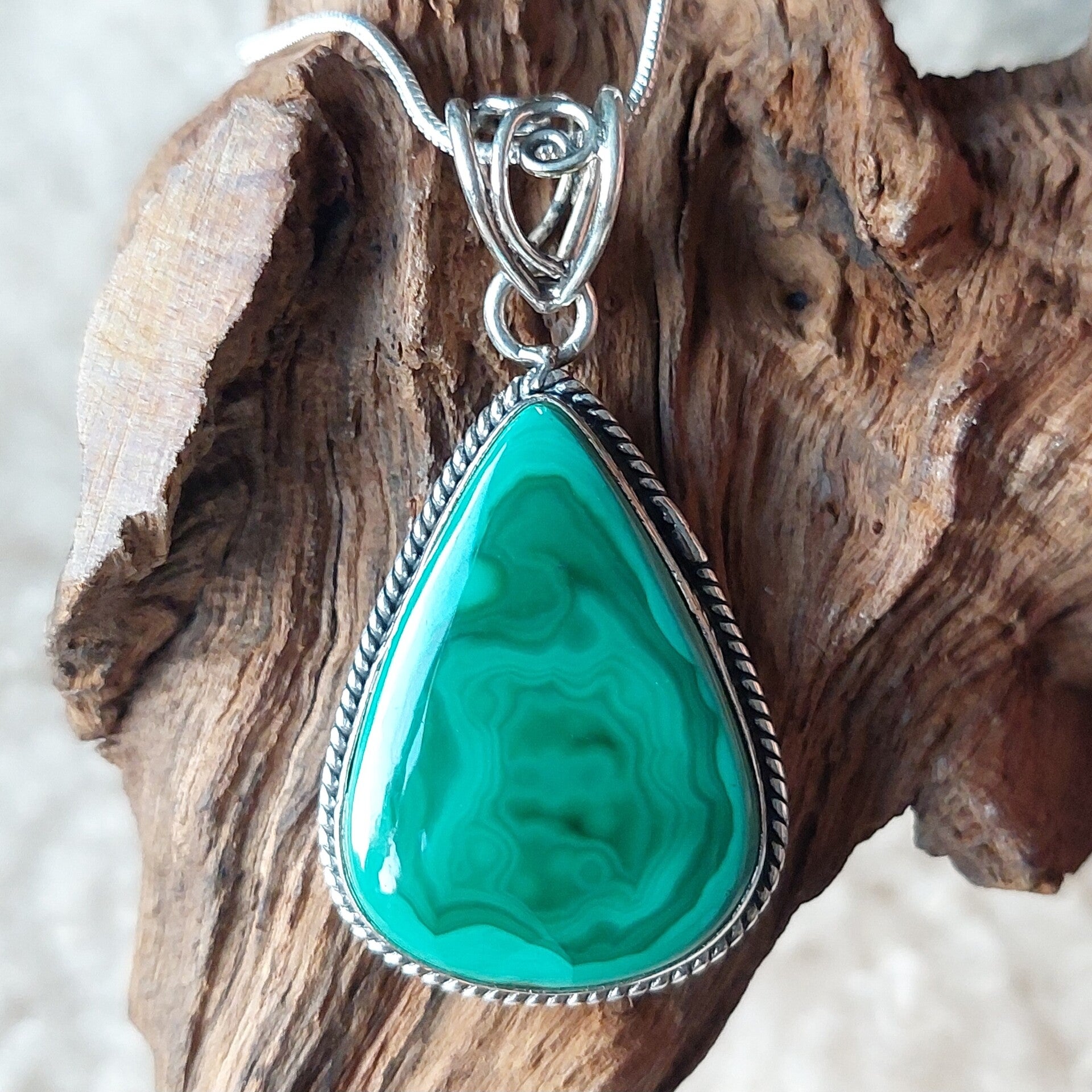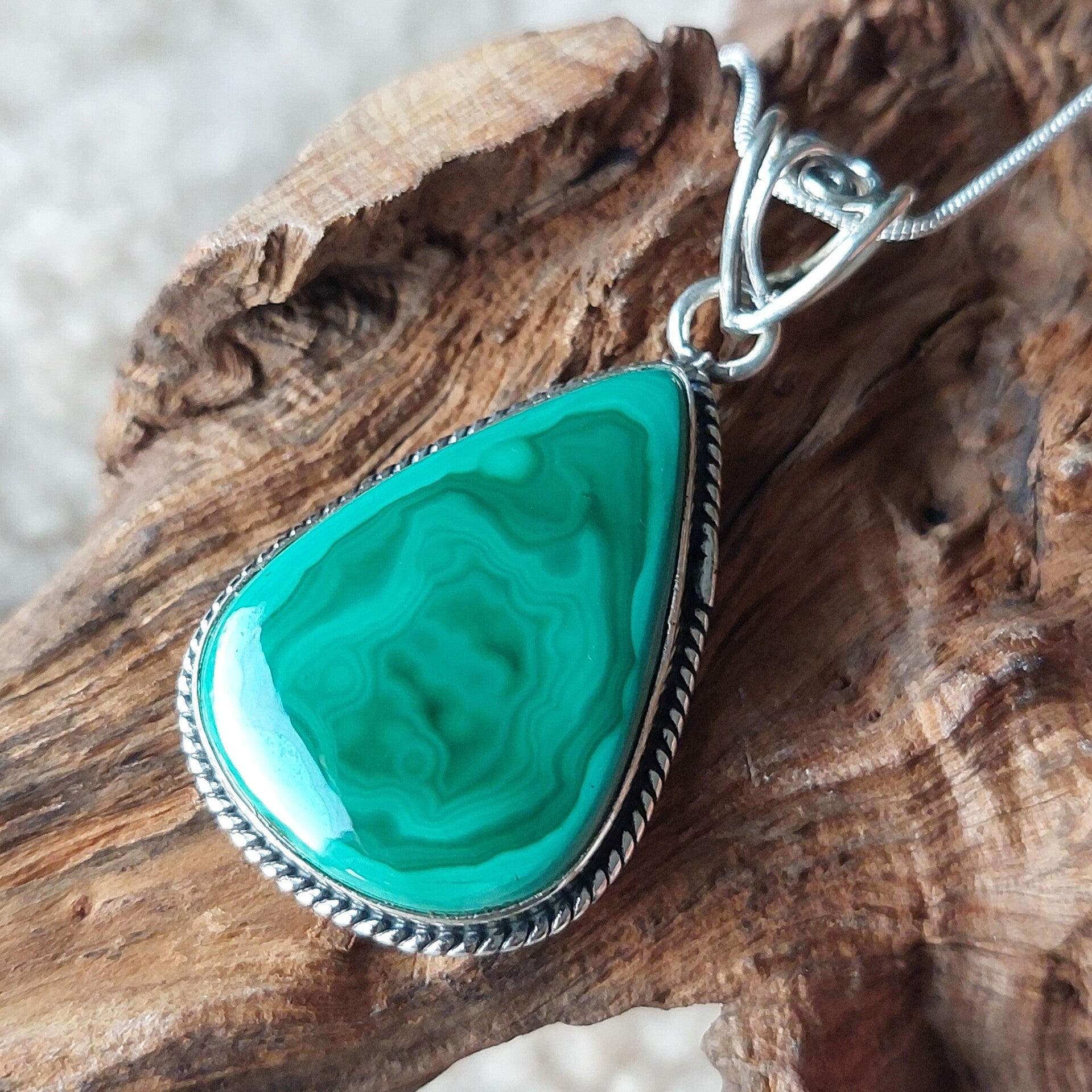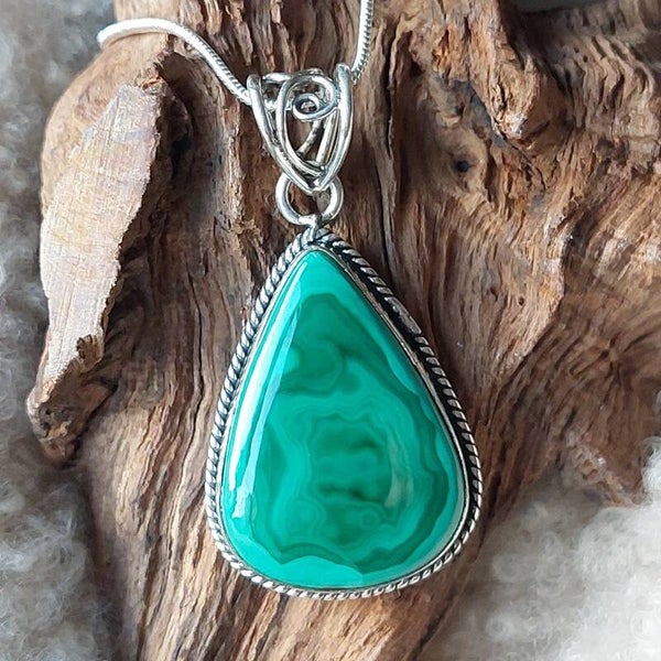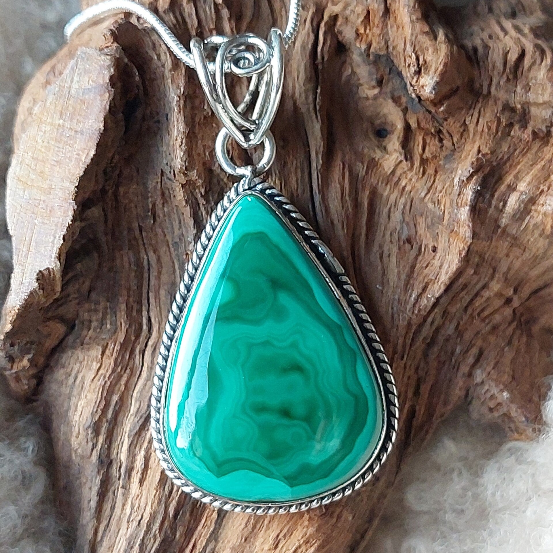 Zeer mooie 925 zilveren hanger van Malachiet. Fantastische mooie zachte kleuren en patronen, groot formaat van 5x2,5cm, heeft prachtige handgemaakte setting met mooie details. Deze hanger wordt geleverd met ketting, Herkimer diamantje en cadeauverpakking in sieradendoosje.