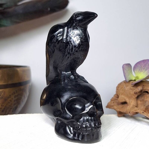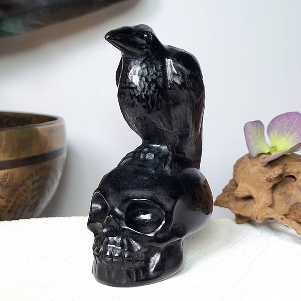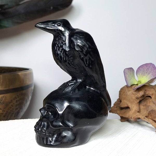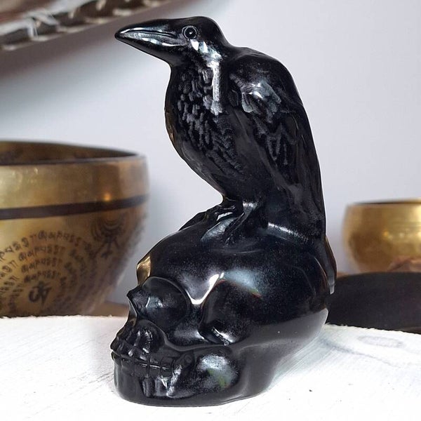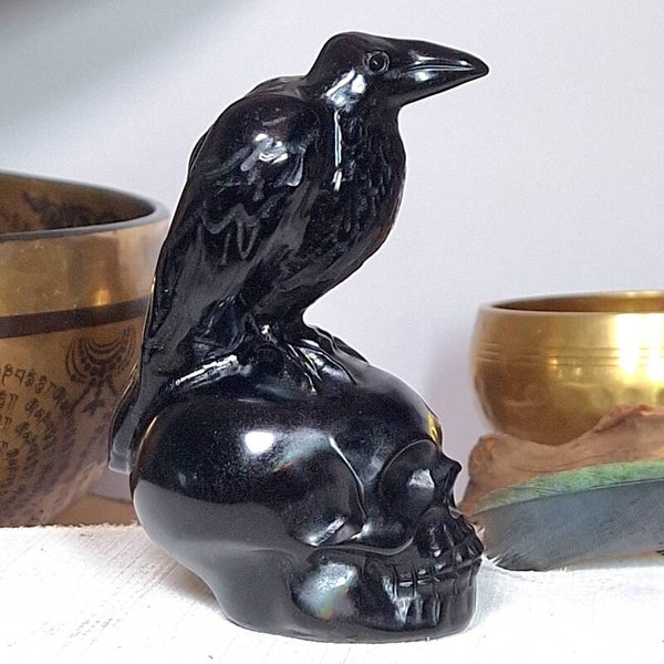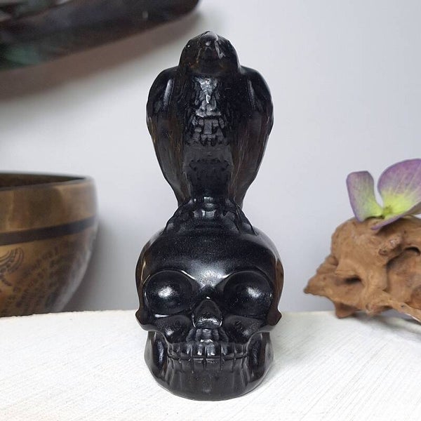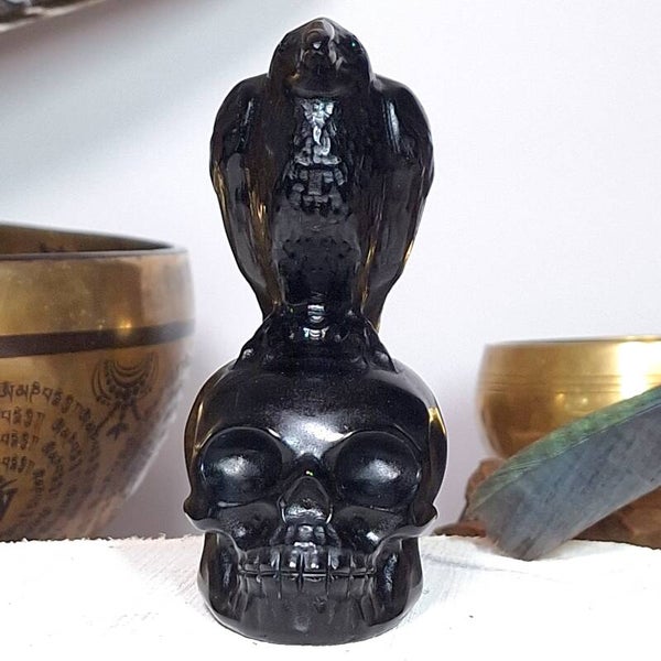 Obsidiaan Schedel. Skull met kraai / raaf.