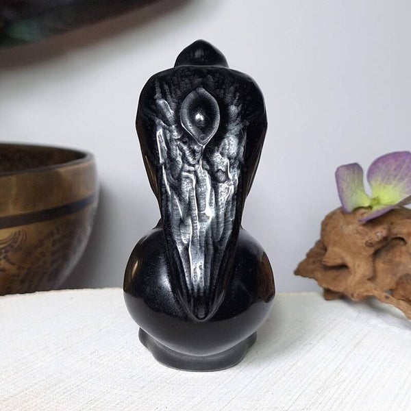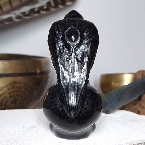 Crystal skull met Kraai / Raaf van 10x6,6cm. Prachtige grote carving van zwarte Obsidiaan. Handgeslepen bijzondere schedel. De vogel op de skull kan zowel een kraai als raaf voorstellen. Past de kraai of de raaf beter bij jou? Lees de spirituele betekenis van deze prachtige, mysterieuze vogels hieronder. Achterop de rug van de kraai / raaf is een oog gegraveerd, deze staat symbool voor het weren van het kwaad. Een prachtig beschermende carving die een ware aanwinst zal zijn voor het interieur en ook goed in te zetten is tijdens meditatie, ceremonies en healing sessies.
