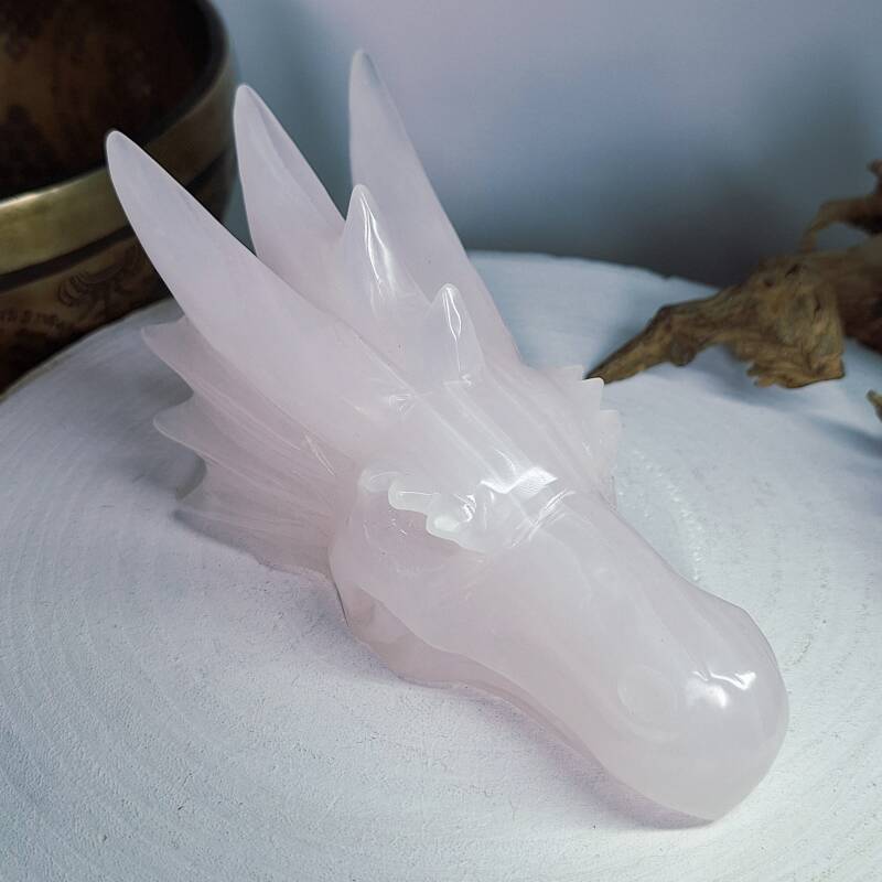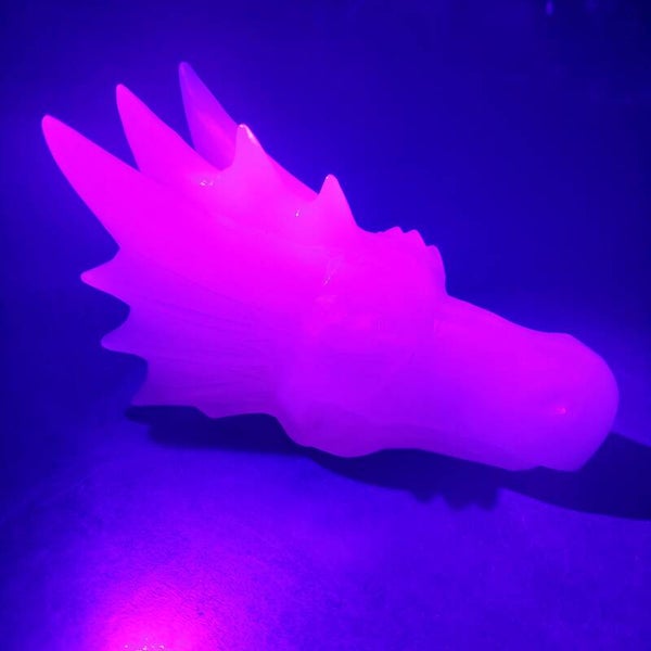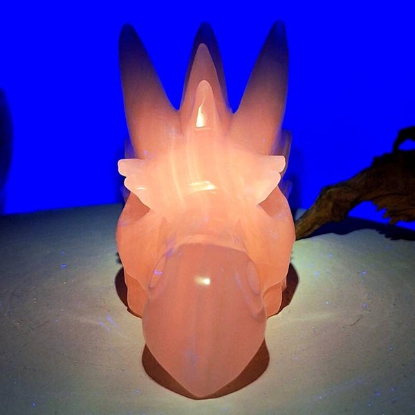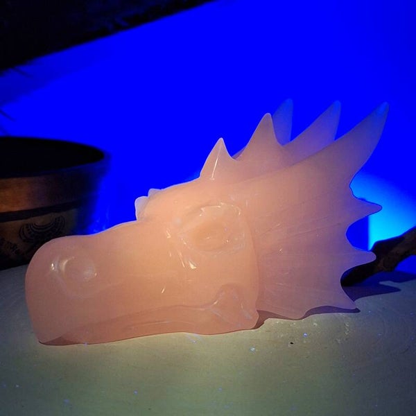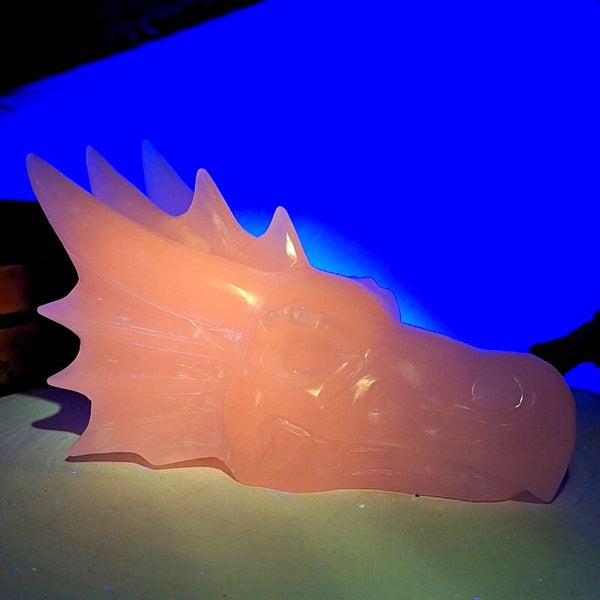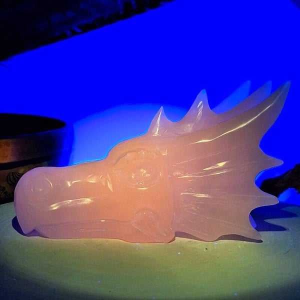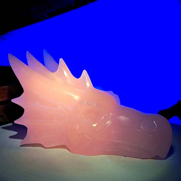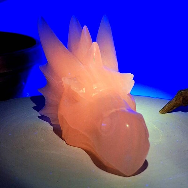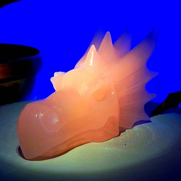 Natuurlijk fluoriserend fel roze wordt deze zacht roze draak als er een 395nm uv lampje op wordt geschenen. Bij 365nm licht kleurt deze Dragon skull oranje. Deze UV reactie is 1 van de eigenshappen van Mangano Calciet en dat geeft een "magisch" mooi effect, ook heeft ze prachtige fijne zachtroze streepjes over het gehele hoofd wat typerend is voor Mangano Calciet. De uitstraling en energie is zeer liefdevol en zacht.