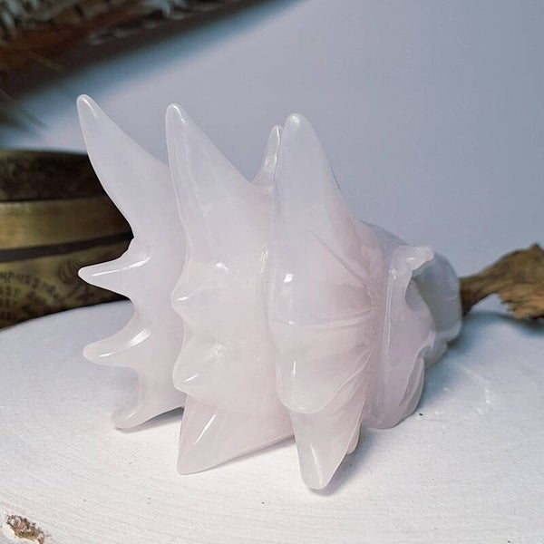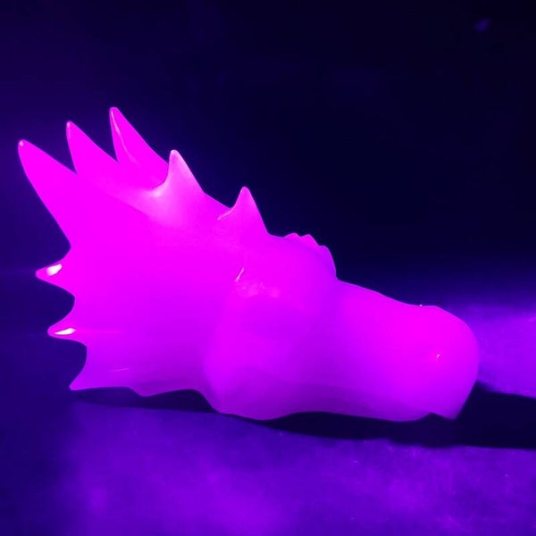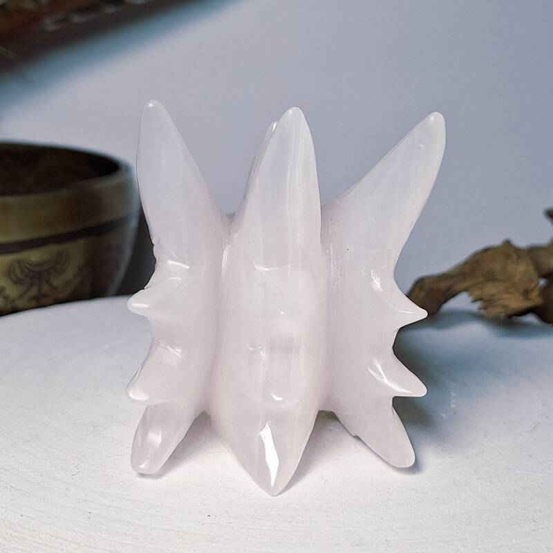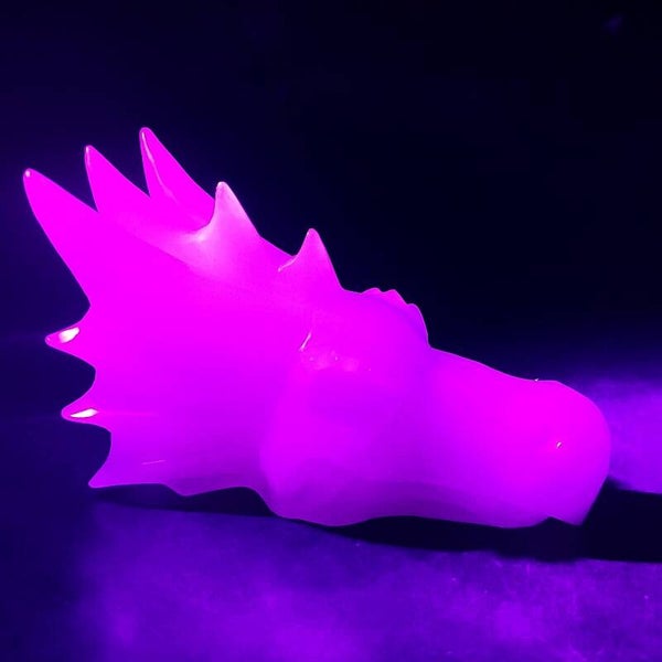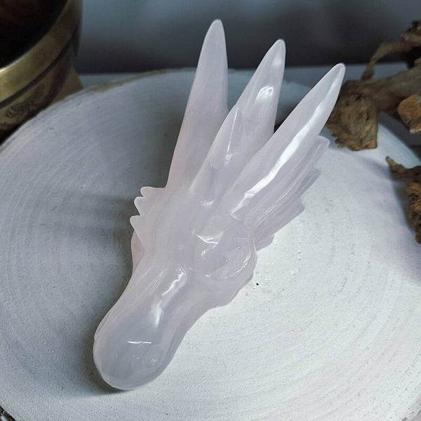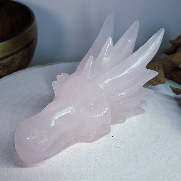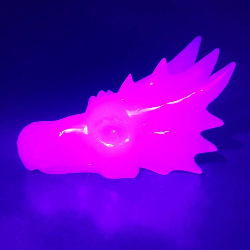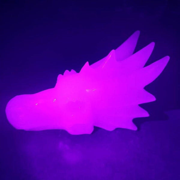 Natuurlijk fluoriserend fel roze wordt deze zacht roze draak als er een 395nm uv lampje op wordt geschenen. Bij 365nm licht kleurt deze Dragon skull oranje. Deze UV reactie is 1 van de eigenshappen van Mangano Calciet en dat geeft een "magisch" mooi effect, ook heeft ze prachtige fijne zachtroze streepjes over het gehele hoofd wat typerend is voor Mangano Calciet. De uitstraling en energie is zeer liefdevol en zacht.