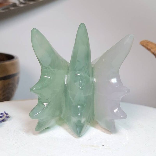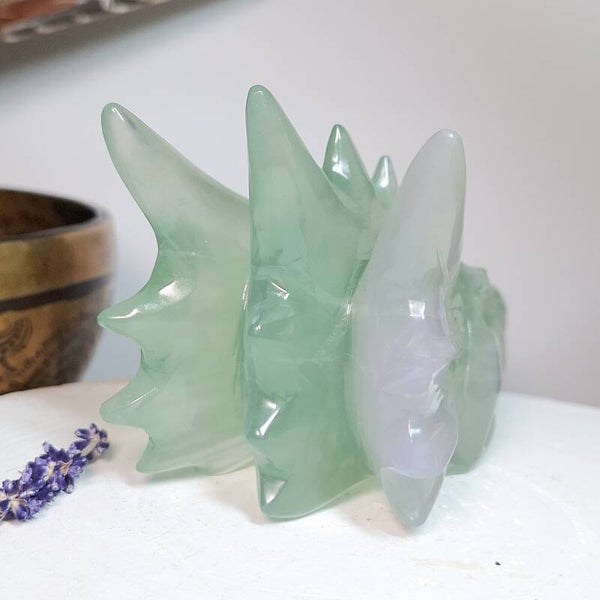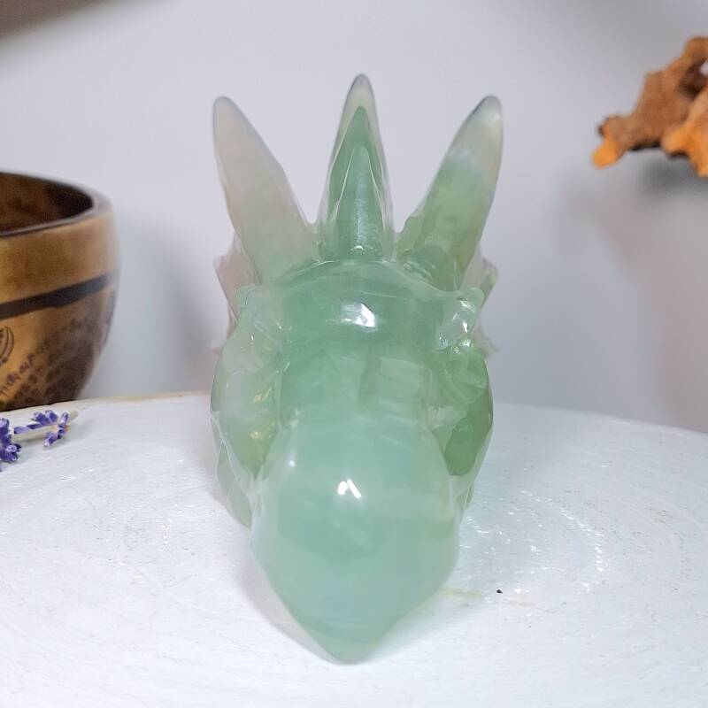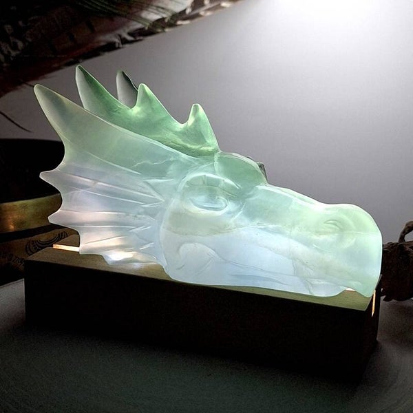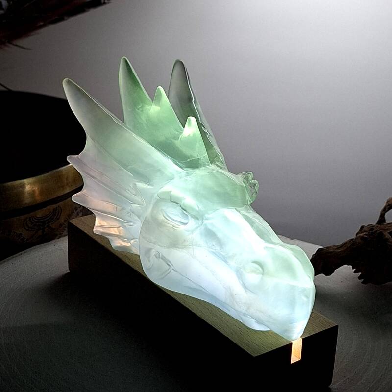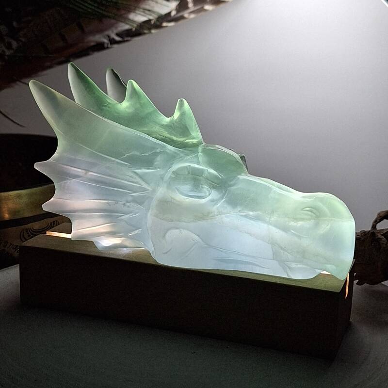 De Draak kan ook op een lampje worden gezet zoals op de foto te zien is. Doordat de Fluoriet mooi helder is kan het licht er goed doorheen schijnen, dit geeft een prachtig effect. Een schat van Moeder Aarde met enorm veel mogelijkheden♡