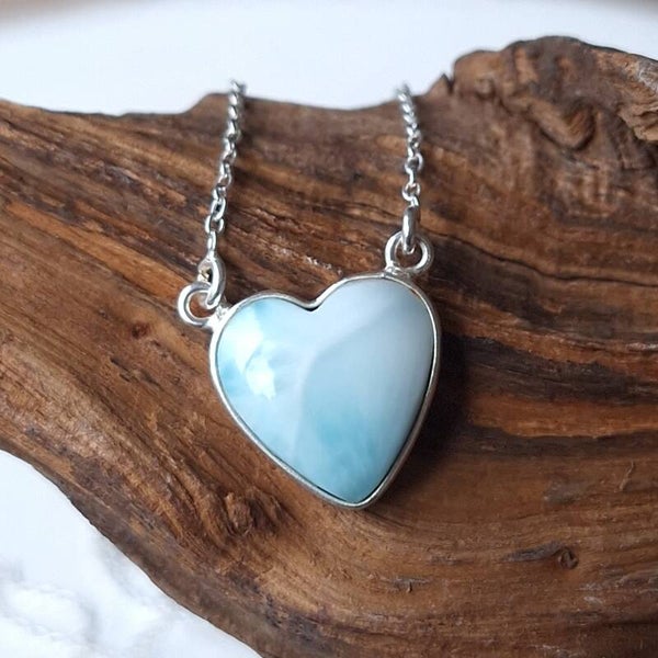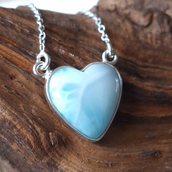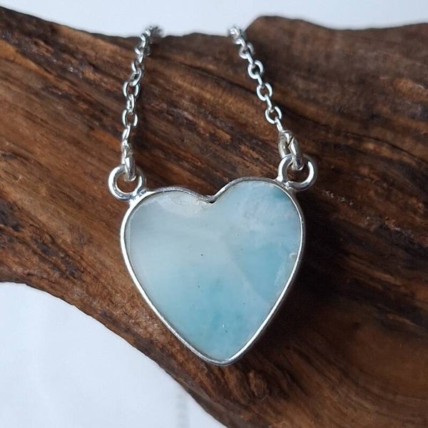 Larimar ketting / hanger. Prachtige 925 zilveren hartvormige hanger van prachtige Larimar steen uit Dominicaanse republiek. De hanger is inclusief 925 zilveren ketting die vast zit aan de hanger. Een prachtig exclusief en uniek sieraad. Formaat hart is 1,6 cm.
